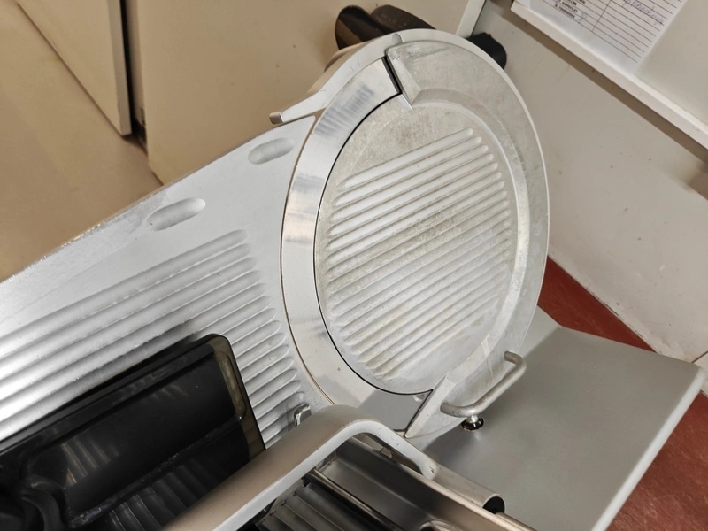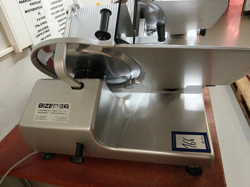 Bizerba slicer, type: SE 12, 230 V, 1 Ph, 50 Hz, 1.79 A, dimensions: 750 mm x 600 mm x 450 mm.