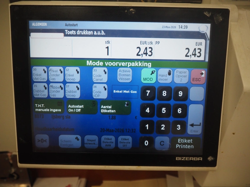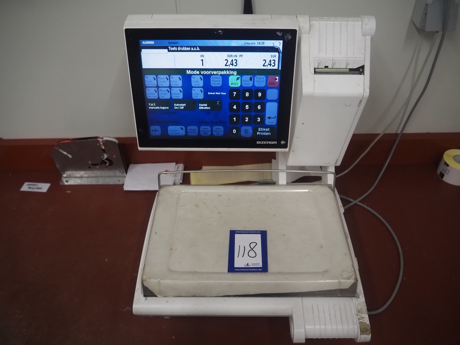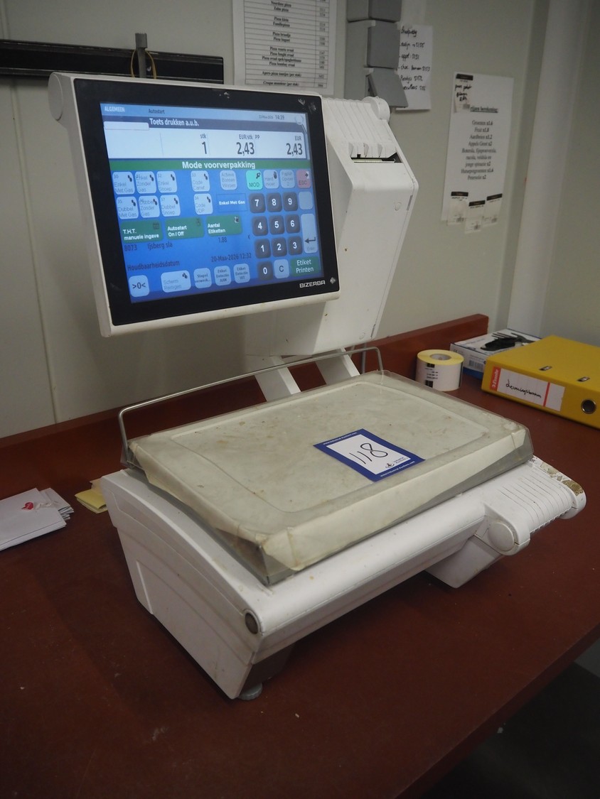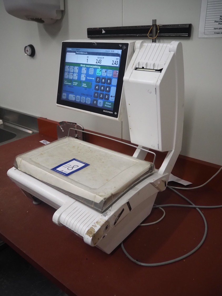 Bizerba weighing scale with label printer, type: KH II 800, serial number: 11613932, maximum weight: 6/15 kg, minimum weight: 40 g, e= 2/5 g, T= -6/15 kg, dimensions: 500 mm x 450 mm x 550 mm.