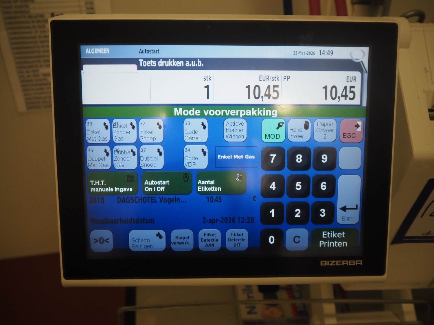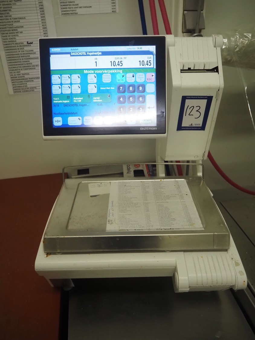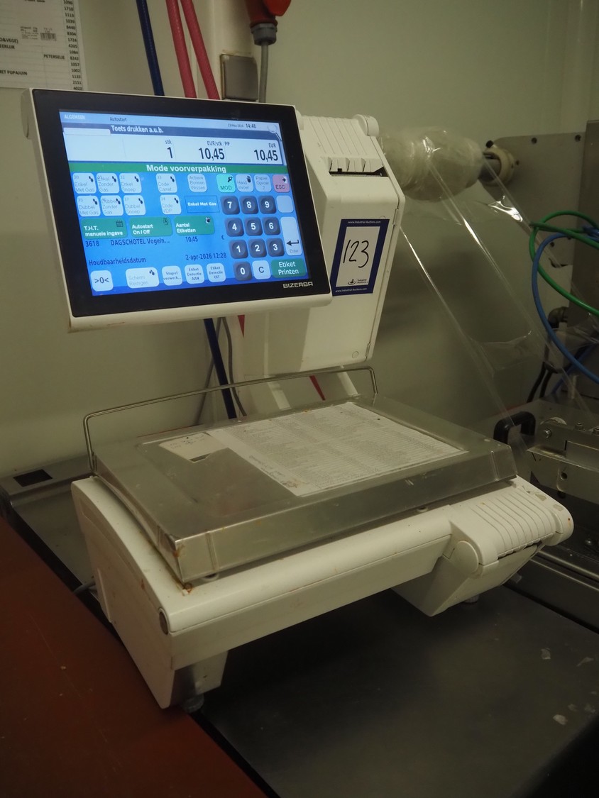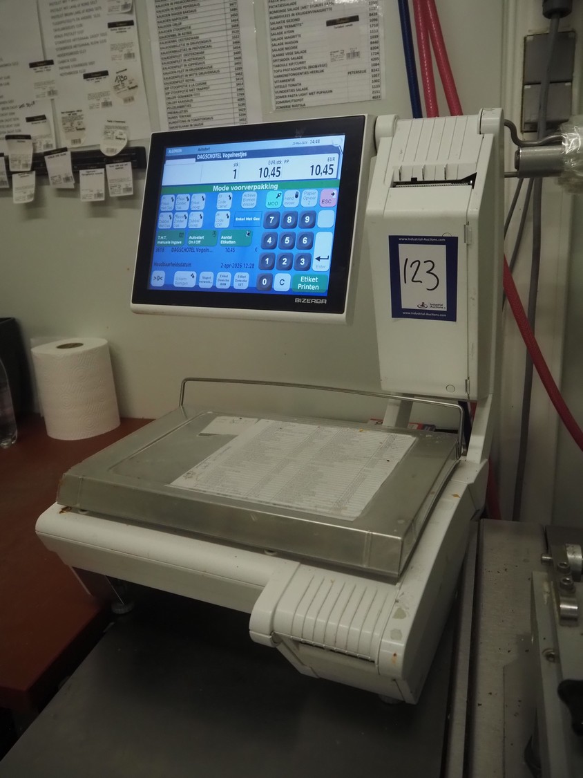 Bizerba weighing scale with label printer, type: KH II 800, serial number: 11613929, maximum weight: 6/15 kg, minimum weight: 40 g, e= 2/5 g, T= -6/15 kg, dimensions: 500 mm x 450 mm x 550 mm.