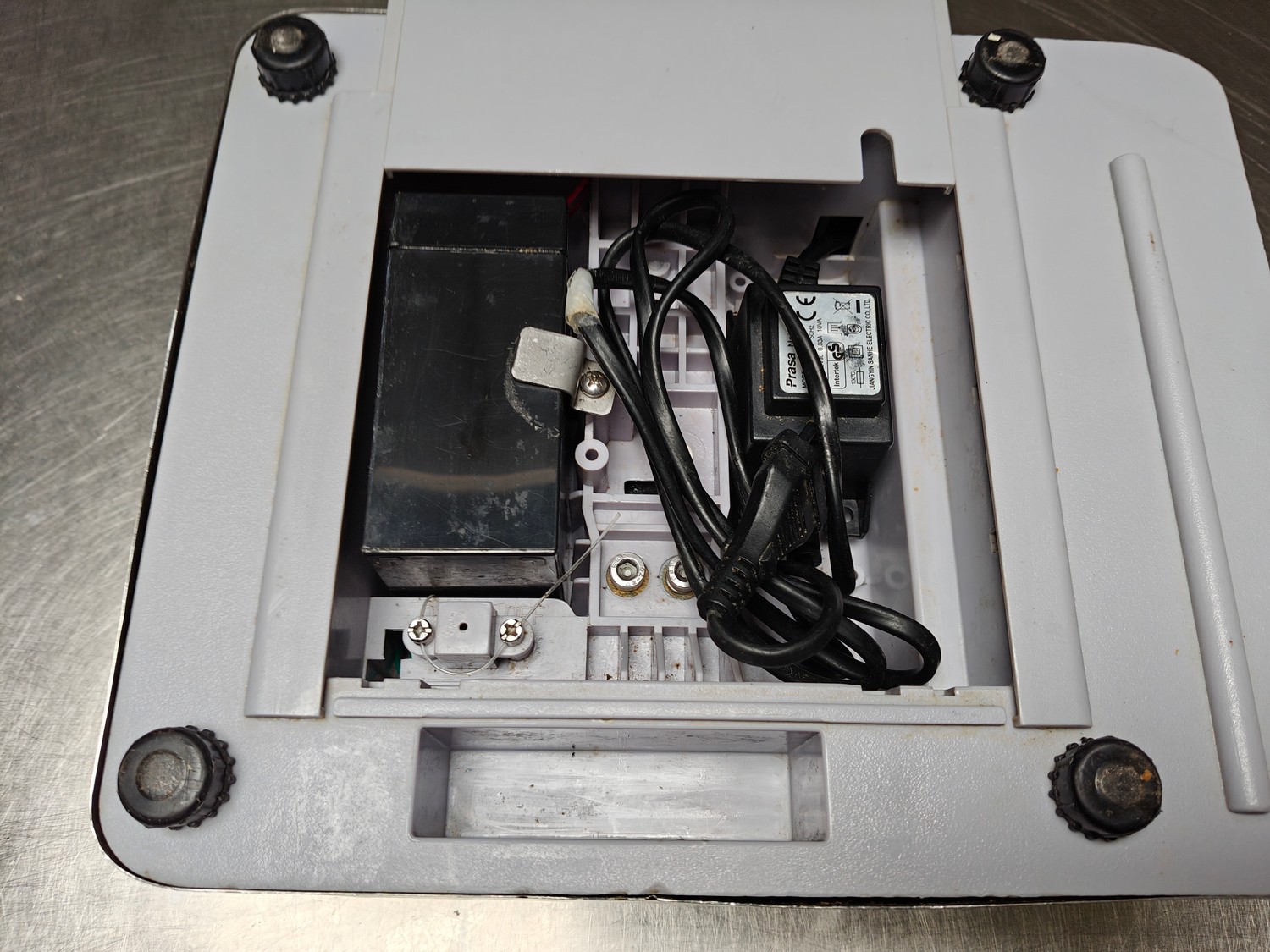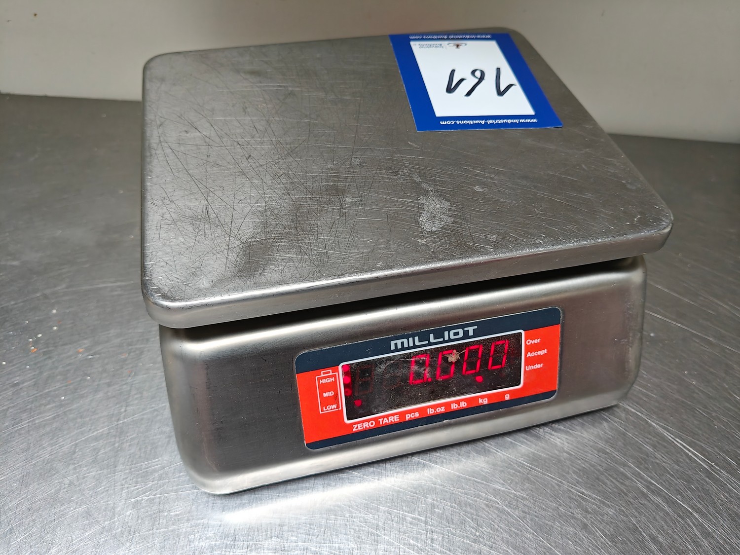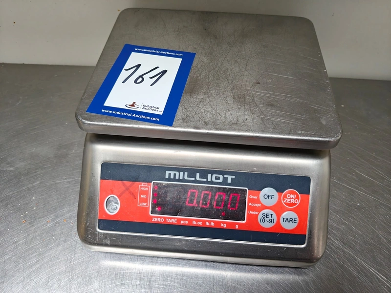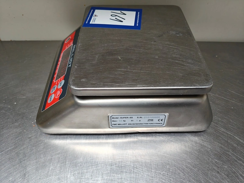 Milliot scale, model: SUPER-SS, serial number: 210100929, max: 15 kg , d= 1 gram, 230 volt , 1 Ph, dimensions: 230 mm x 300 mm x 110 mm. Including battery.