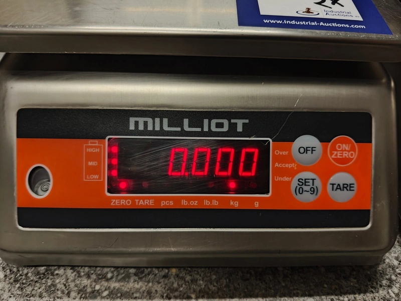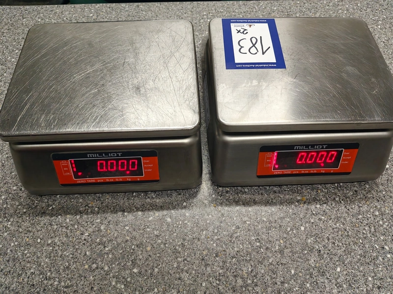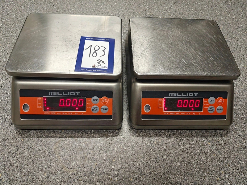 2 Milliot scales, model: SUPER-SS, max: 15 kg , d= 1 gram, 230 volt , 1 Ph, dimensions: (2x) 230 mm x 300 mm x 110 mm. Including battery.