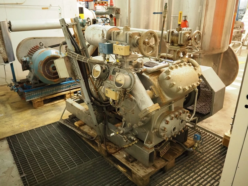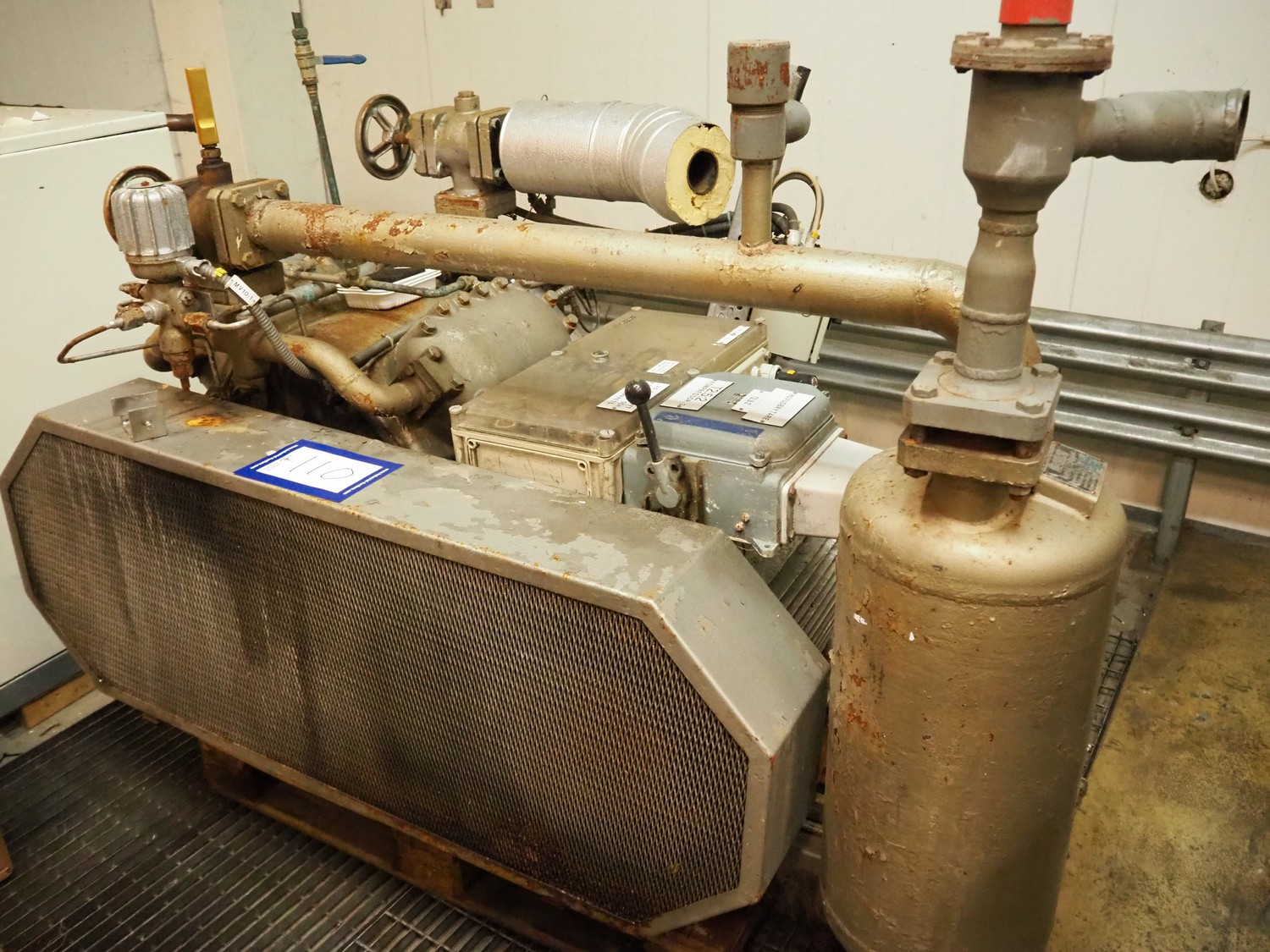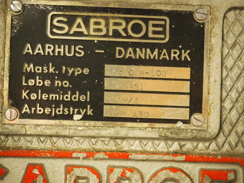 Sabroe reciprocating piston compressor, type: SMC 4-100, number: 48451, refrigerant: NH/3, pressure: 15 ATO, dimensions: 1600 mm x 1300 mm x 1400 mm.