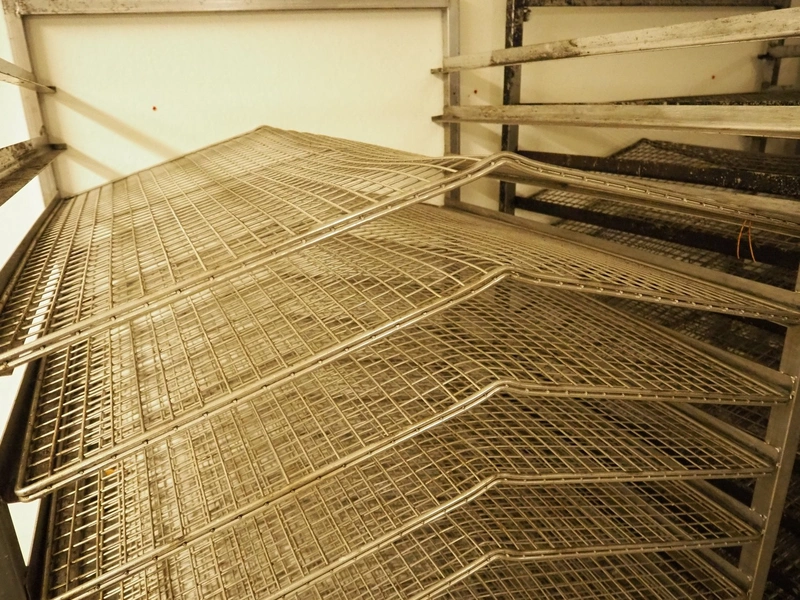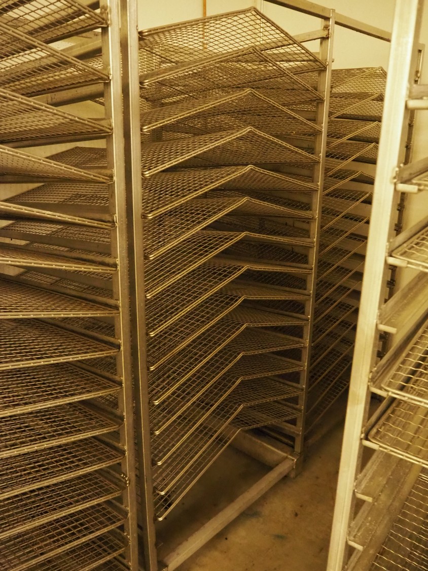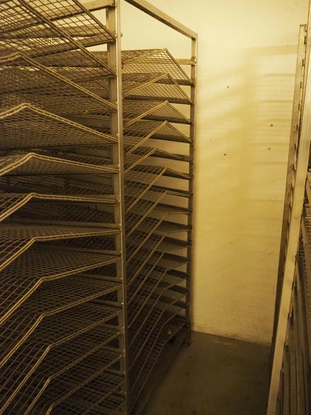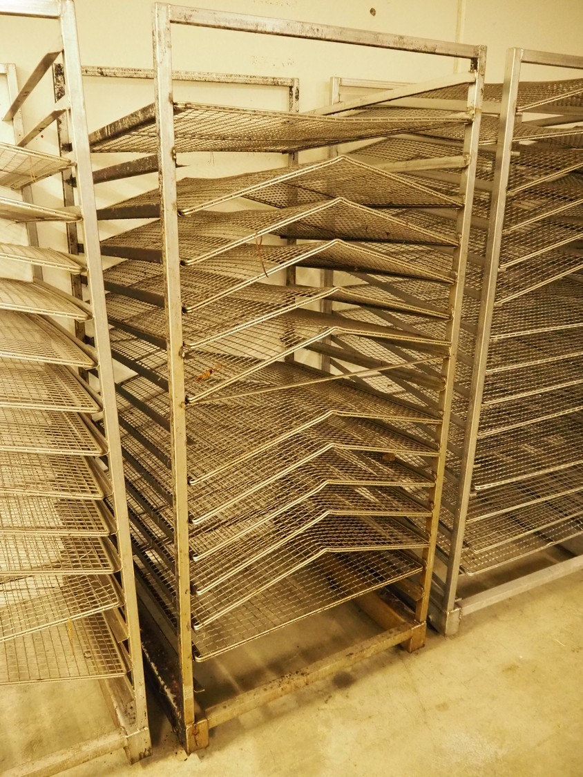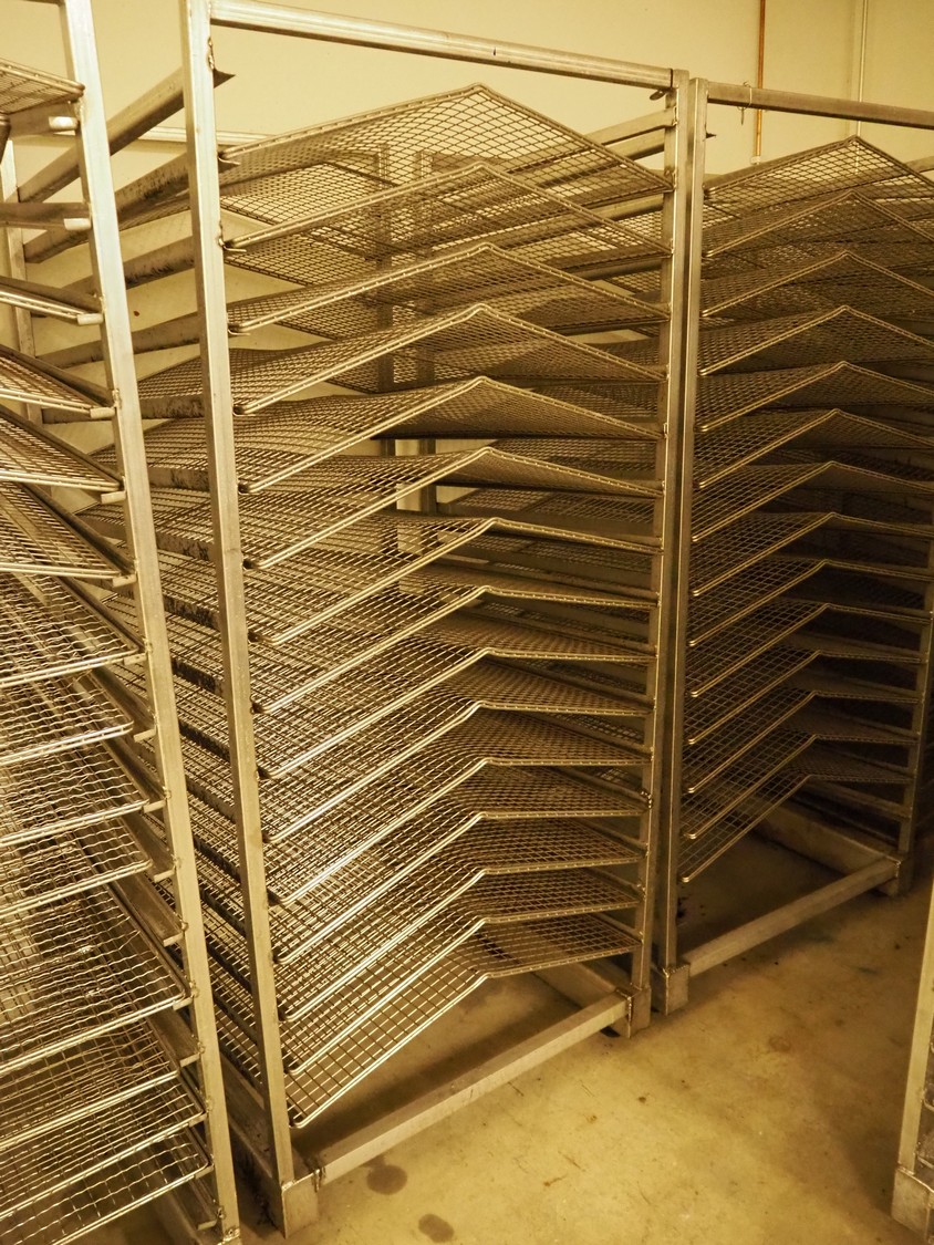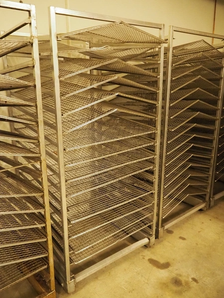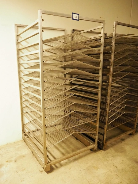 5 s/s smoke trolleys for salmon, 15 floors, floor dimensions: (15x) 870 mm x 1000 mm, distance between floors: 100 mm, total dimensions: (6x) 1000 mm x 940 mm x 200 mm.