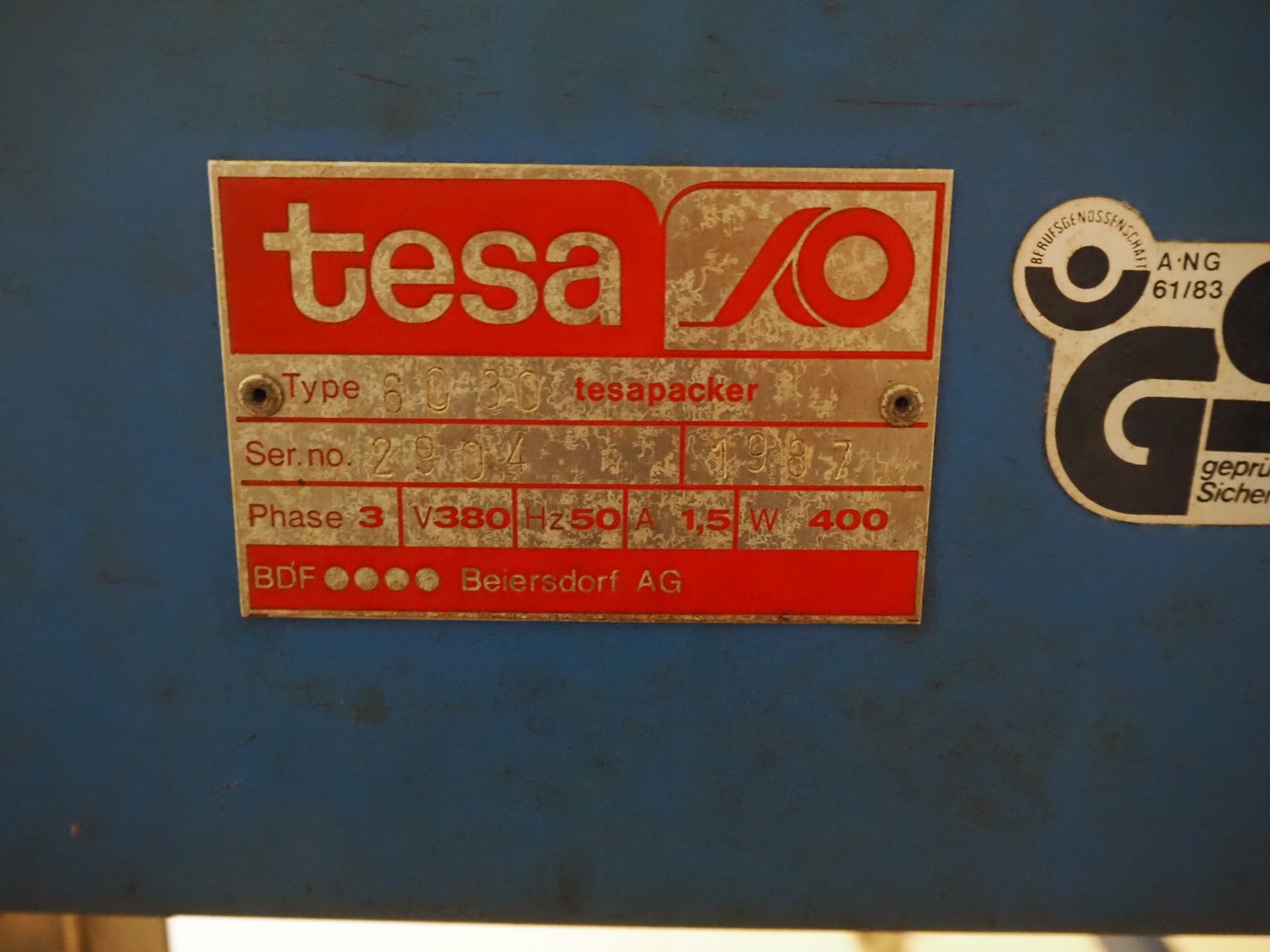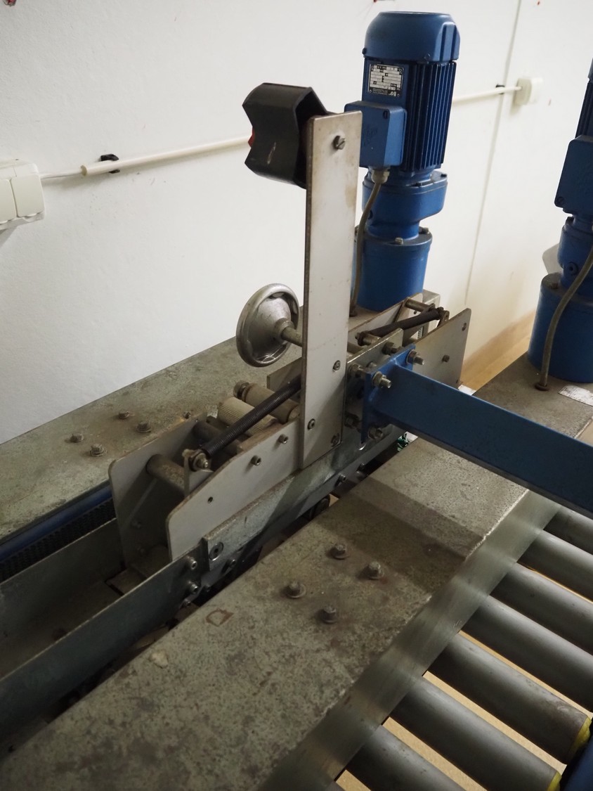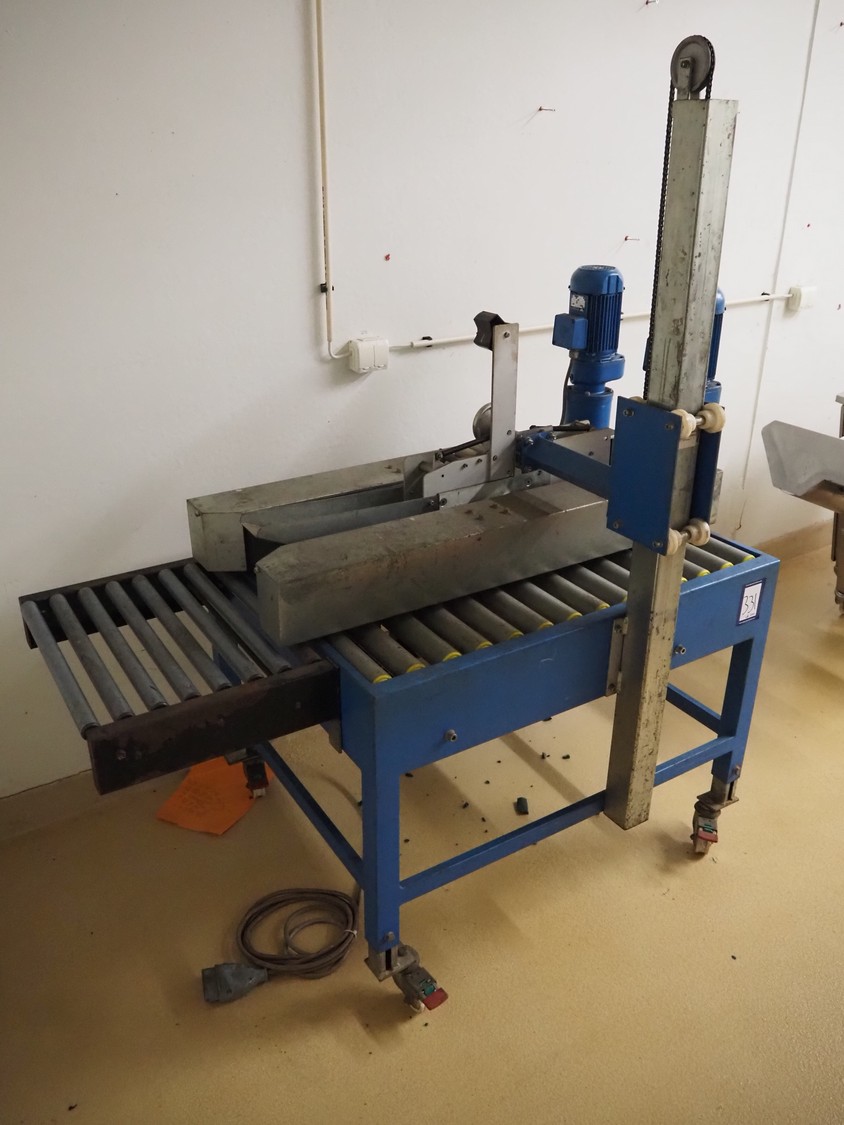 Tesa mobile box closing machine, type: 6030, serial number: 29 04, 380 V, 3 Ph, 50 Hz, 400 W, 1.5 A, roller width: (2x) 300 mm, total dimensions: 1450 mm x 900 mm x 1750 mm.