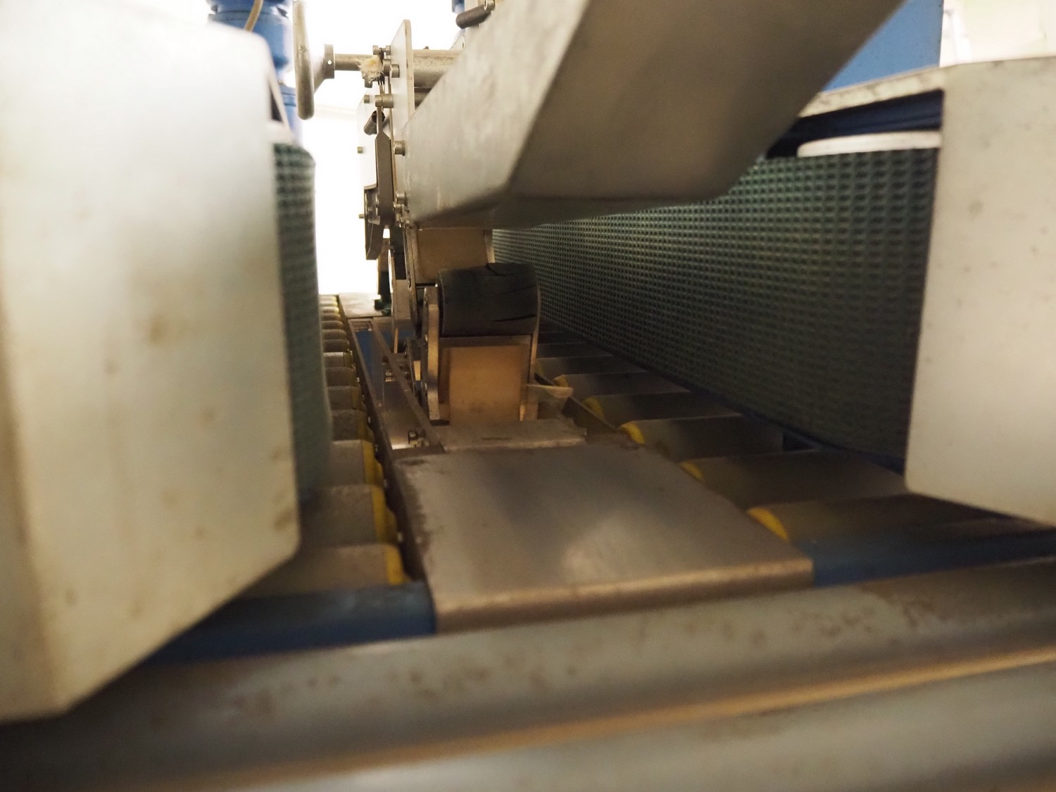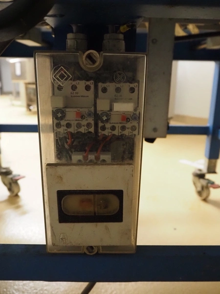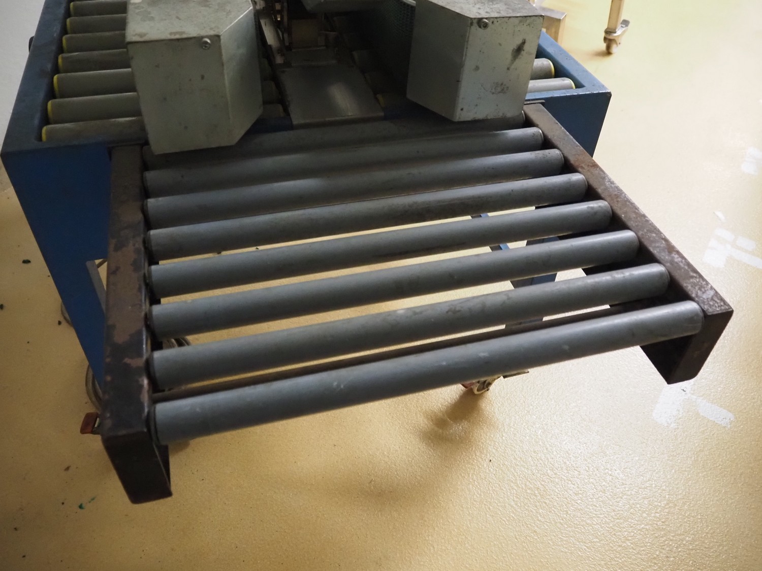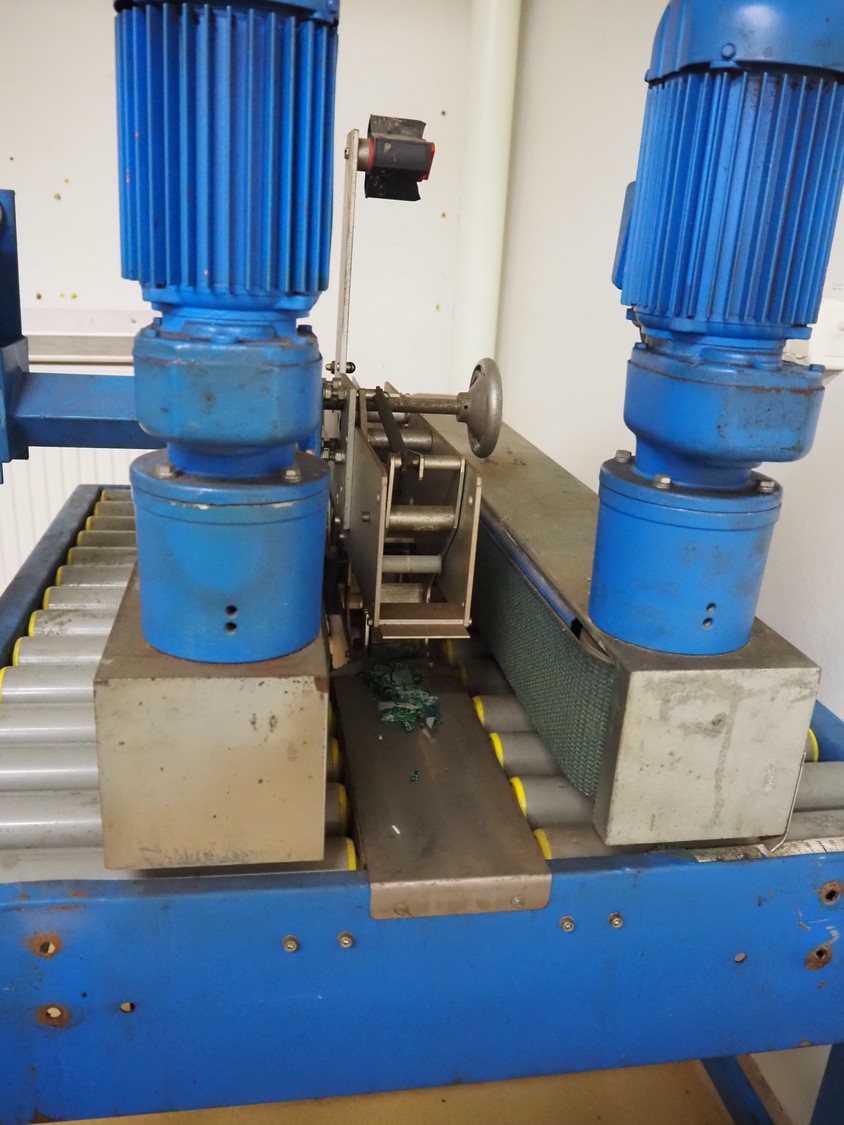 Tesa mobile box closing machine, type: 6030, serial number: 29 04, 380 V, 3 Ph, 50 Hz, 400 W, 1.5 A, roller width: (2x) 300 mm, total dimensions: 1450 mm x 900 mm x 1750 mm.