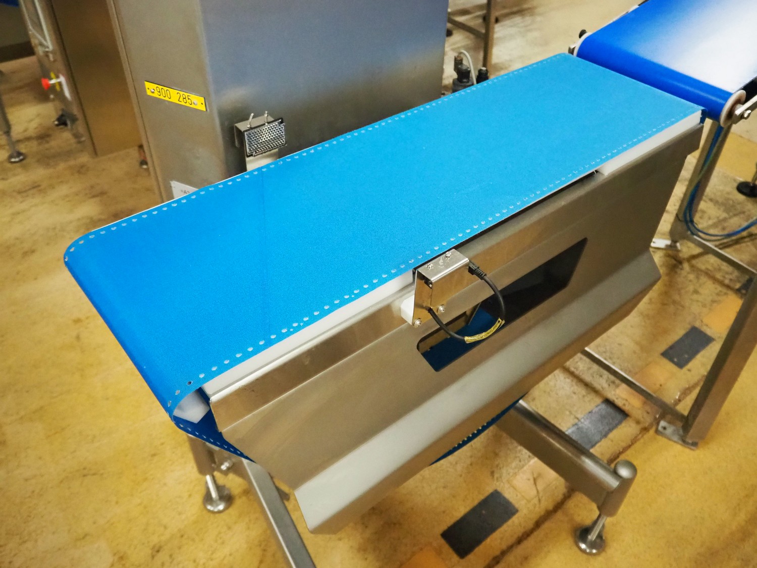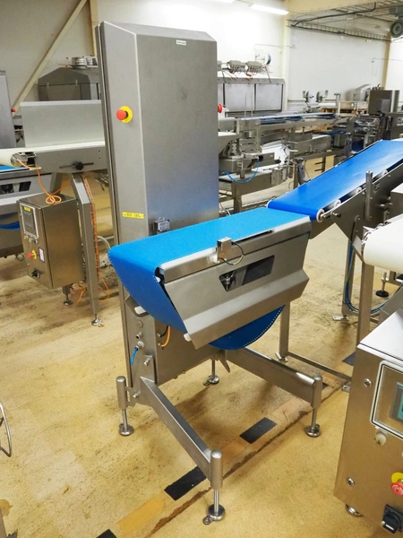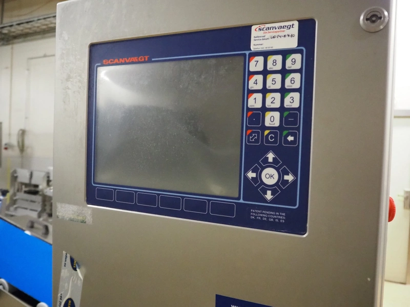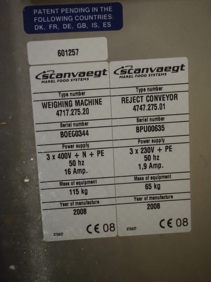 Scanvaegt checkweigher, type: WEIGHING MACHINE 4717.275.20, serial number: BOE00344, year of construction: 2008, 400 V, 3 Ph, 50 Hz, 16 A, weight: 115 kg, plastic belt, belt width: 275 mm, total dimensions: 930 mm x 750 mm x 1820 mm.