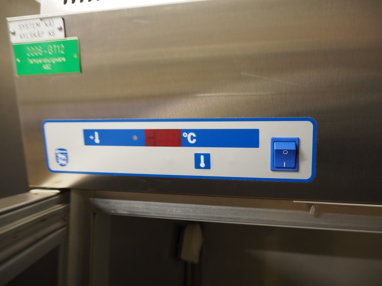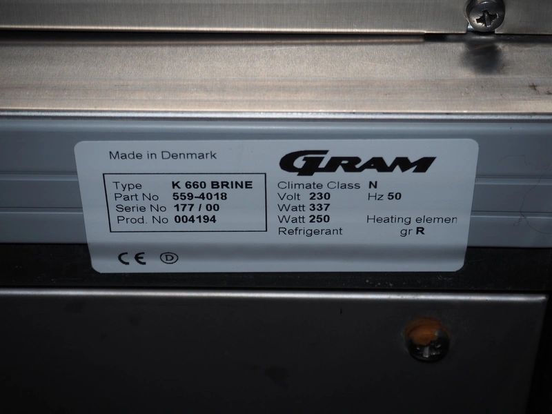 Gram refrigerator, type: K 660 brine, serial number: 177/00, 230 V, 50 Hz, 337-250 Watt, 4 floors, floor dimensions: 650 mm x 530 mm, total dimensions: 810 mm x 725 mm x 2160 mm. Without cooling compressor.