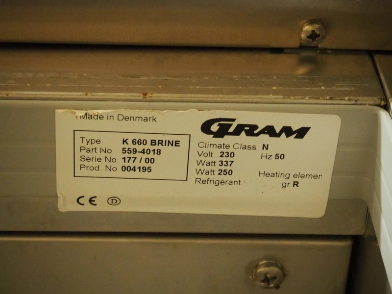 Gram refrigerator, type: K 660 brine, serial number: 177/00, 230 V, 50 Hz, 337-250 Watt, 4 floors, floor dimensions: 650 mm x 530 mm, total dimensions: 810 mm x 725 mm x 2160 mm. Without cooling compressor.