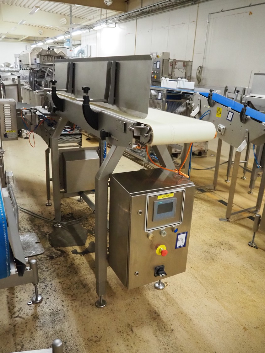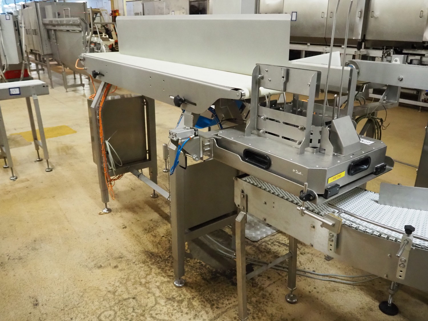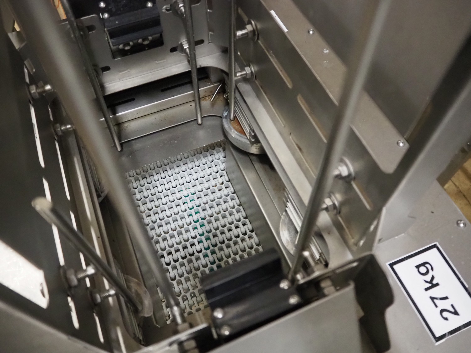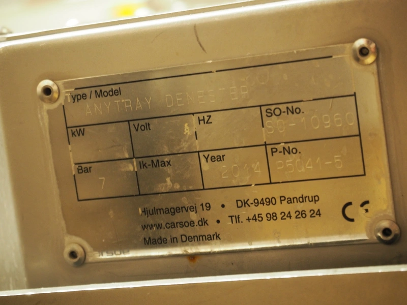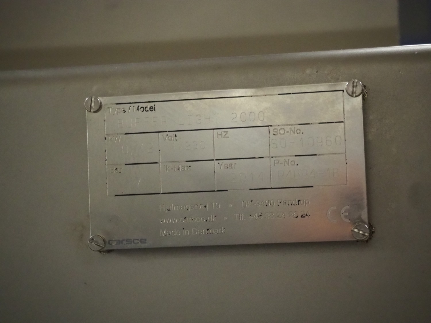 Carsoe buffer belt with tray denester, type: BUFFER LIGHT 2000, serial number: 10960, year of construction: 2014, 230 V, 1 Ph, 0.12 kW, s/s frame, plastic belt, belt width: 340 mm, dimensions trays: 280 mm x 180 mm, total dimensions: 2500 mm x 900 mm x 1600 mm.