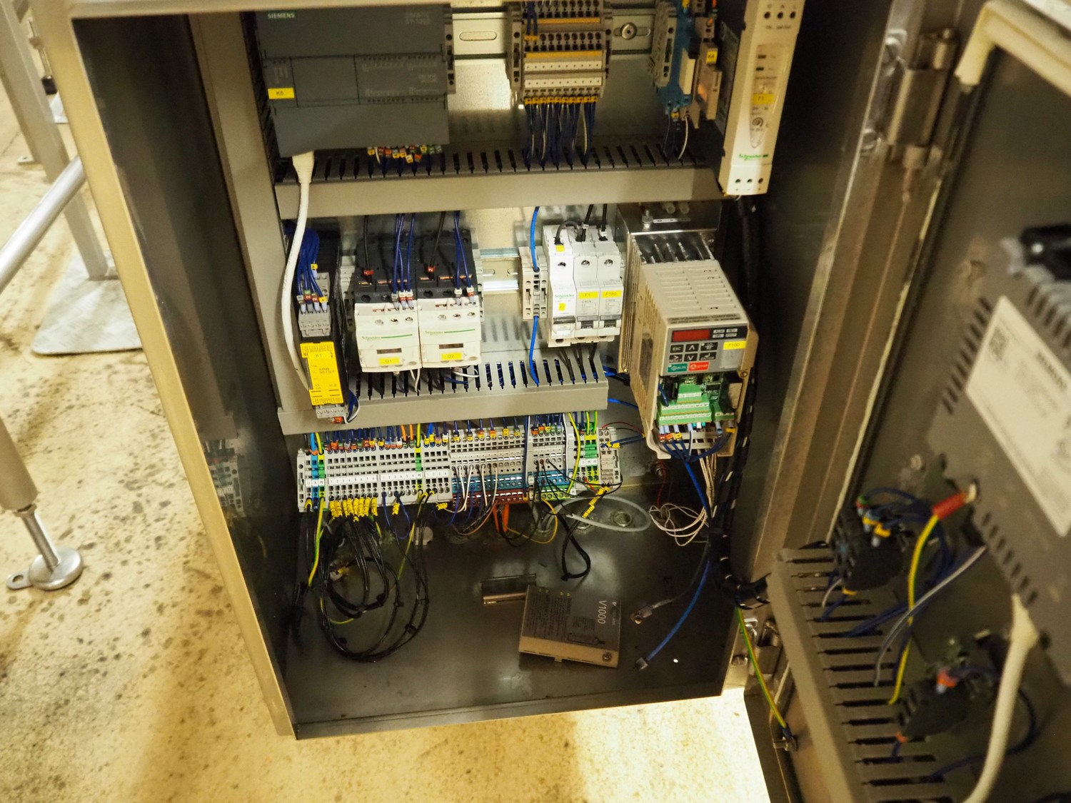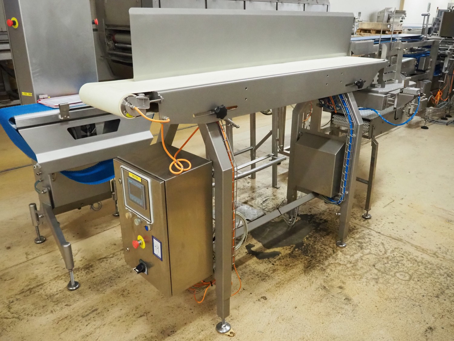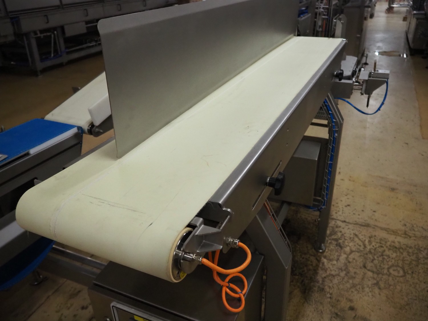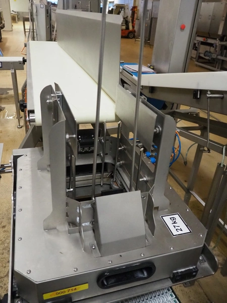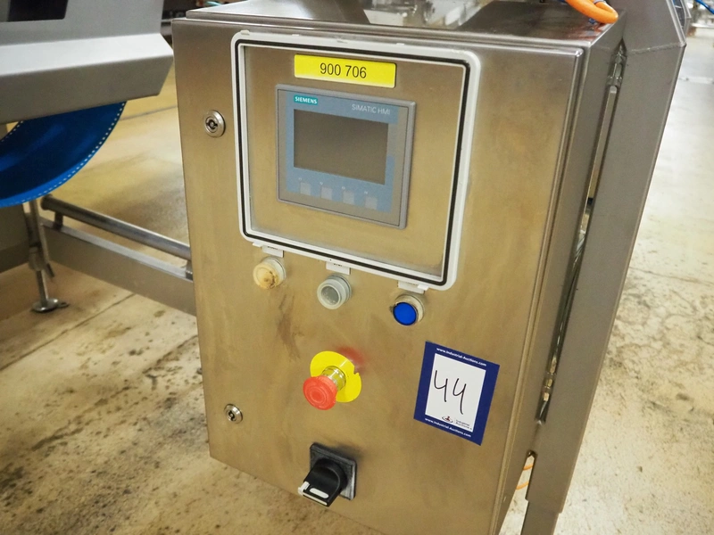 Carsoe buffer belt with tray denester, type: BUFFER LIGHT 2000, serial number: 10960, year of construction: 2014, 230 V, 1 Ph, 0.12 kW, s/s frame, plastic belt, belt width: 340 mm, dimensions trays: 280 mm x 180 mm, total dimensions: 2500 mm x 900 mm x 1600 mm.
