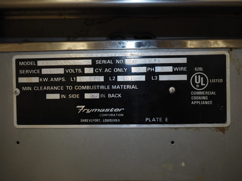 Frymaster deep fryer, model: 12EFSC, serial number: 80H6371EX, 220/380 V, 3 Ph, 50 Hz, 12 kW, dimensions: 800 mm x 400 mm x 1000 mm. Without baskets.