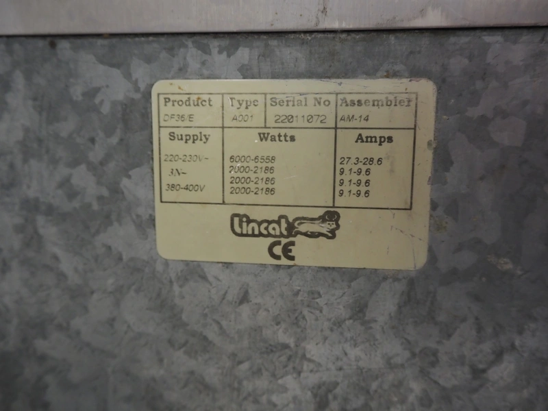 Lincat deep fryer, type: A001, serial number: 22011072, 220-230 V, 3 Ph, dimensions: 600 mm x 300 mm x 500 mm. Without basket.
