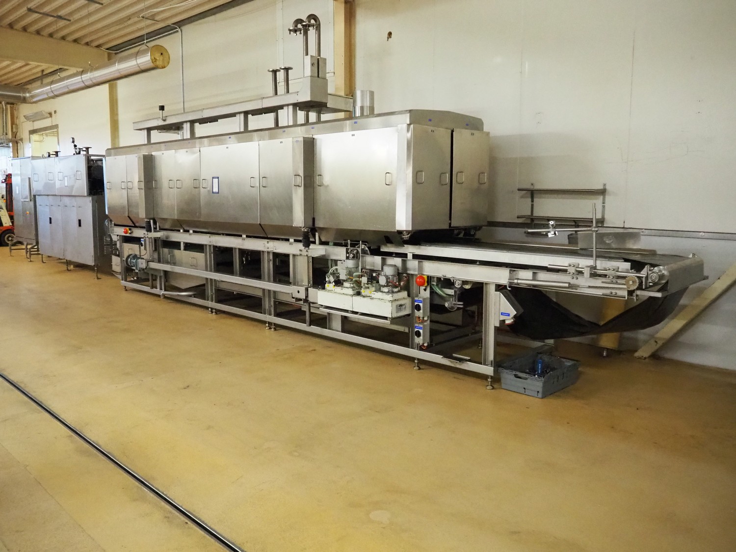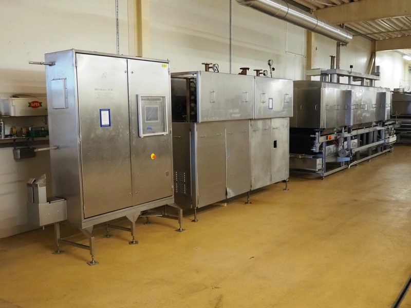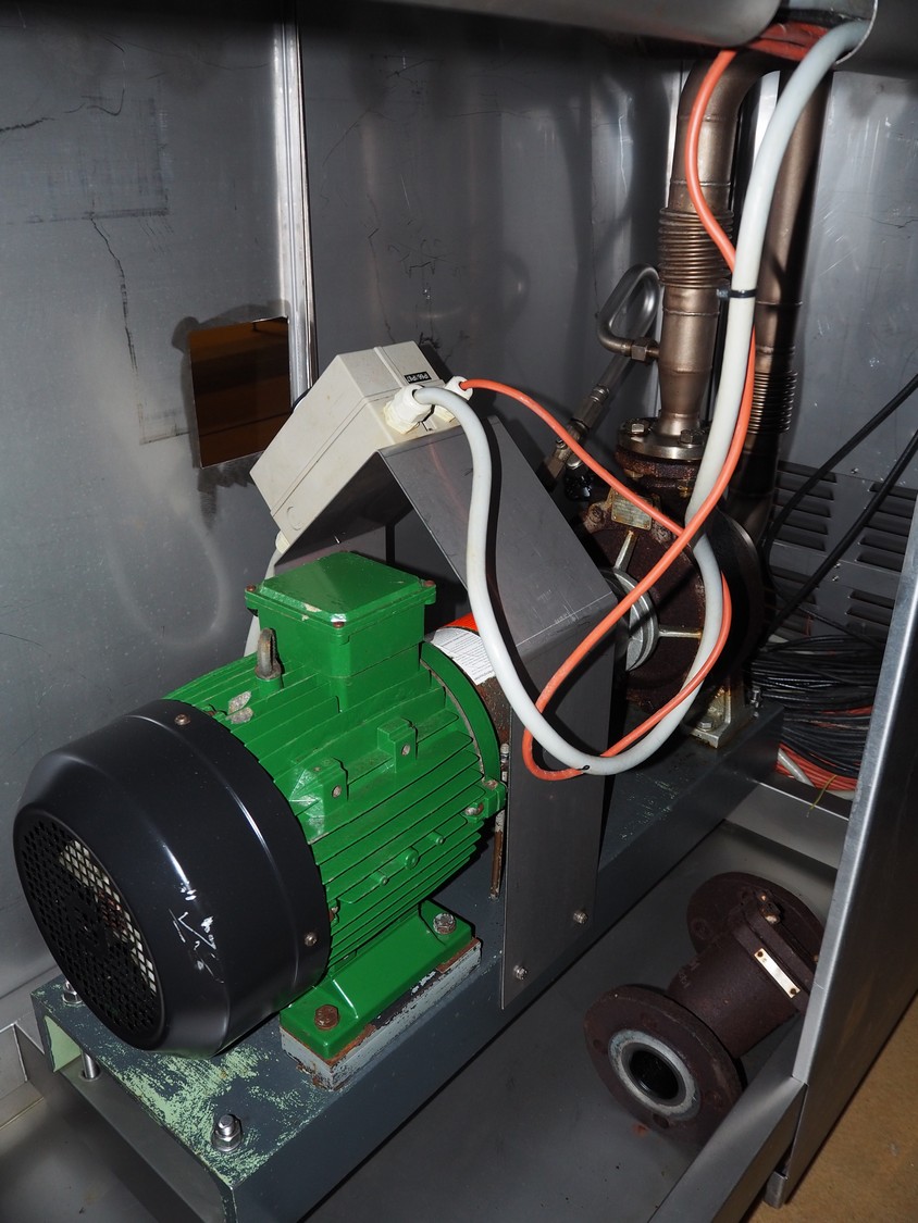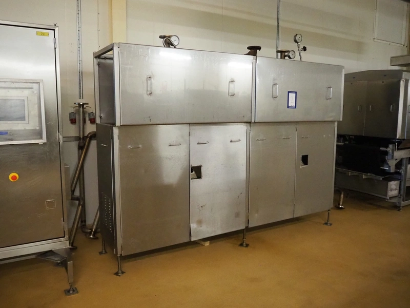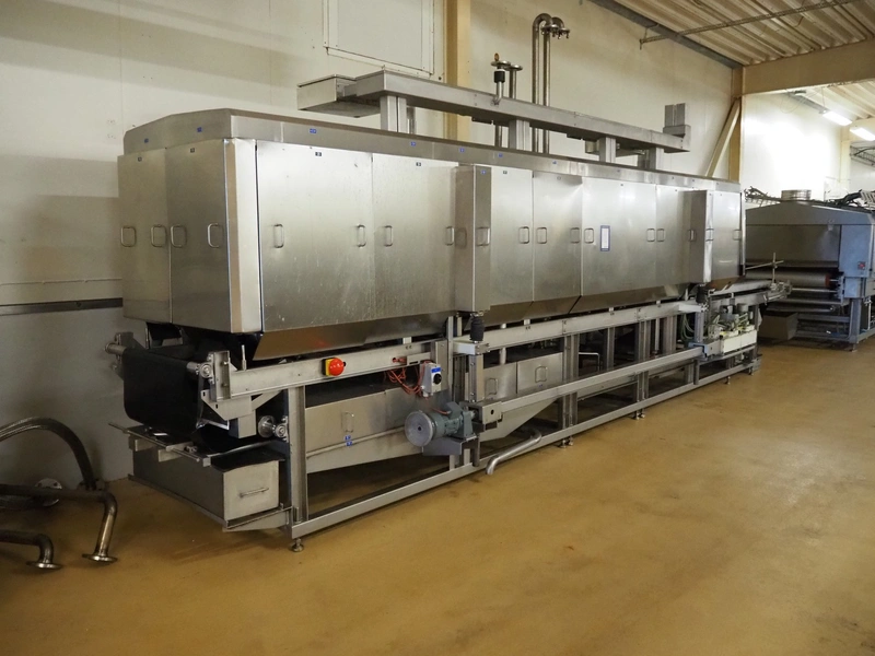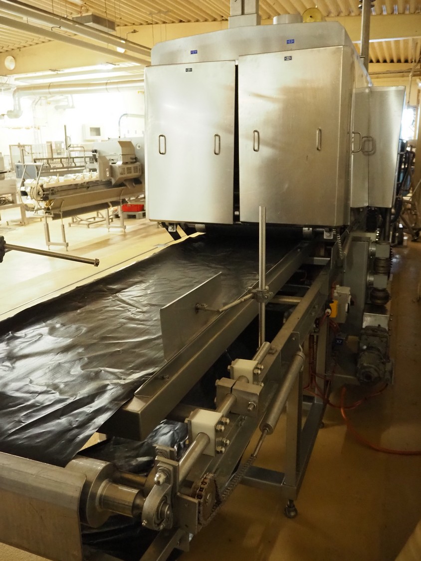 CFS teflon belt grill, type: TWG 4800/600, machine number: 604, year of construction: 2002, 400 V, 3 Ph, 50 Hz, 45 A, 22 kW, 5500 kg, belt width: 645 mm, dimensions: 8400 mm x 1500 mm x 3500 mm, height without pipes: 2850 mm, dimensions pump unit: 3000 mm x 850 mm x 2400 mm, dimensions switch cabinet: 1500 mm x 750 mm x 2200 mm.