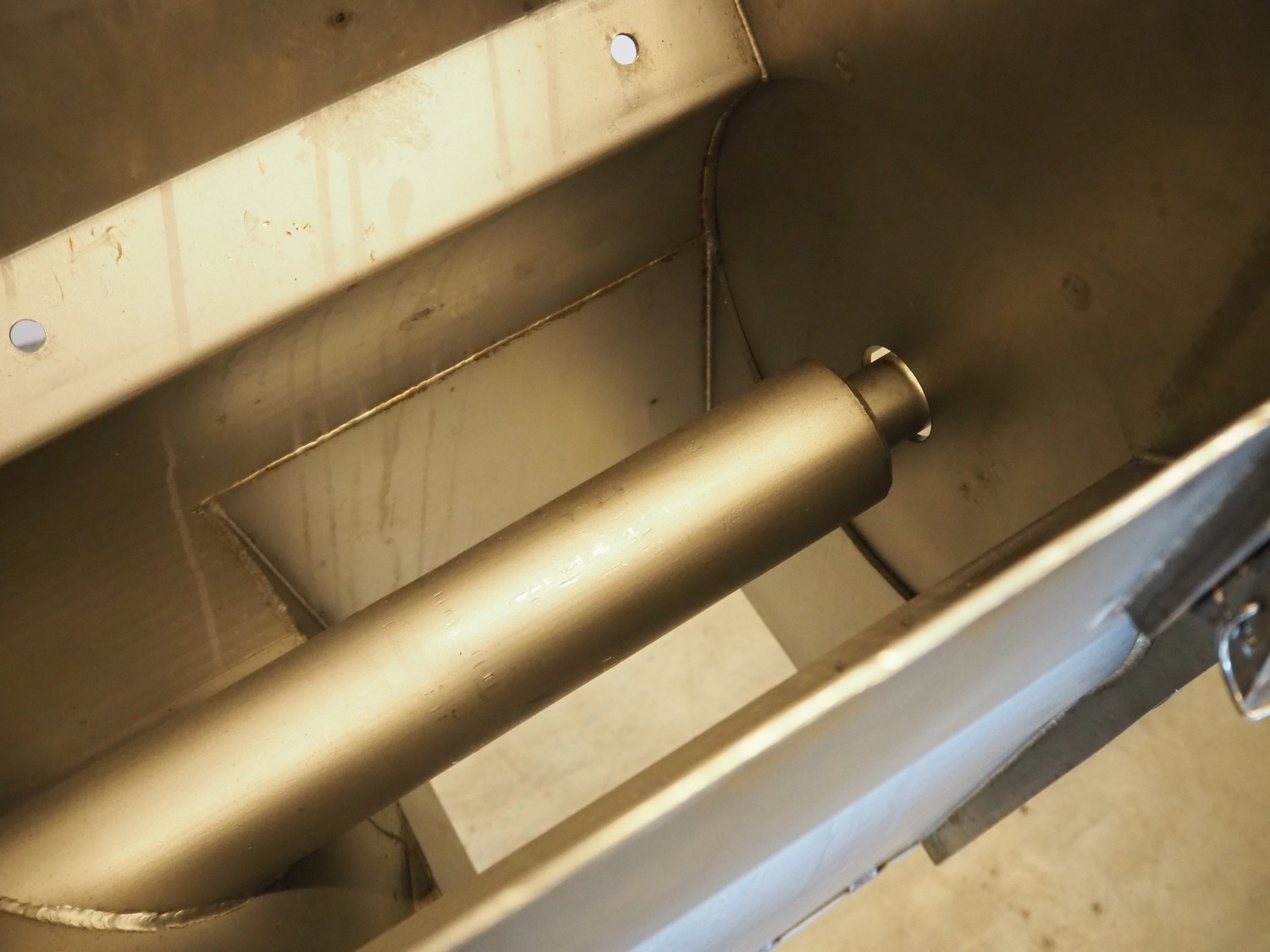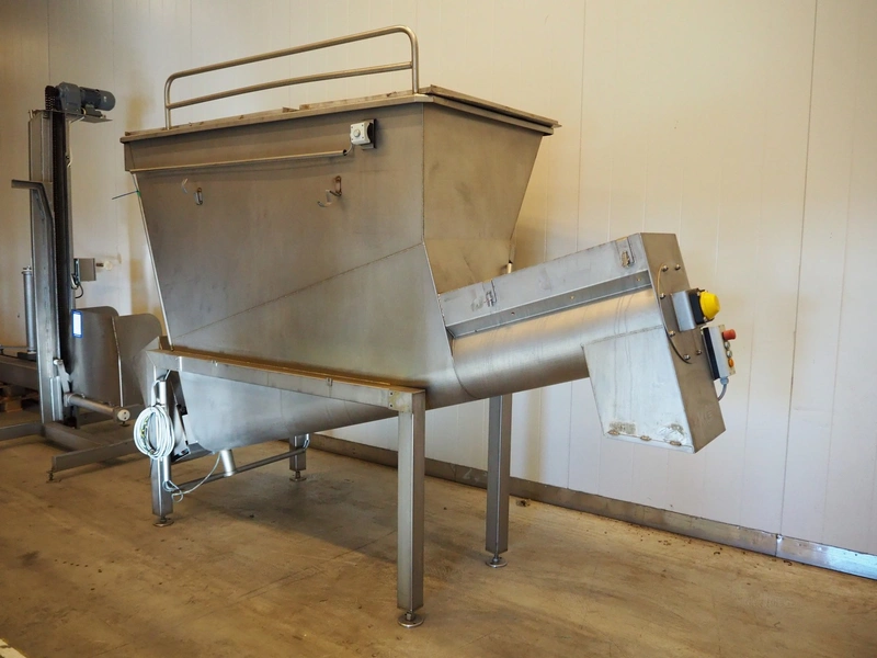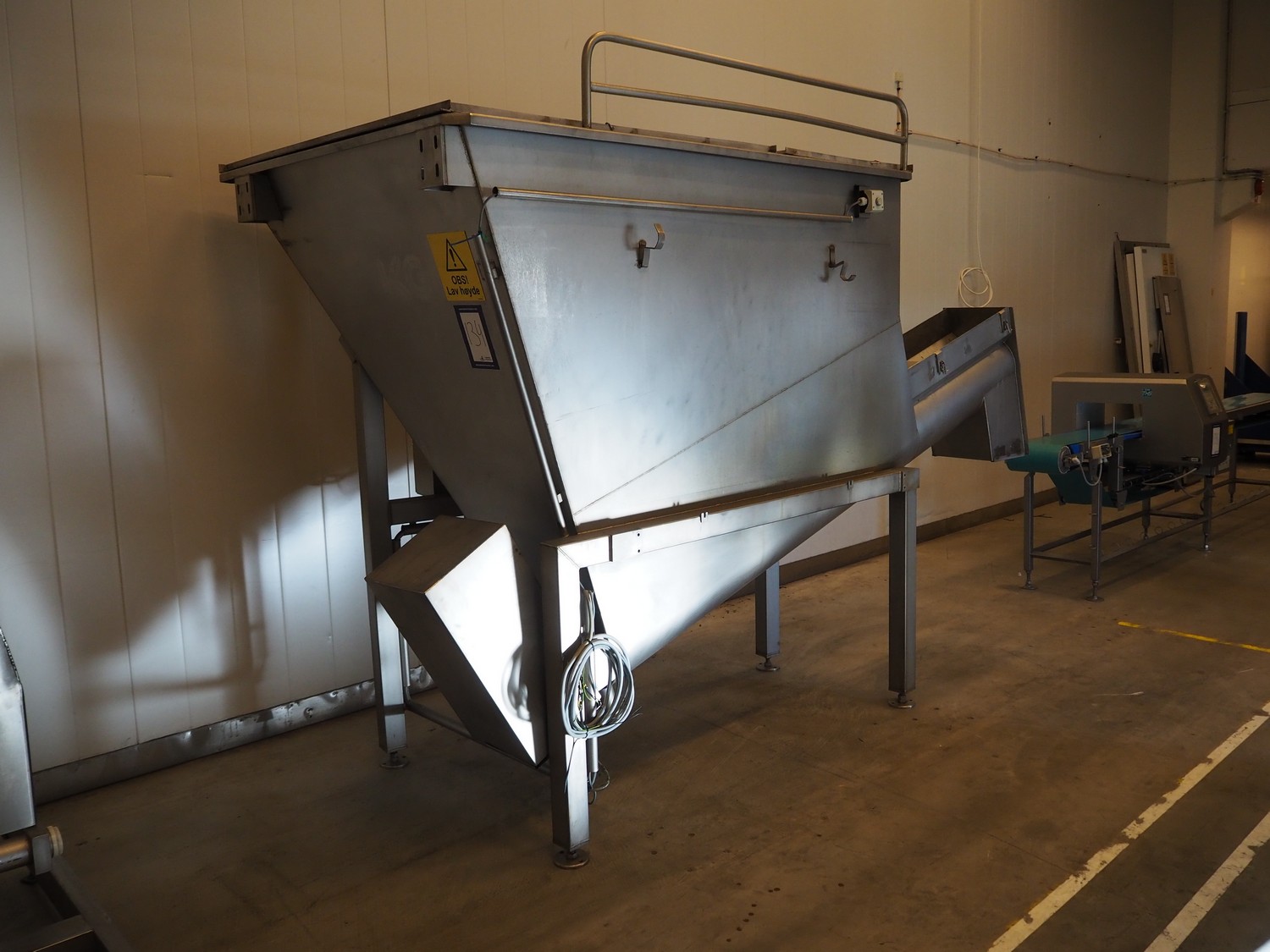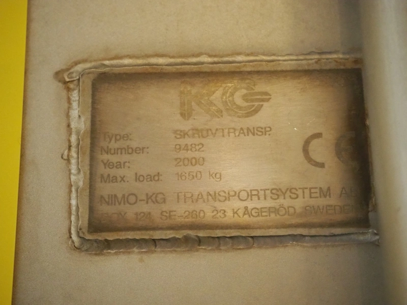 Nimo KG s/s bunker with outfeed screw, type: SKRUVTRANSP., number: 9482, year of construction: 2000, maximum load capacity: 1650 kg, tier: 225 mm, total dimensions: 3350 mm x 1400 mm x 2200 mm.