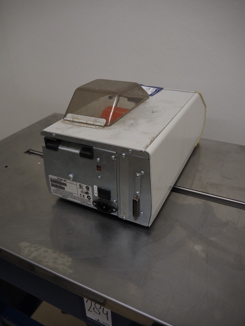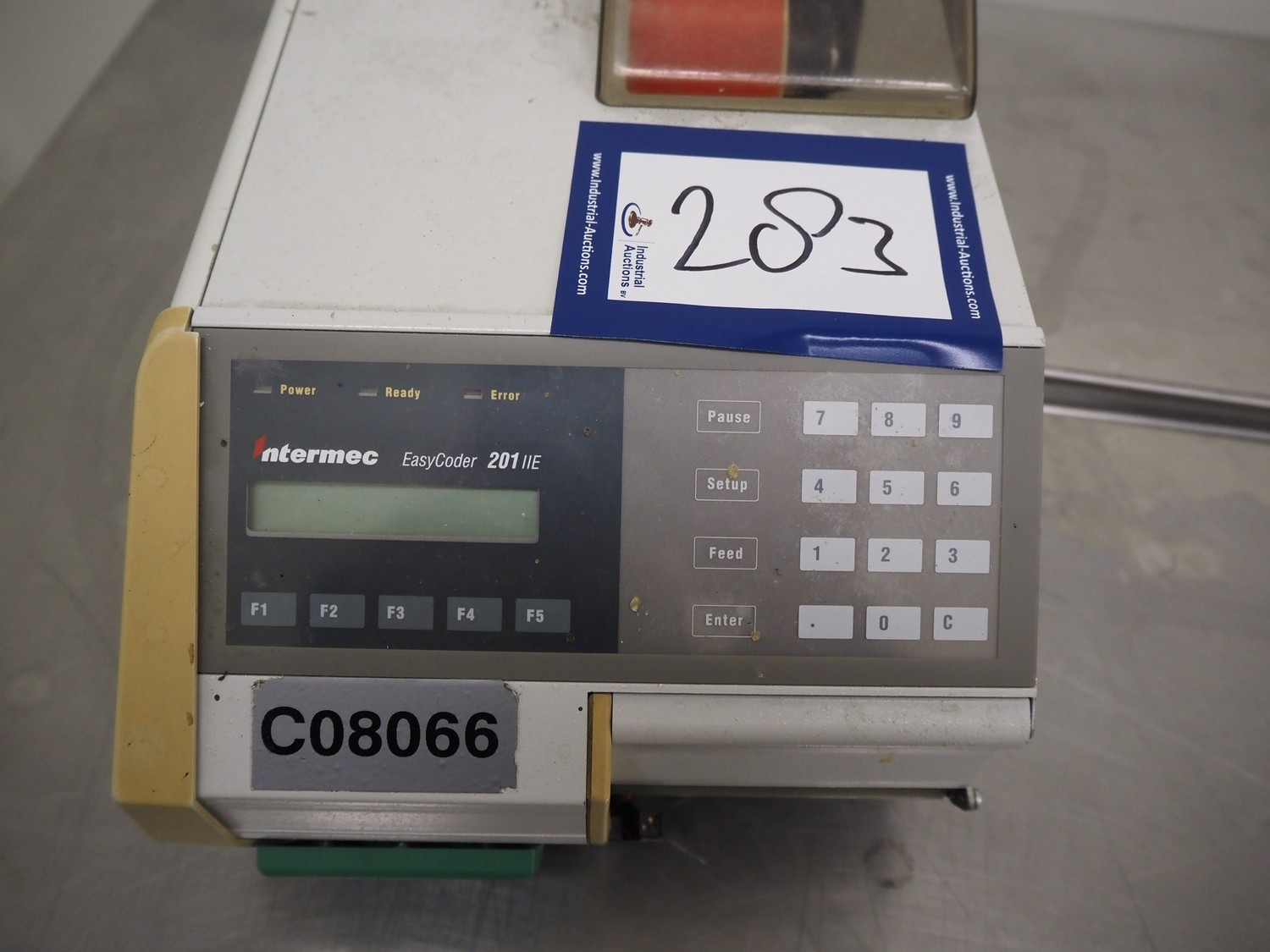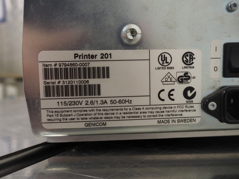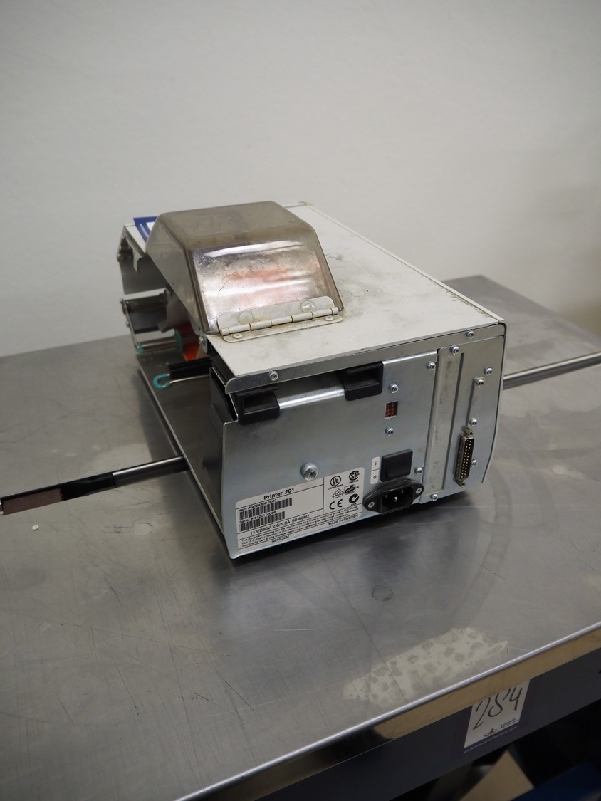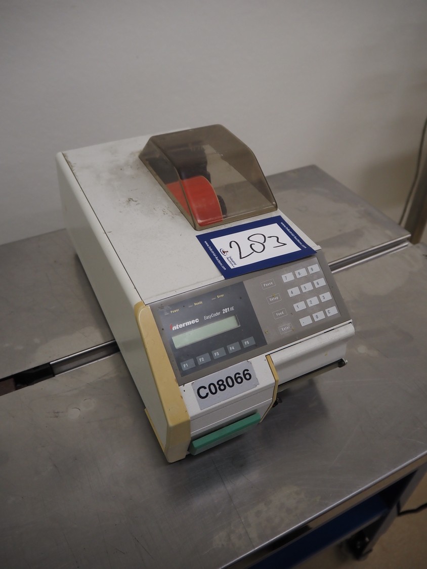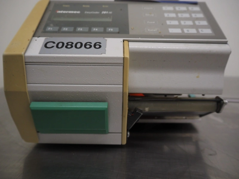 Intermec label printer, model: Easycoder 201 IIE, serial numbers: 3120110006, 115/230 V, 50/60 Hz, 2.6/1.3 A, dimensions: 630 mm x 210 mm x 220 mm.