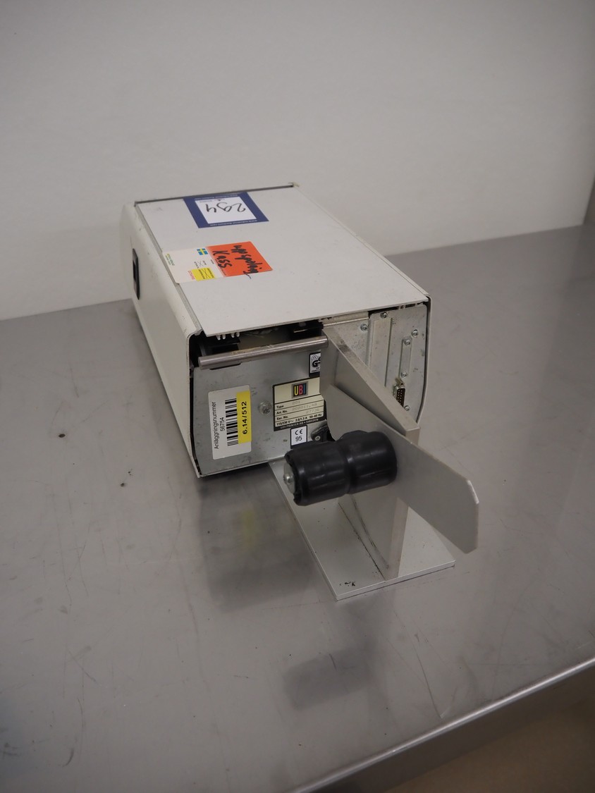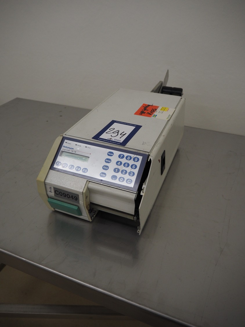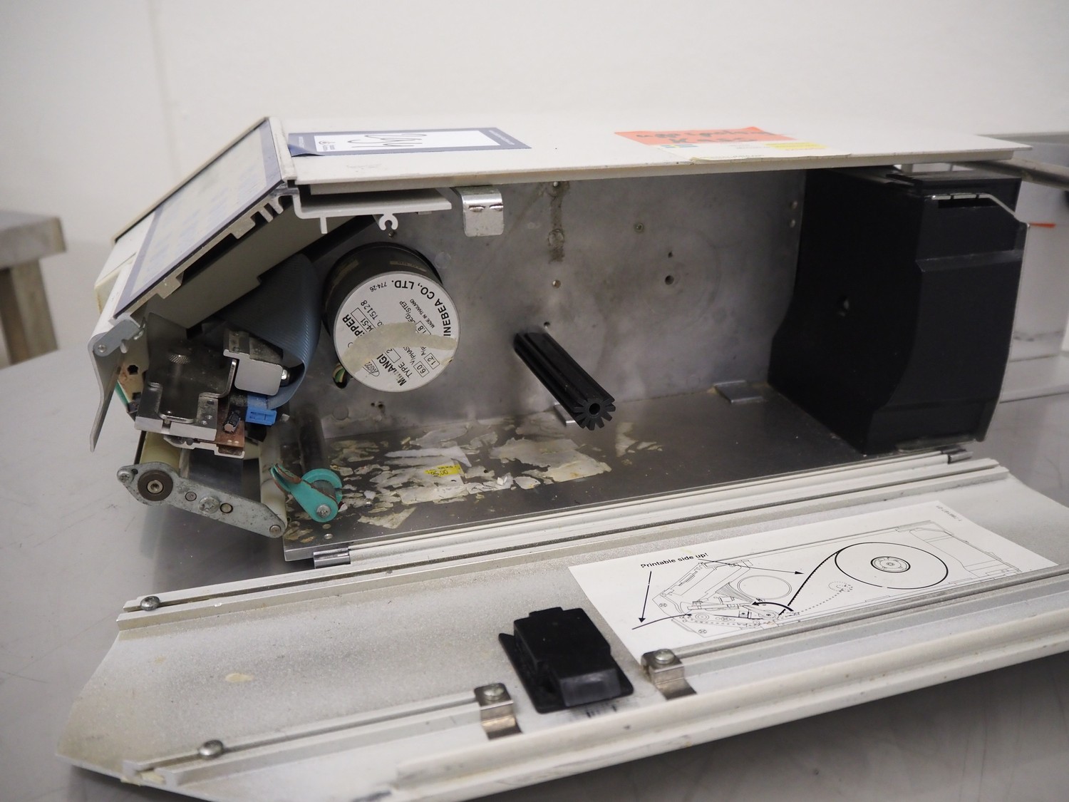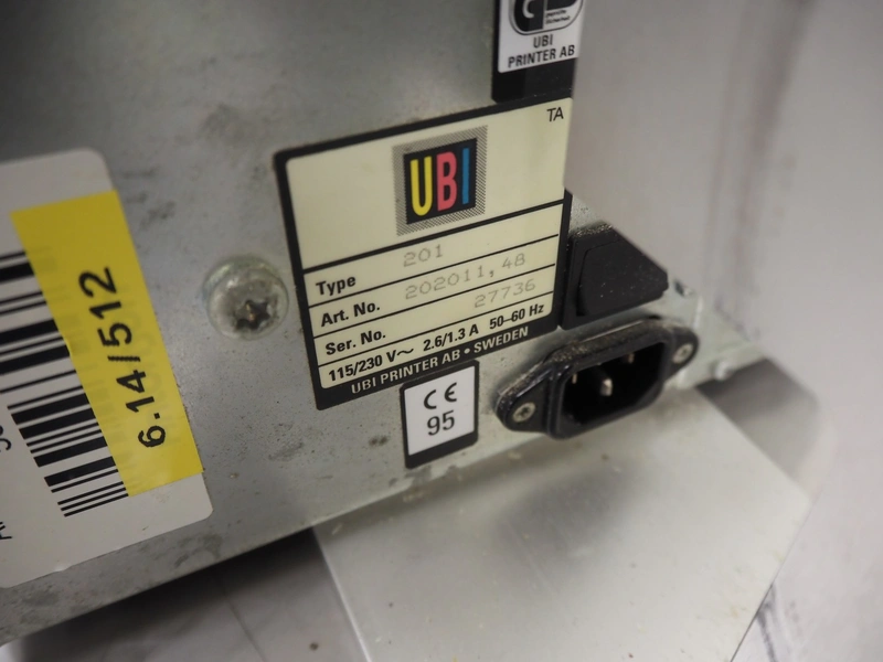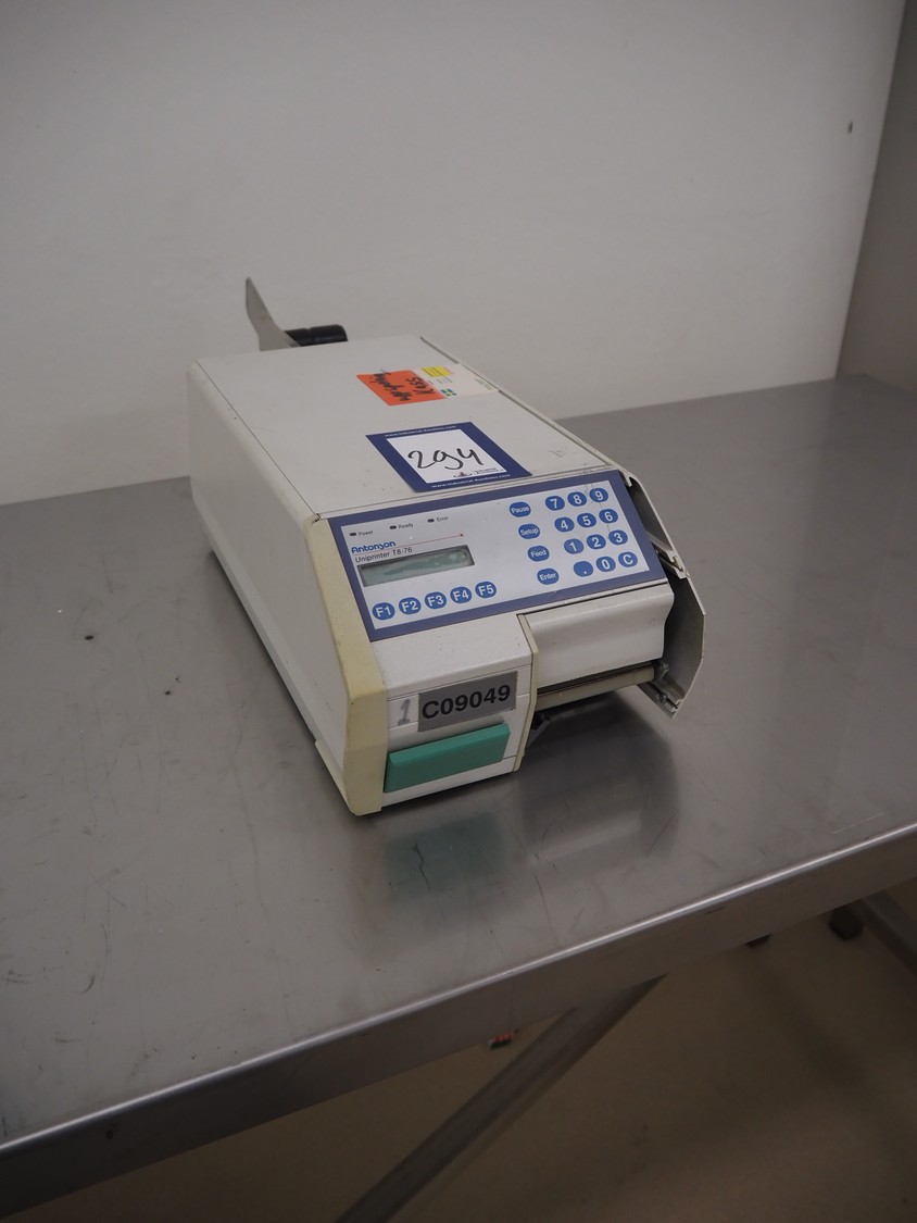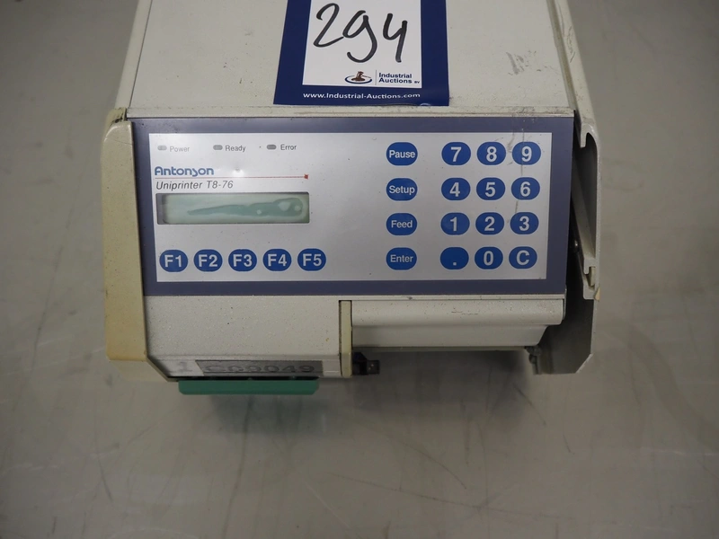 Antonson label printer, model: Uniprinter T8-76, type: 201, serial number: 27736, 230 V, 1 Ph, 50/60 Hz, 2.6/1.3 A, dimensions: 630 mm x 220 mm x 220 mm.