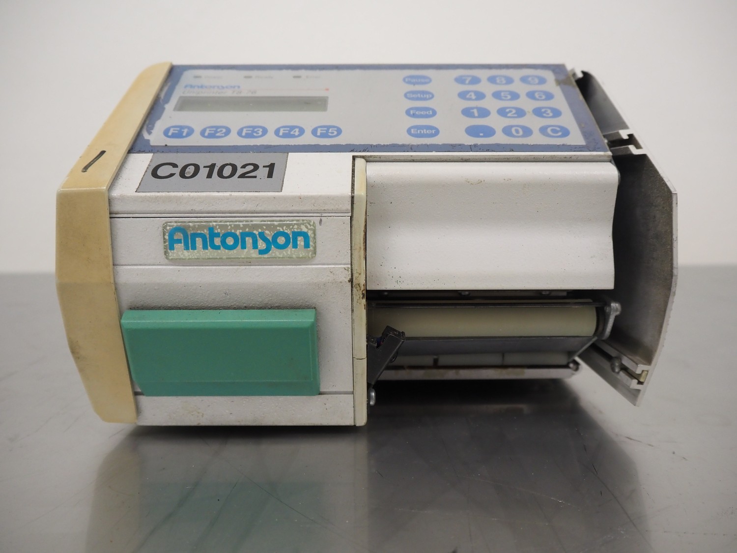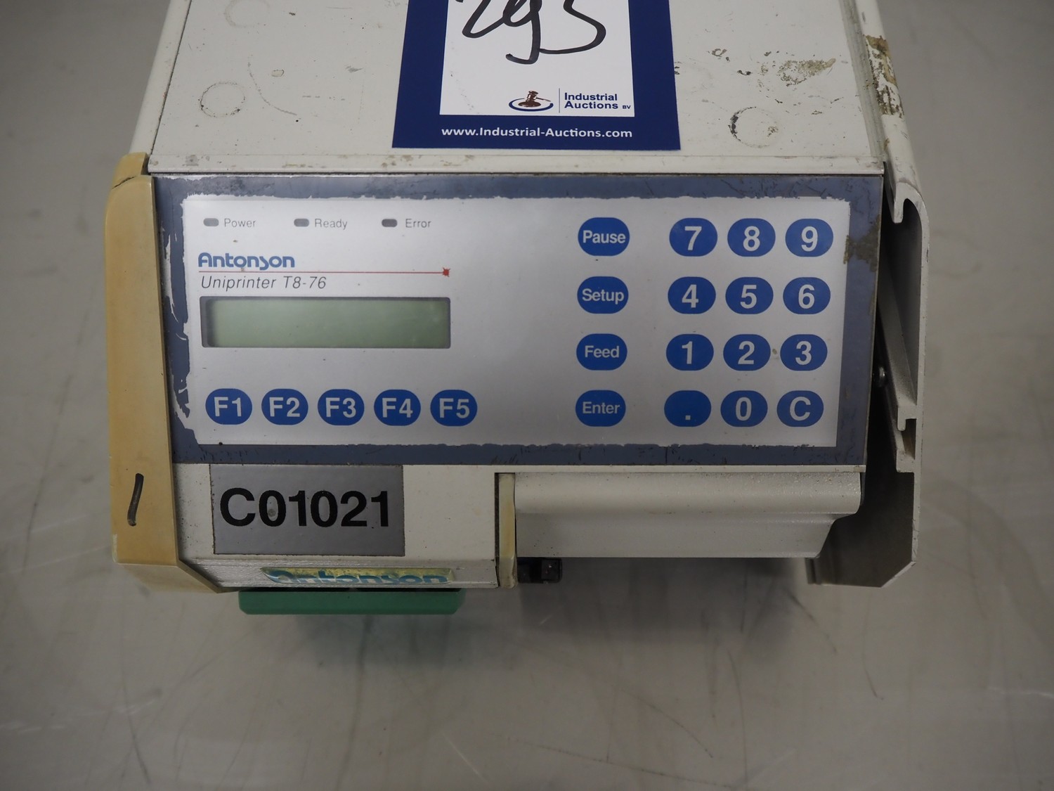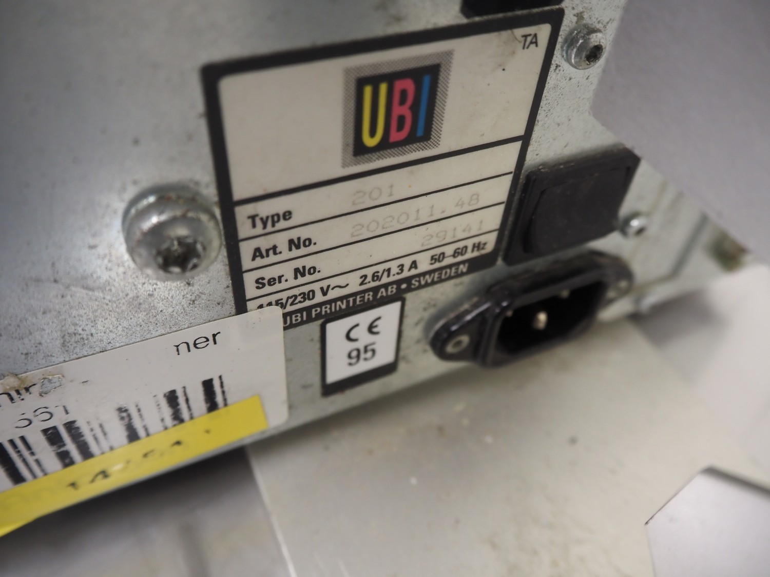 Antonson label printer, model: Uniprinter T8-76, type: 201, serial number: 29141, 230 V, 1 Ph, 50/60 Hz, 2.6/1.3 A, dimensions: 630 mm x 220 mm x 220 mm.