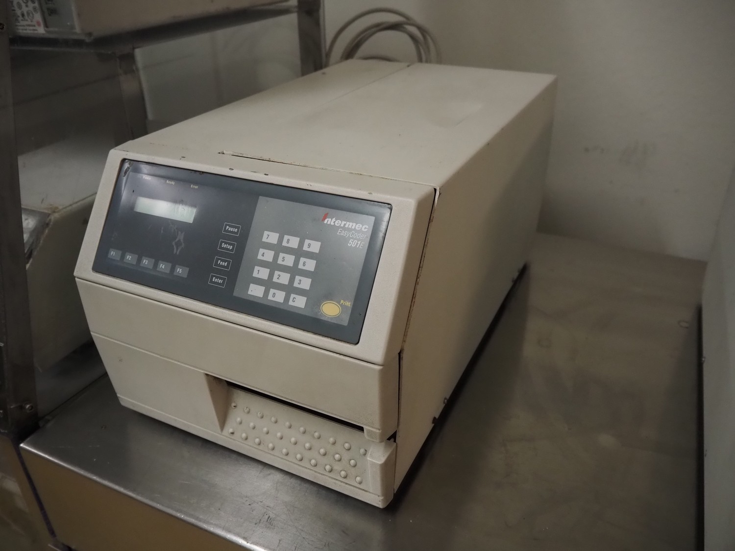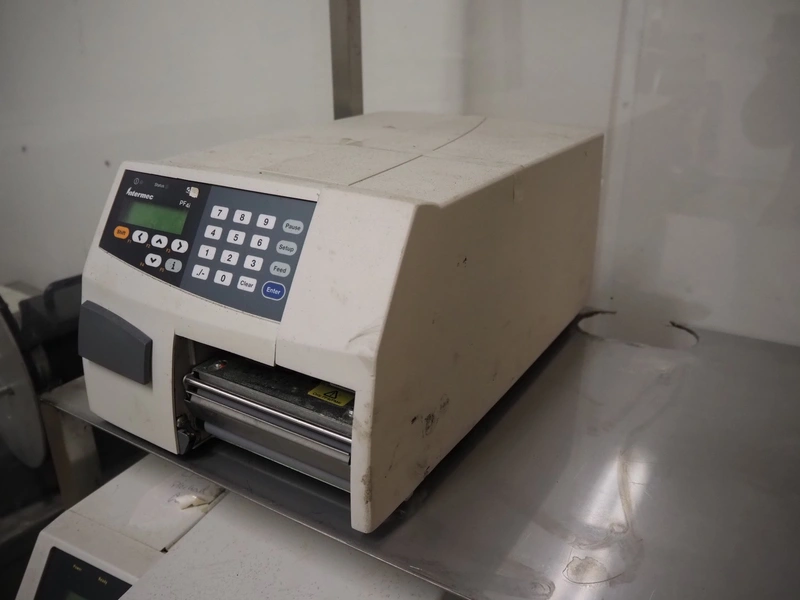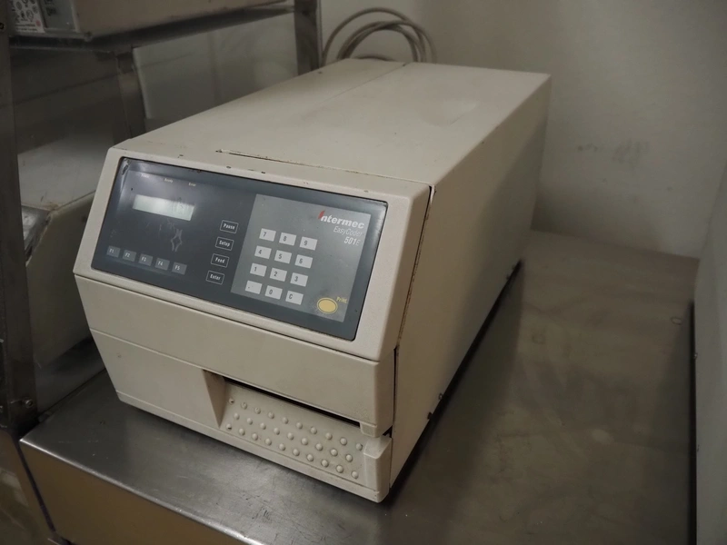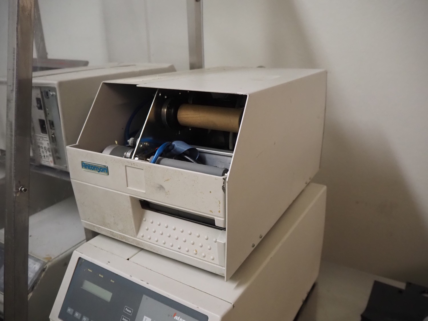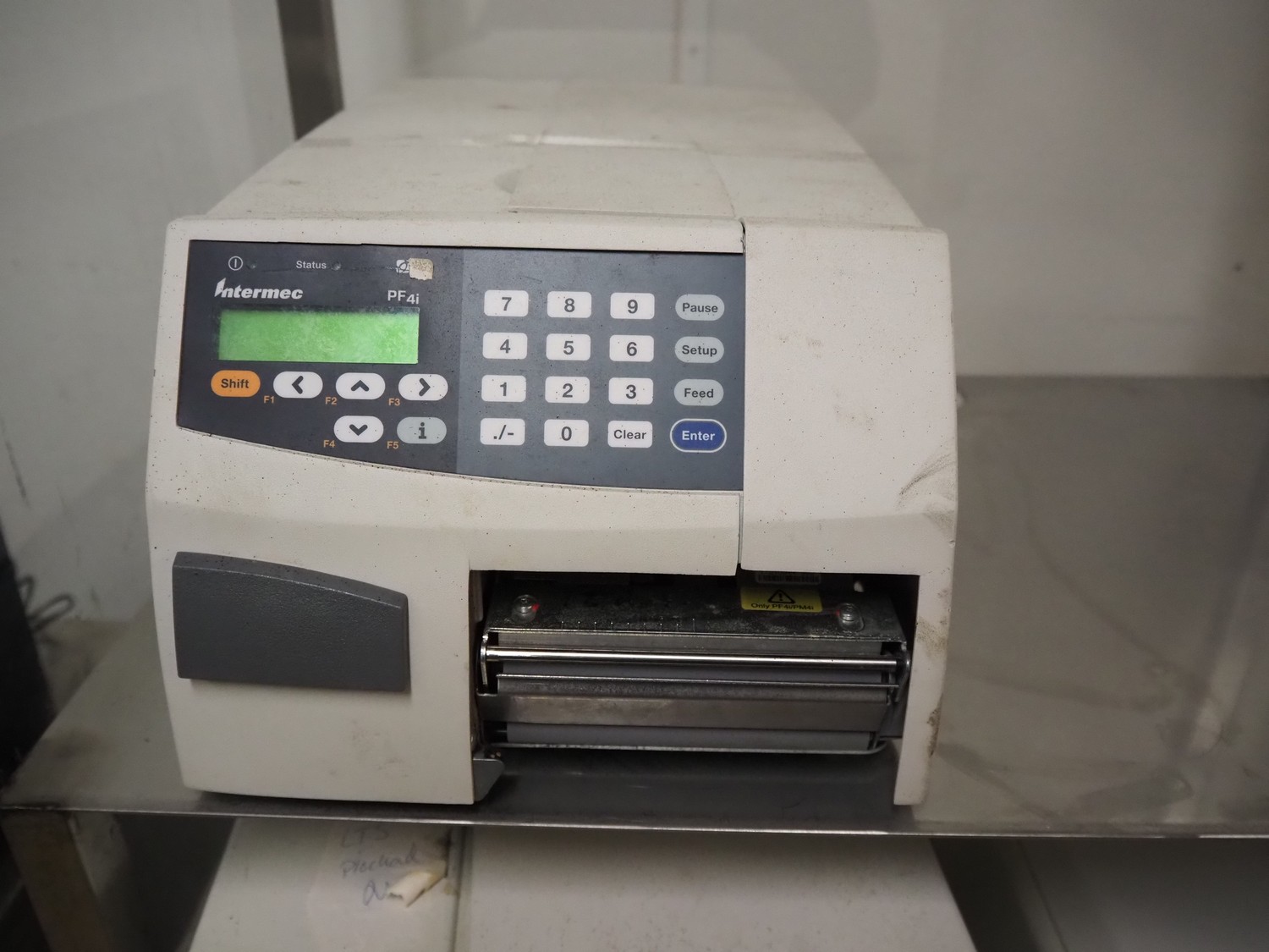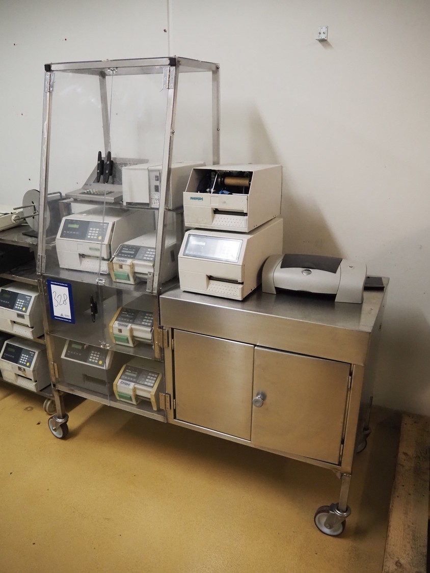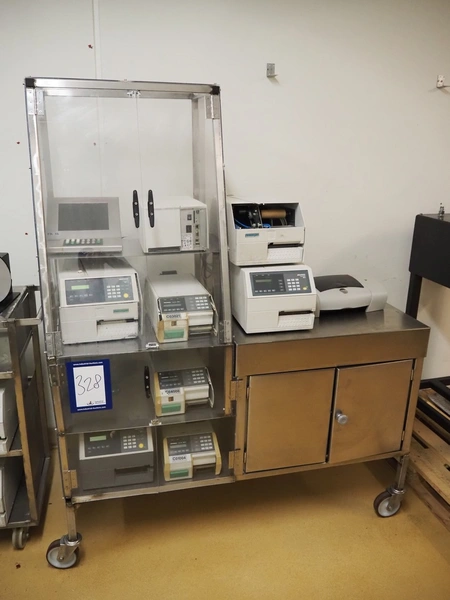 Mobile s/s cabinet with 7 Intermec label printers, model: (3x) Easycoder 501 E, (3x) Easycoder 201 IIE and (1x) PF4i, with Flintab control panel and Dell printer, dimensions: 1500 mm x 600 mm x 1820 mm.