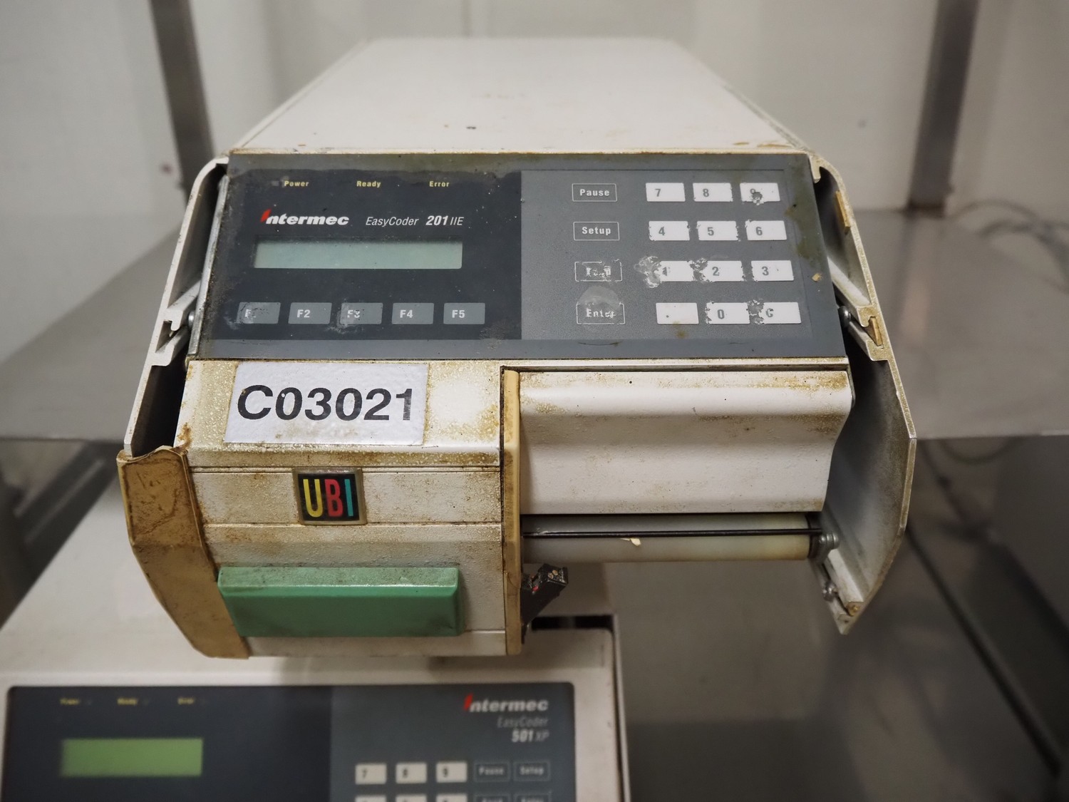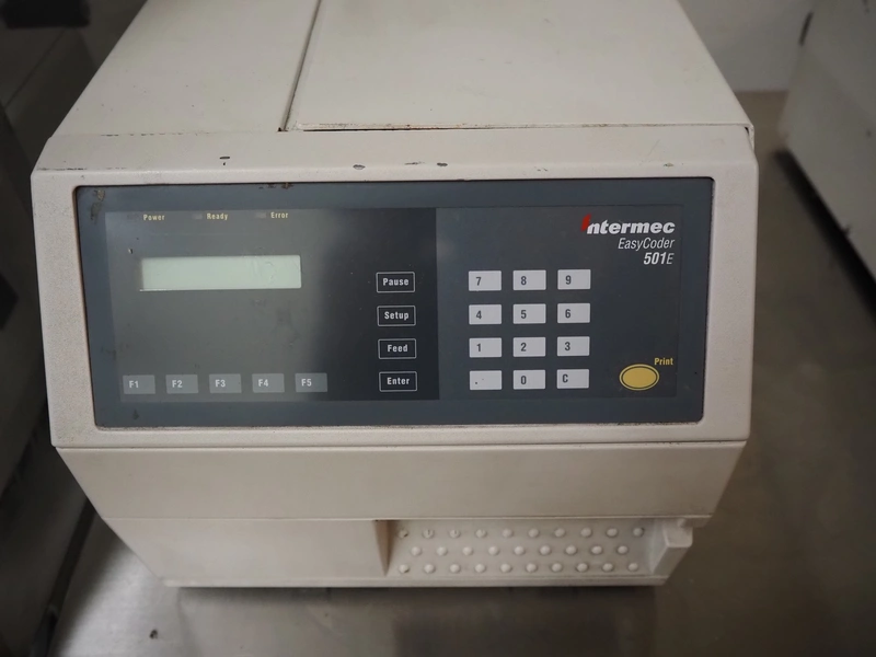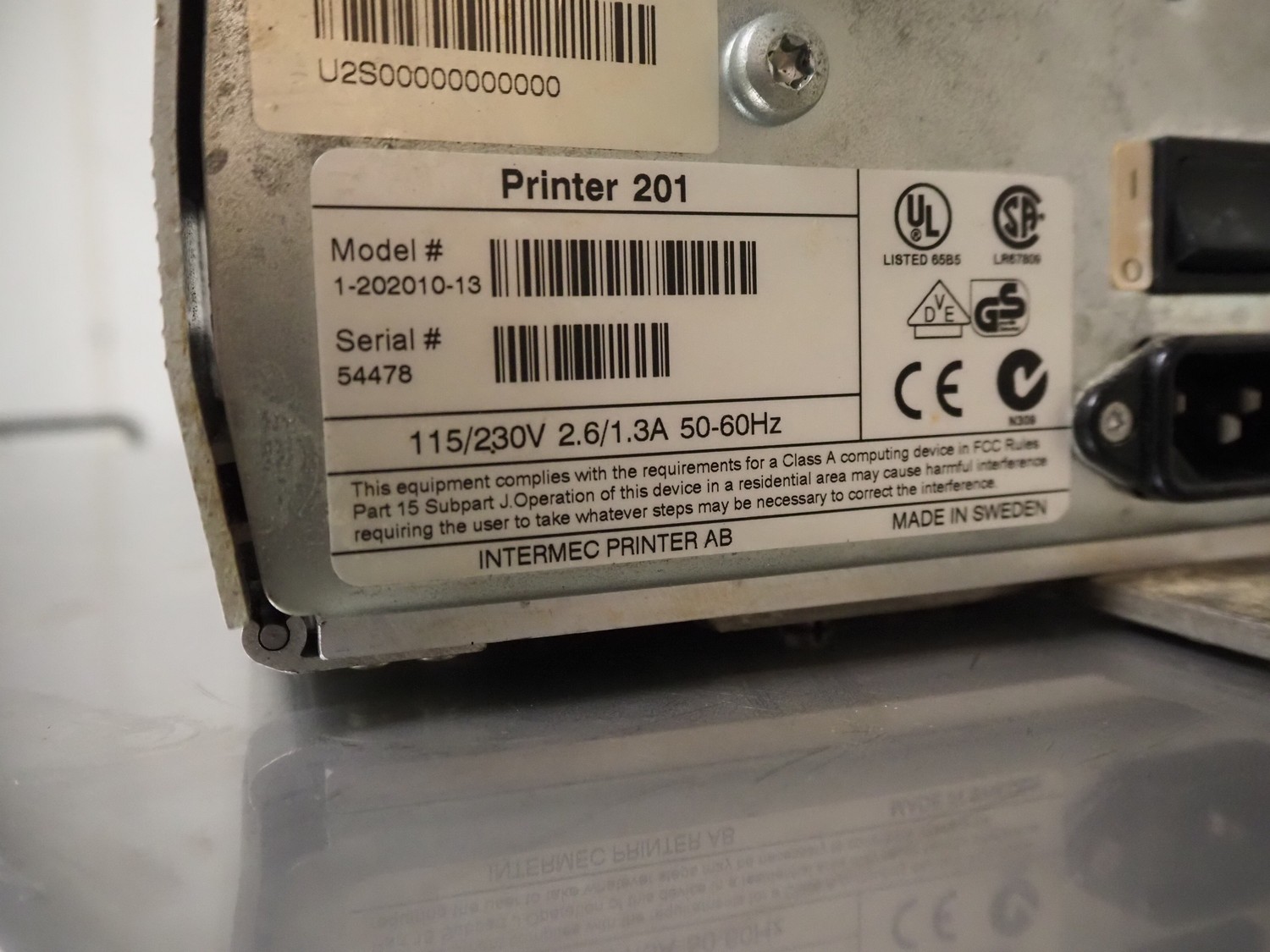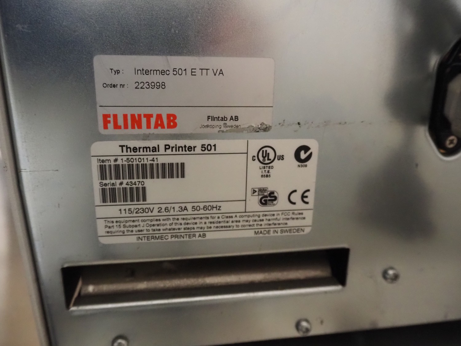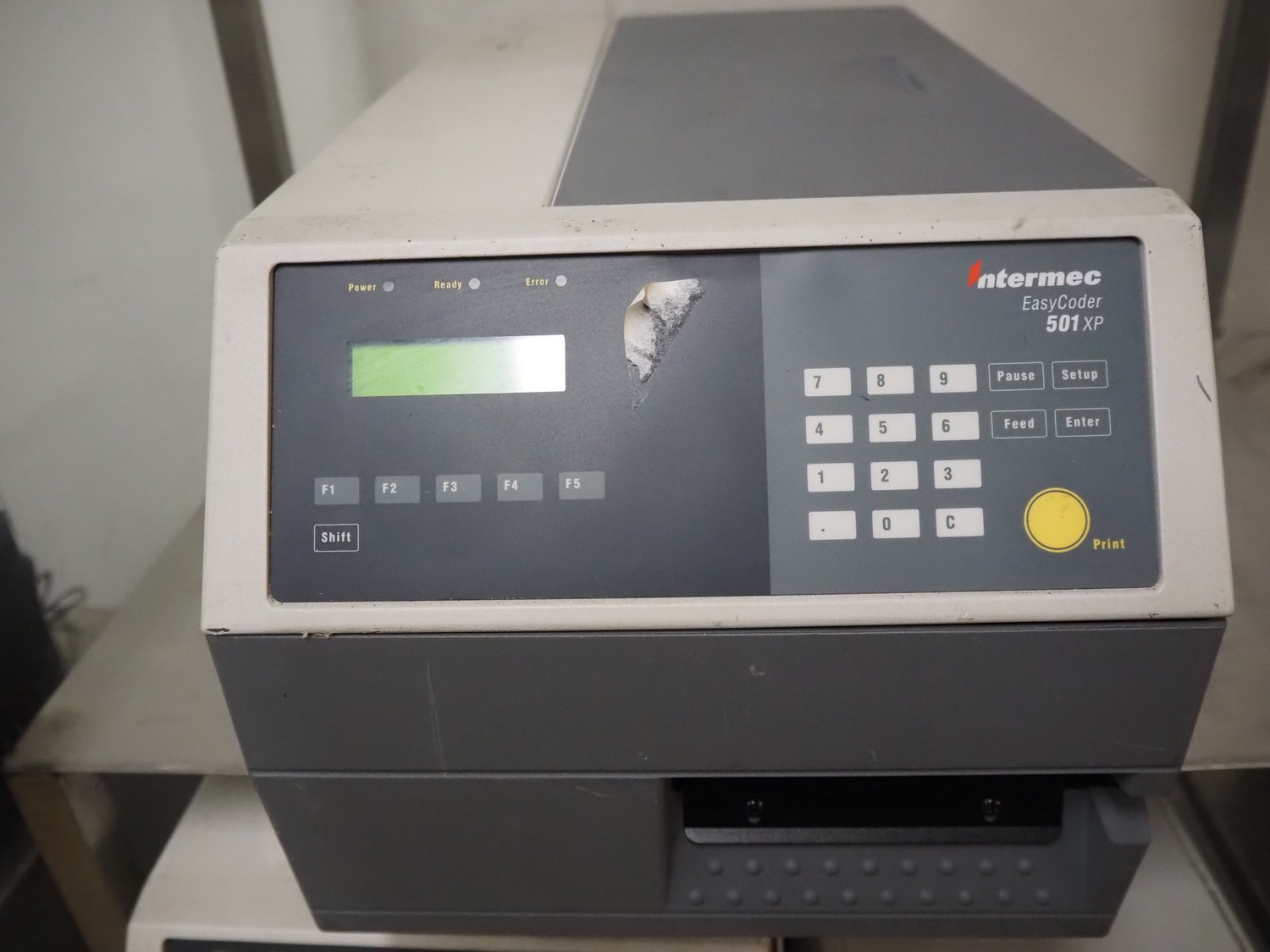 Mobile s/s cabinet with 7 Intermec label printers, model: (3x) Easycoder 501 E, (3x) Easycoder 201 IIE and (1x) PF4i, with Flintab control panel and Dell printer, dimensions: 1500 mm x 600 mm x 1820 mm.