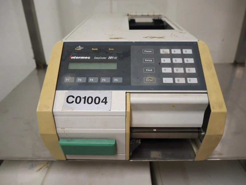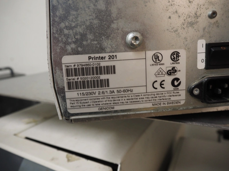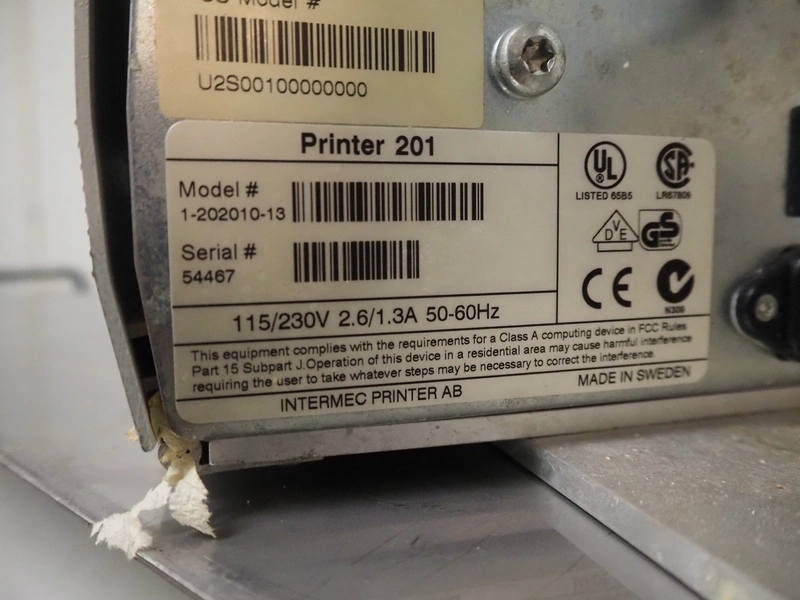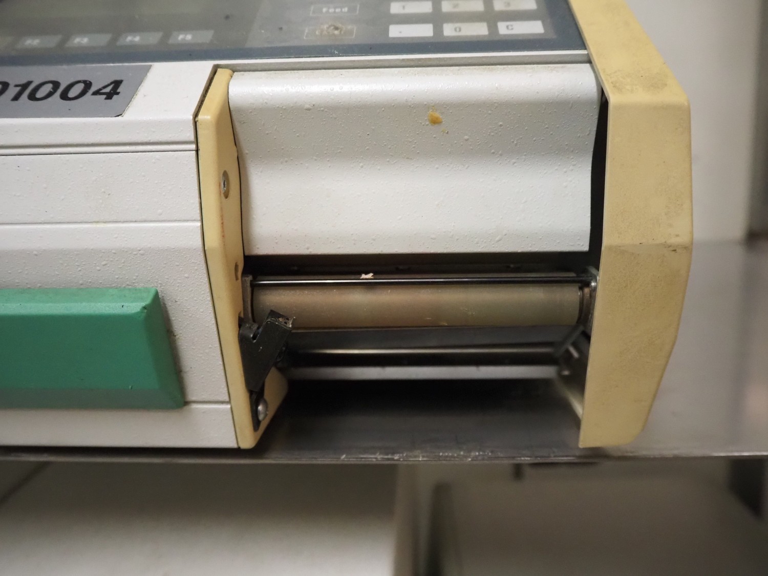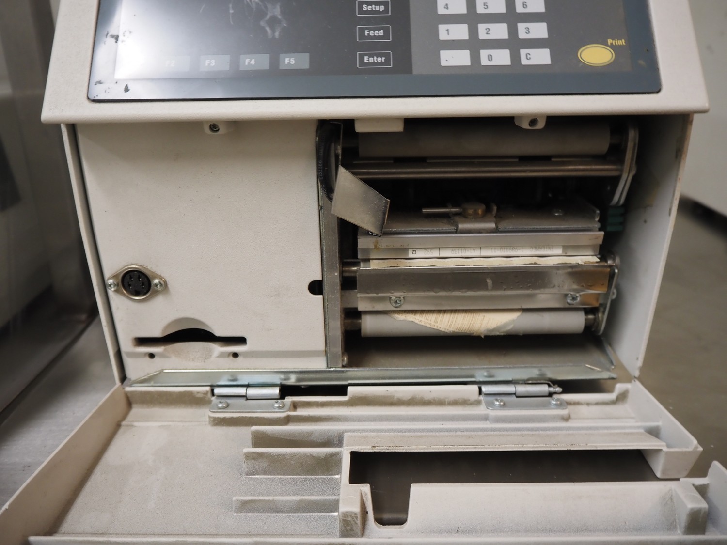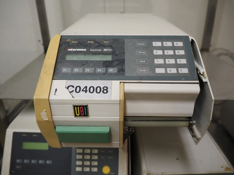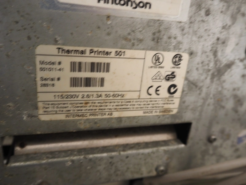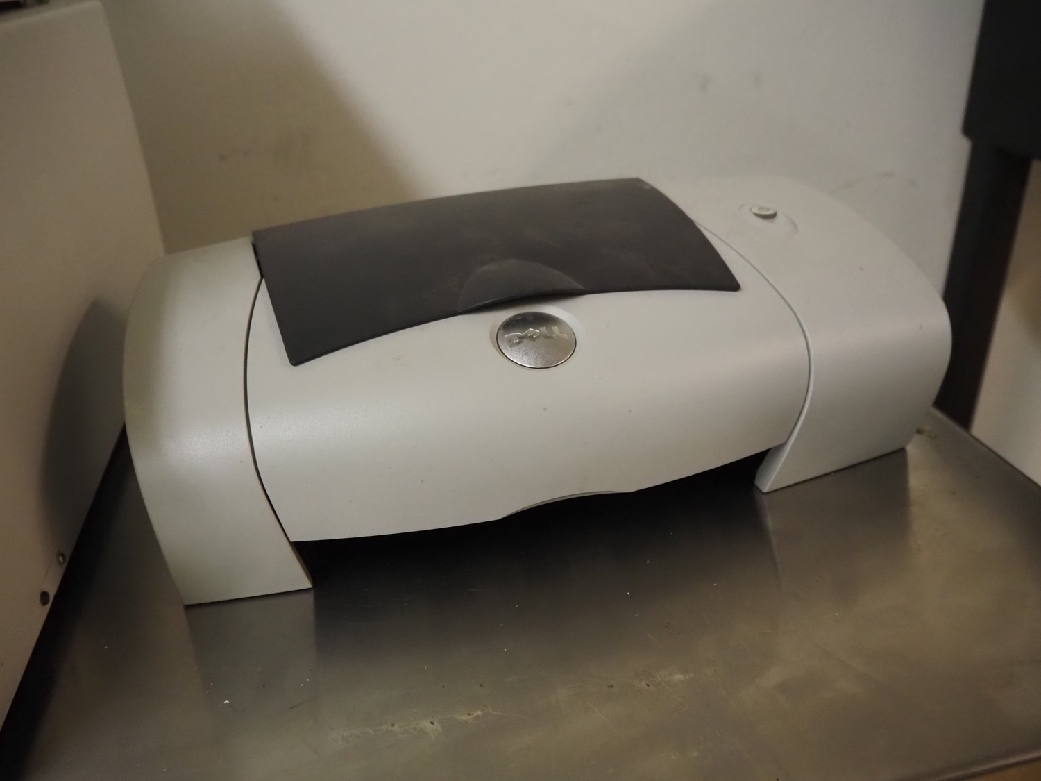 Mobile s/s cabinet with 7 Intermec label printers, model: (3x) Easycoder 501 E, (3x) Easycoder 201 IIE and (1x) PF4i, with Flintab control panel and Dell printer, dimensions: 1500 mm x 600 mm x 1820 mm.