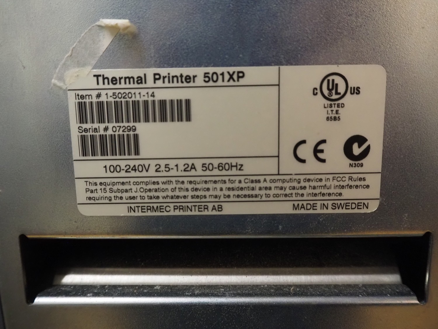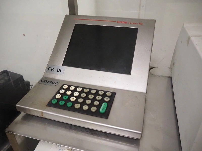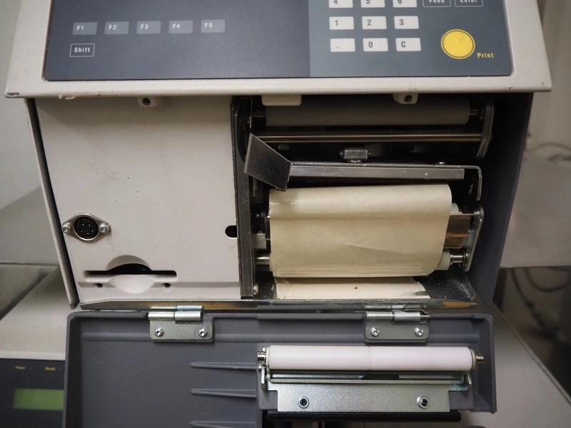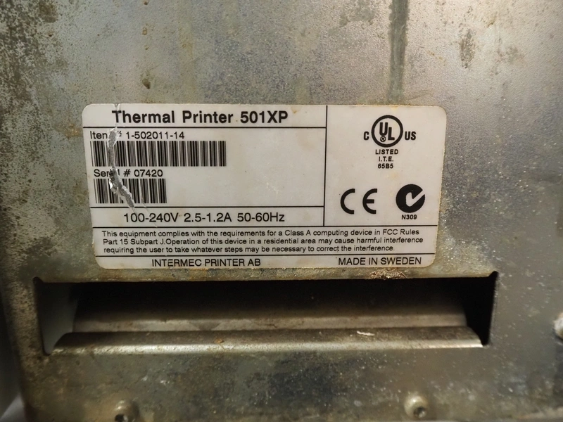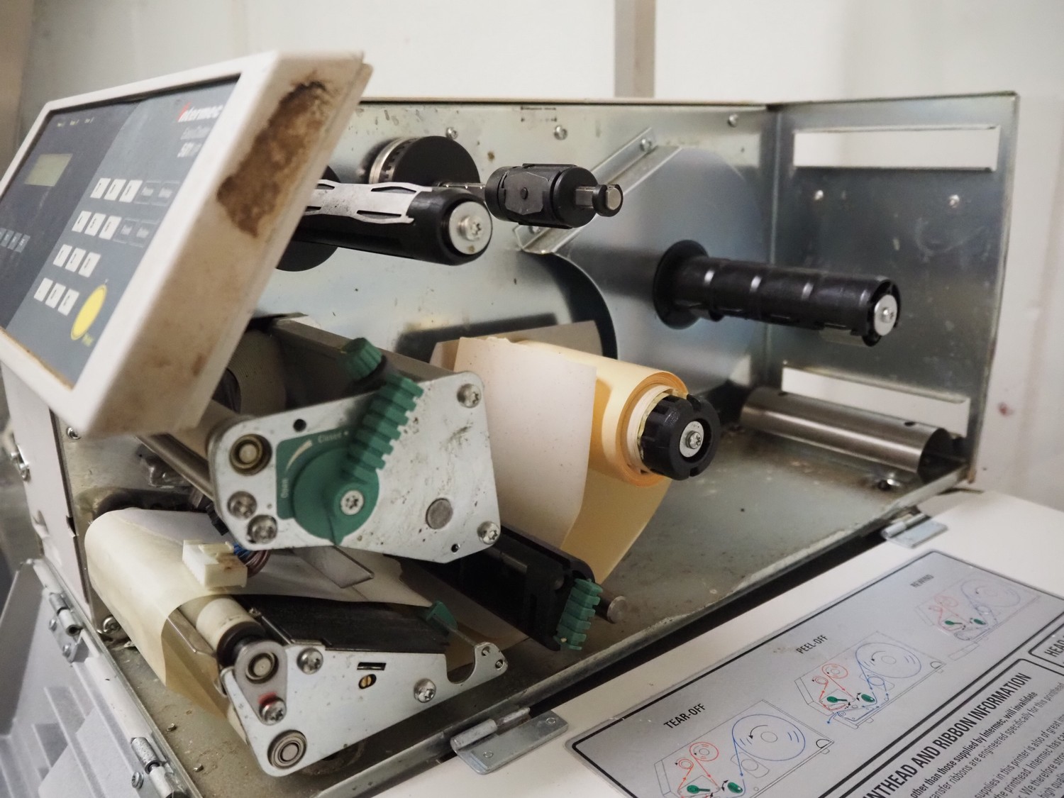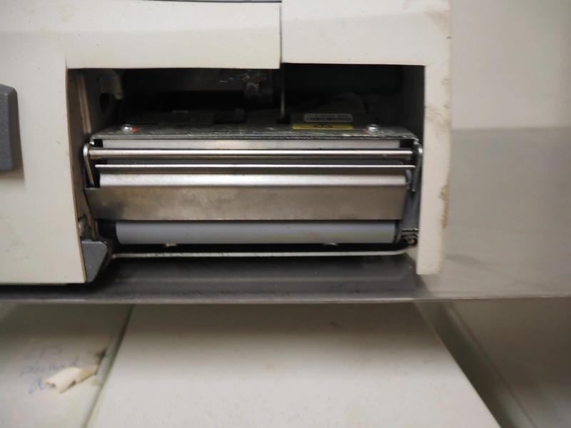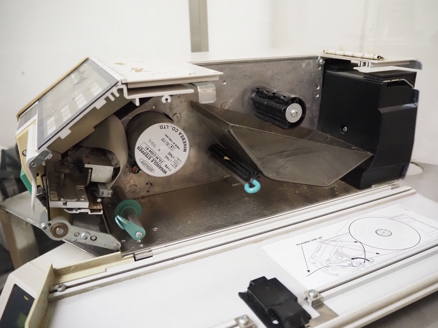 Mobile s/s cabinet with 7 Intermec label printers, model: (3x) Easycoder 501 E, (3x) Easycoder 201 IIE and (1x) PF4i, with Flintab control panel and Dell printer, dimensions: 1500 mm x 600 mm x 1820 mm.