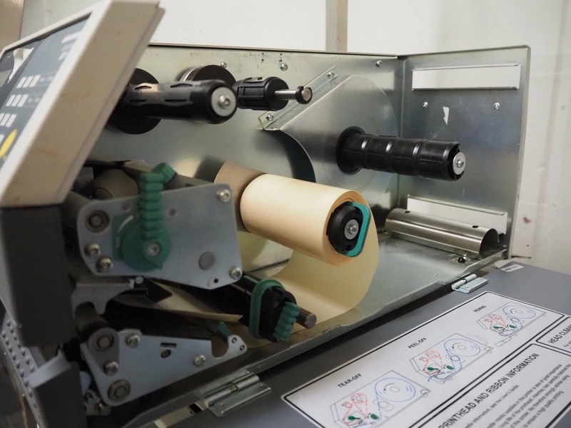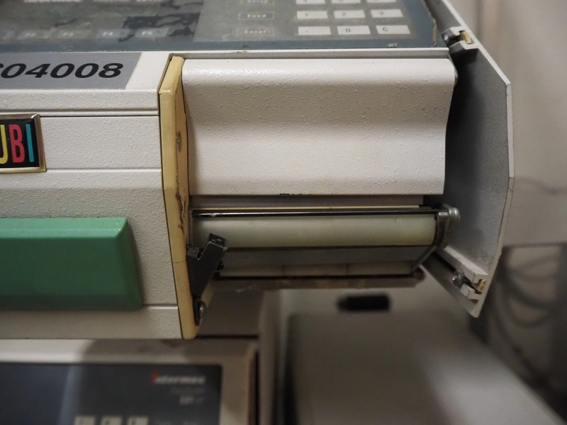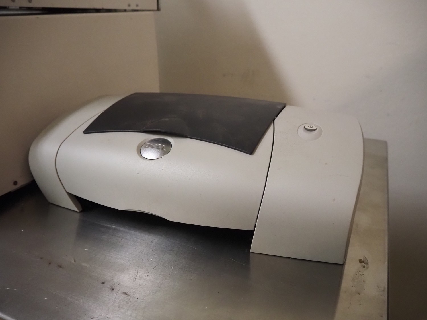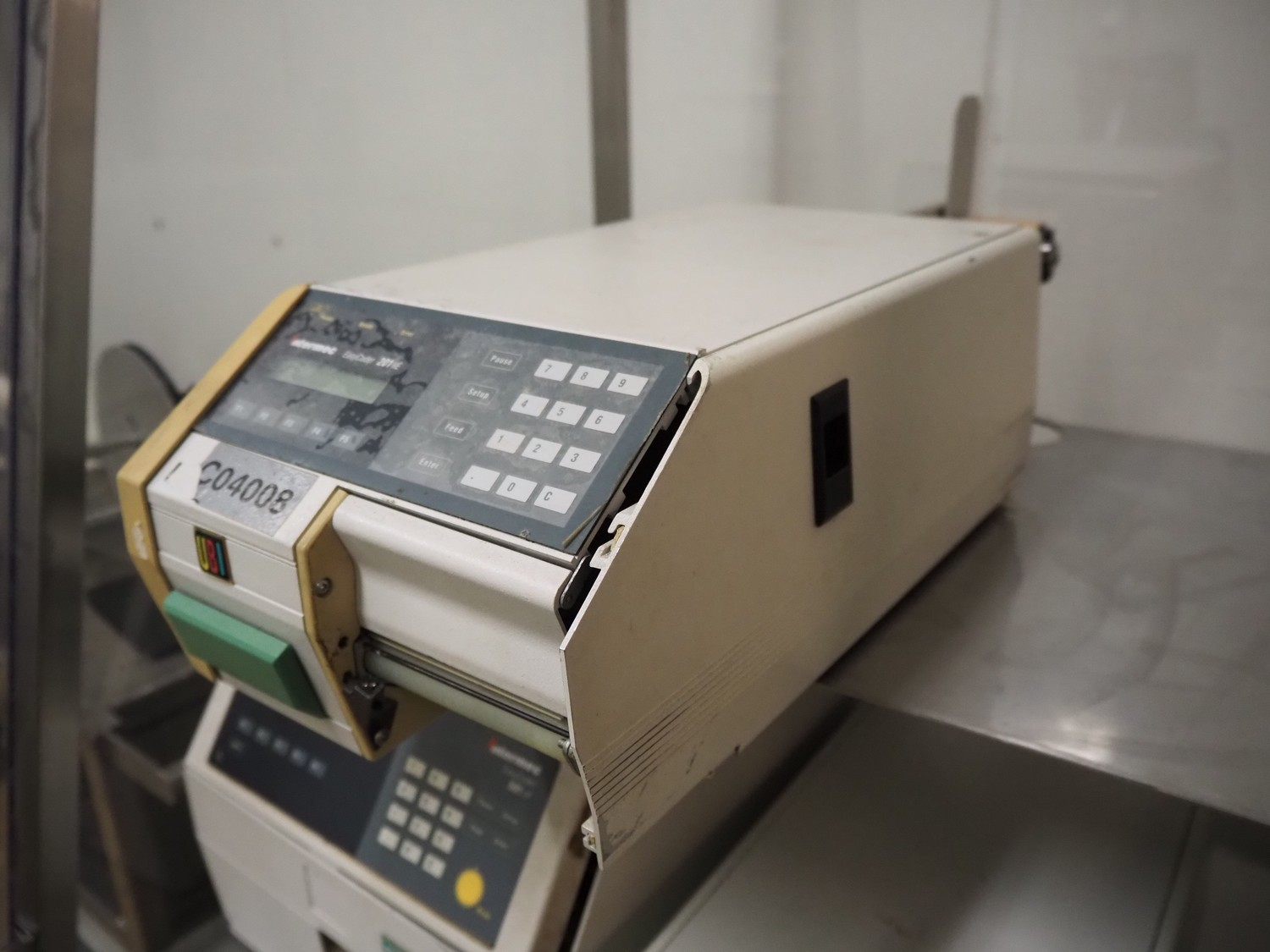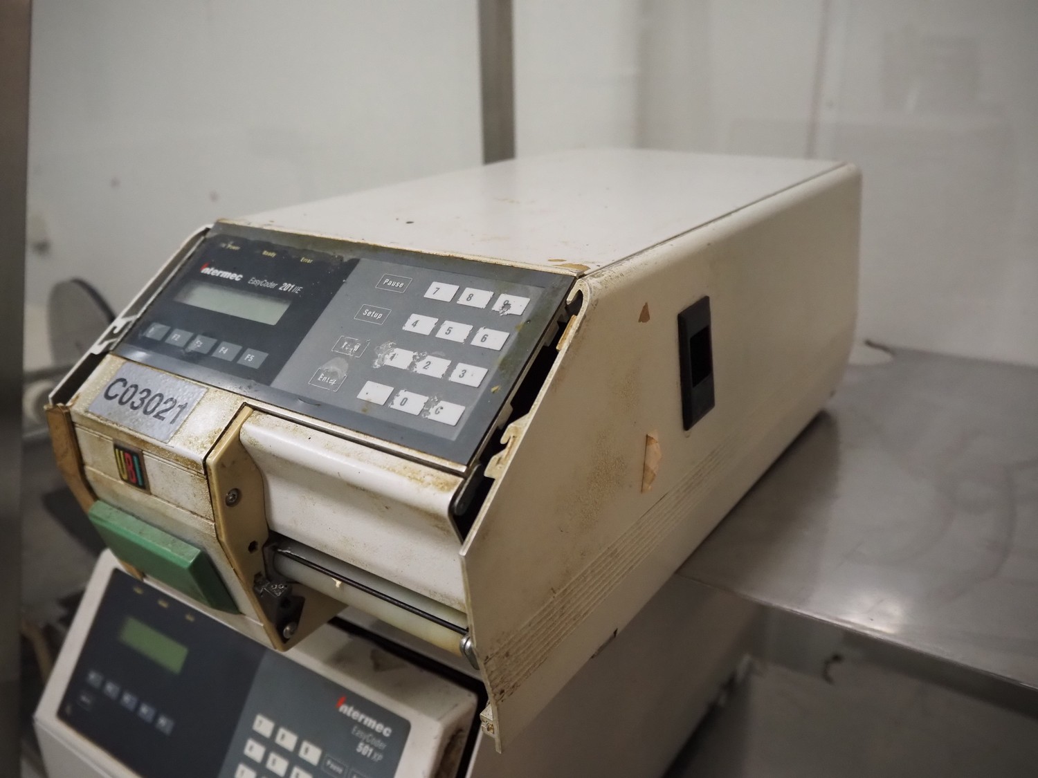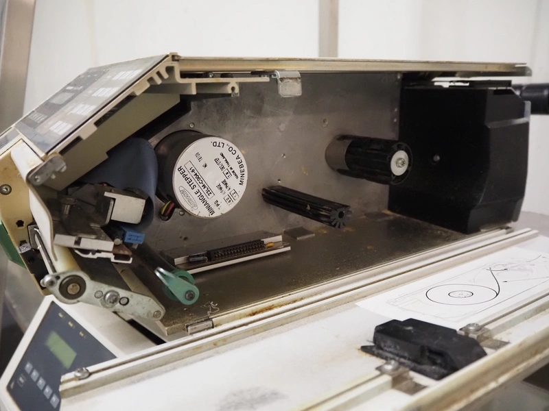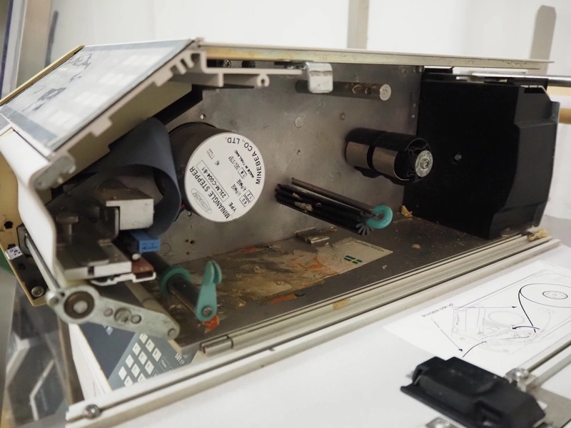 Mobile s/s cabinet with 7 Intermec label printers, model: (3x) Easycoder 501 E, (3x) Easycoder 201 IIE and (1x) PF4i, with Flintab control panel and Dell printer, dimensions: 1500 mm x 600 mm x 1820 mm.
