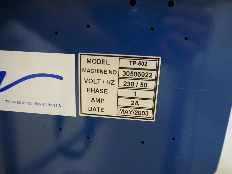Hacla mobile binding machine, model: TP-502, machine number: 30506922, year of construction: May 2003, 230 V, 1 Ph, 50 Hz, 2 A, dimensions: 850 mm x 570 mm x 900 mm.
