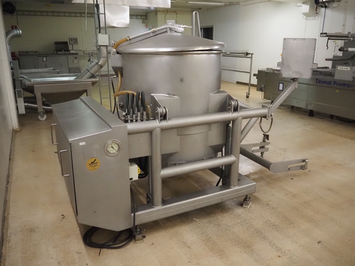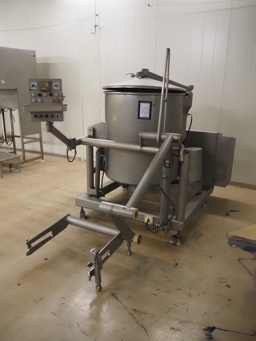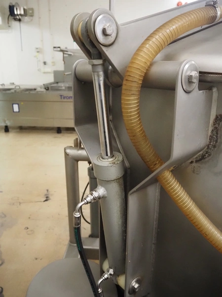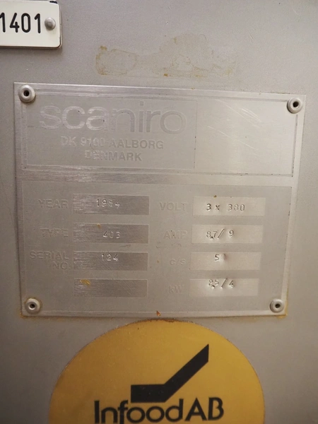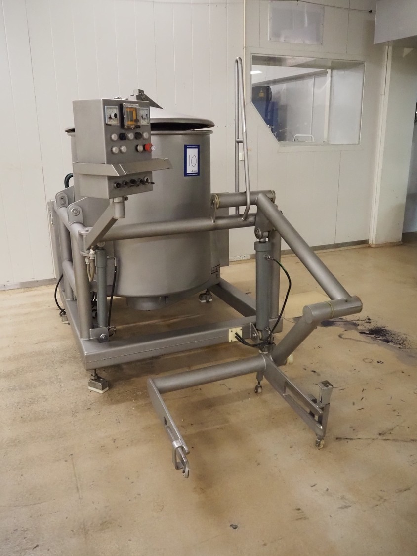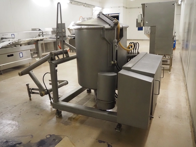Scaniro vacuum mixer with lifter for 200 liter meat bins, type: 403, serial number: 124, year of construction: 1984, 380 V, 3 Ph, 50 Hz, 8.7/9 A, 2.5/4 kW, capacity: 950 liter, Busch vacuum pump, type: 063-132, capacity: 63 m³ per hour, dimensions: 2900 mm x 1800 mm x 1800 mm.