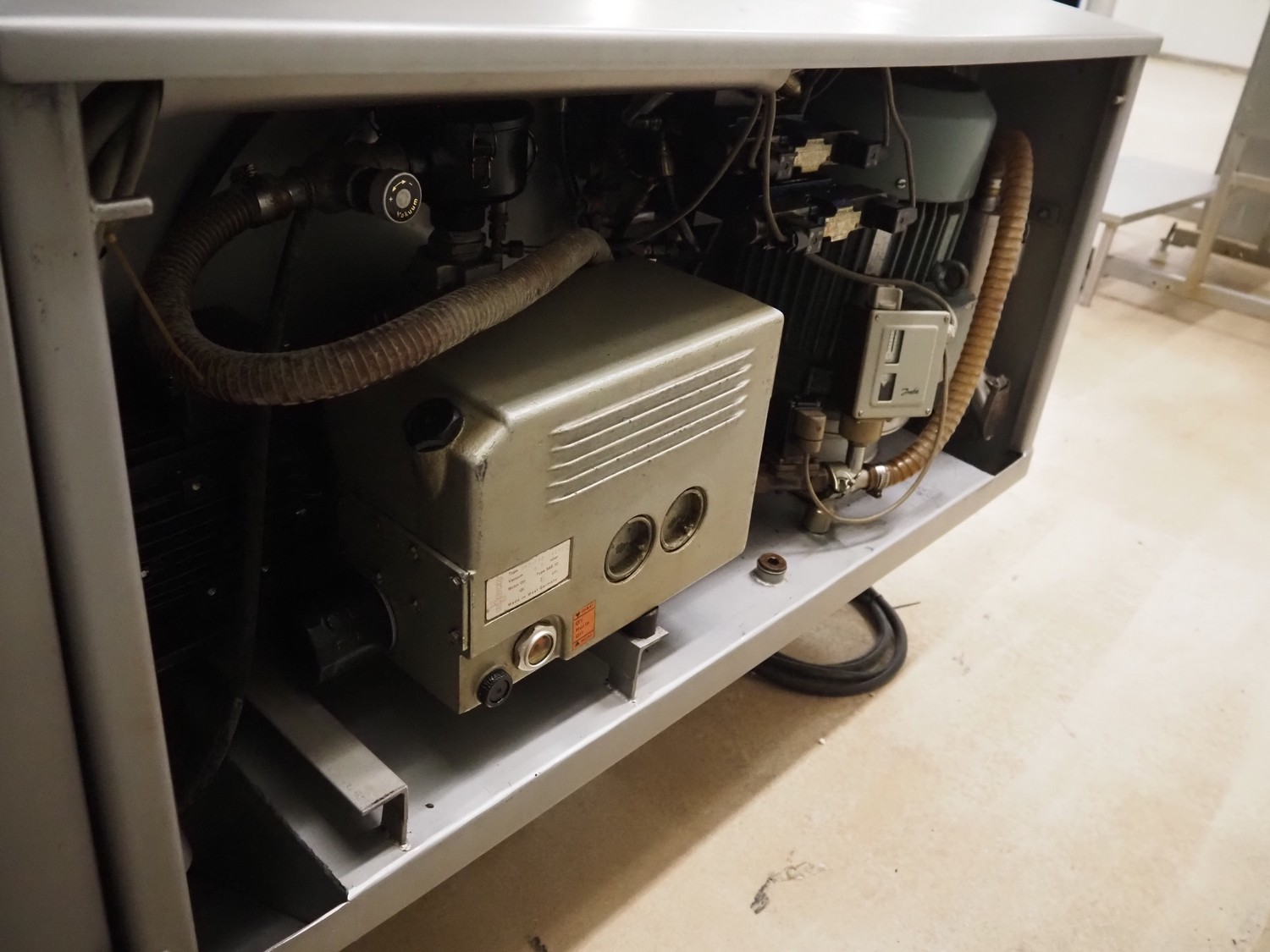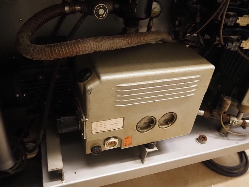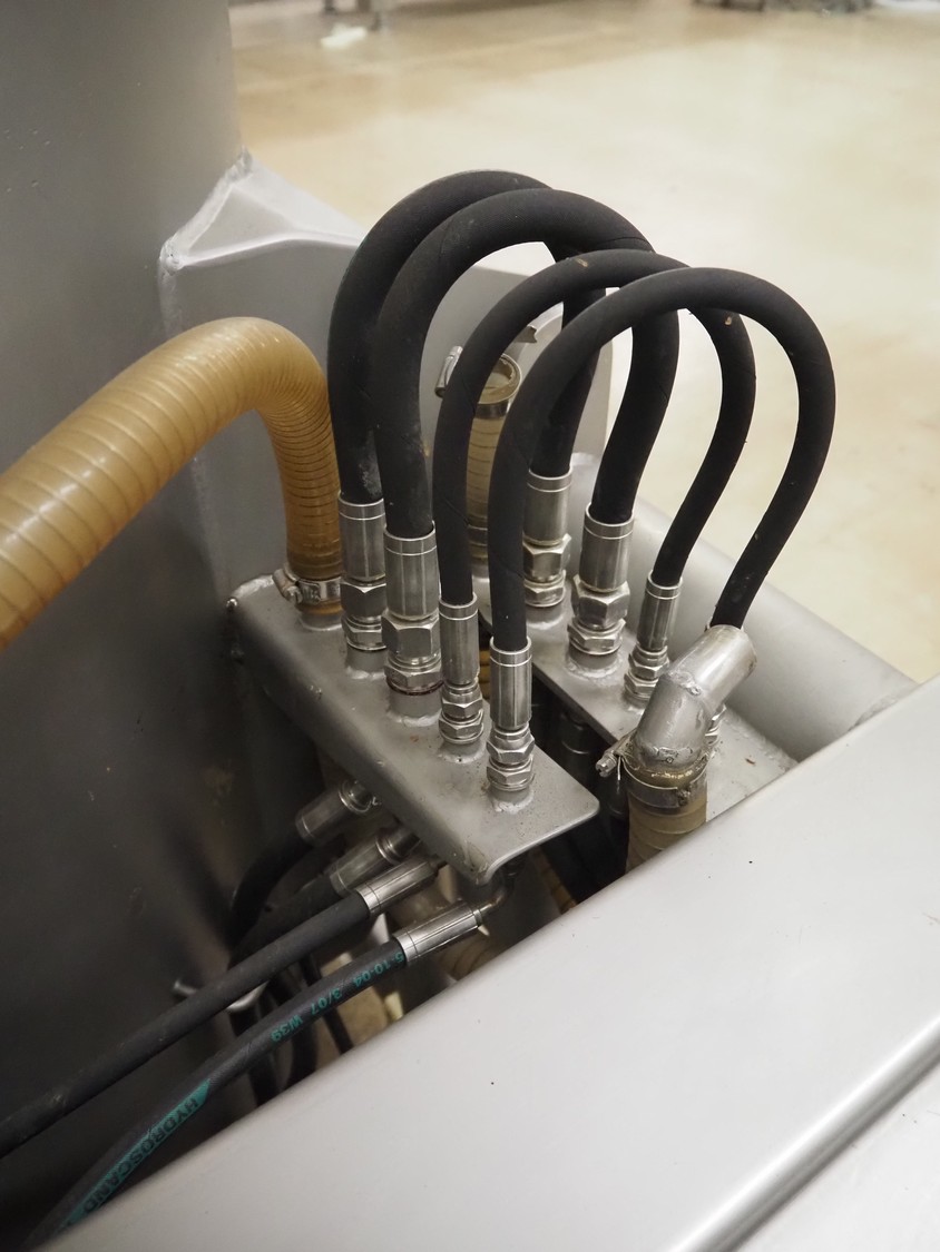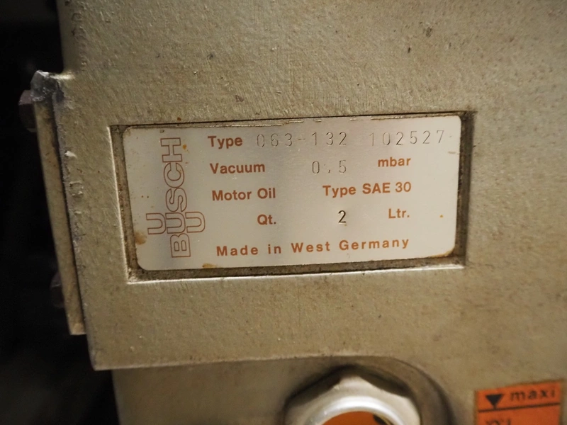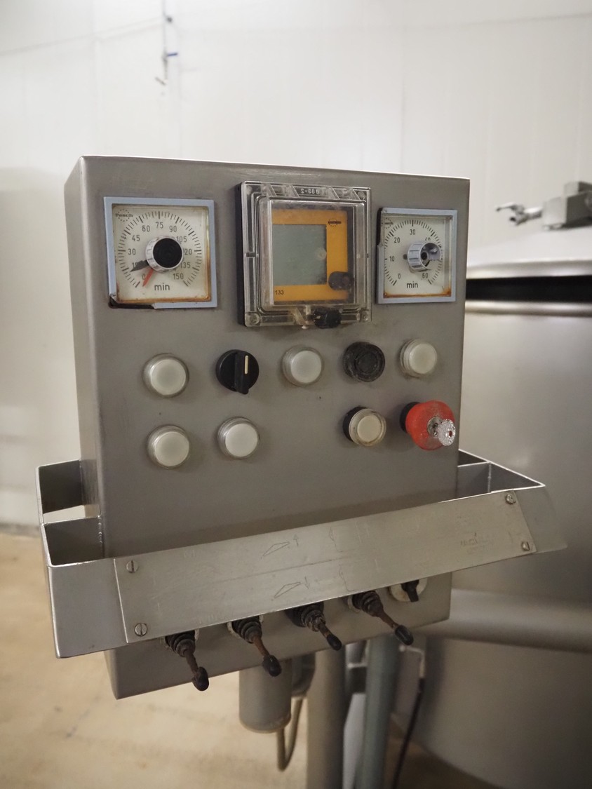 Scaniro vacuum mixer with lifter for 200 liter meat bins, type: 403, serial number: 124, year of construction: 1984, 380 V, 3 Ph, 50 Hz, 8.7/9 A, 2.5/4 kW, capacity: 950 liter, Busch vacuum pump, type: 063-132, capacity: 63 m³ per hour, dimensions: 2900 mm x 1800 mm x 1800 mm.