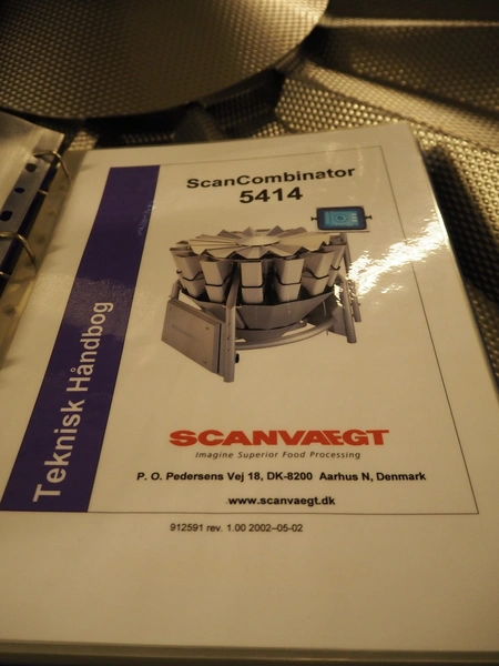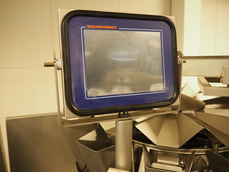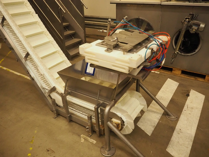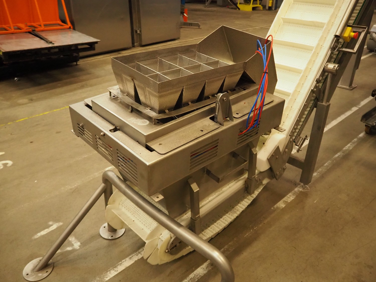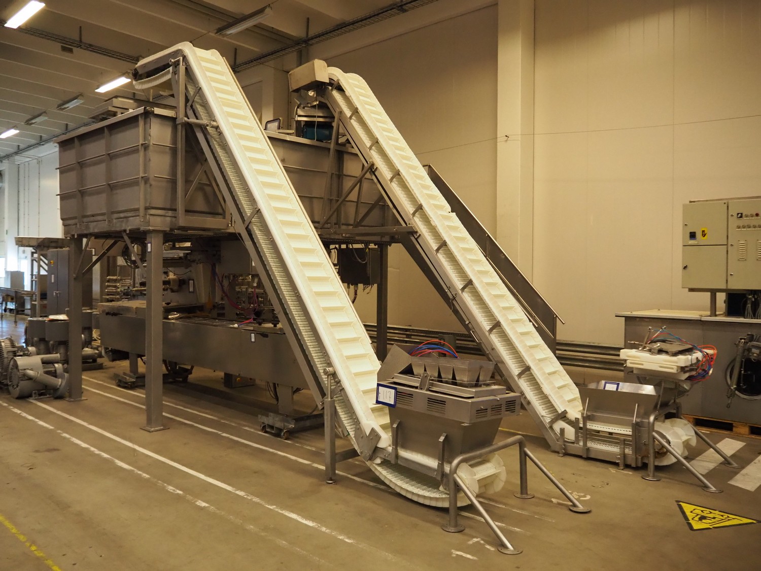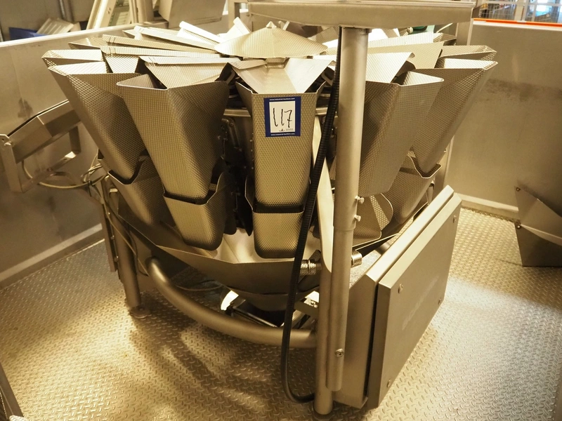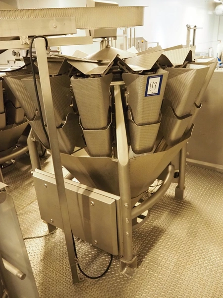 Multihead weighing installation consisting of 2 elevating belts with dividers, s/s frame, plastic mesh belt, belt width: 320 mm, distance between dividers: 145 mm, divider height: 50 mm, elevating height: 3900 mm, 2 s/s vibrating gutters, gutter width: 360 mm, dimensions: (2x) 1600 mm x 600 mm x 1600 mm, 2 Scanvaegt 14-heads multihead weighers, model: ScanCombinator, type: 5414, serial number: BLS 00154, year of construction: 2002, dimensions: (2x) 1400 mm x 1600 mm x1730 mm and s/s platform with stairs, 13 steps, dimensions: 4600 mm x 4400 mm x 3150 mm.