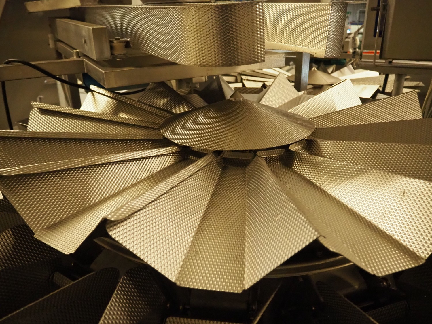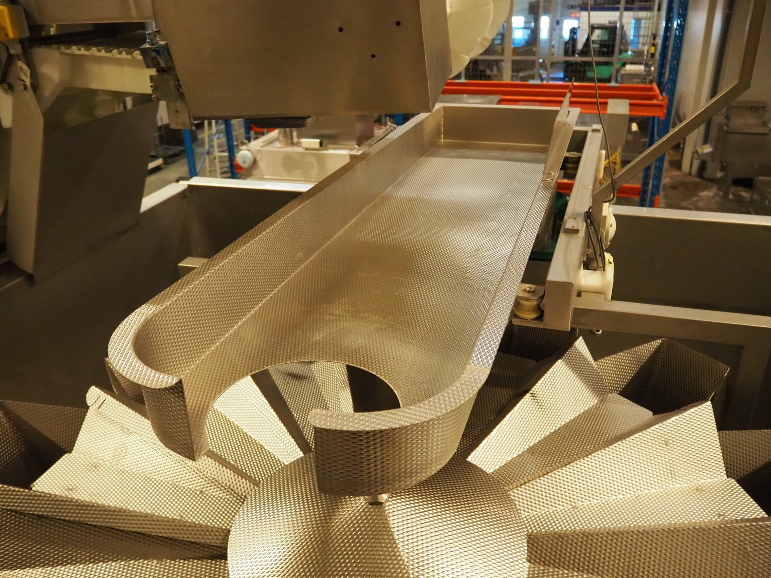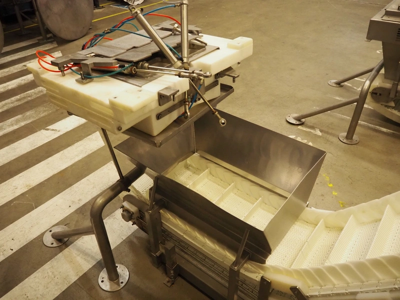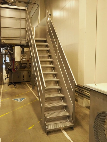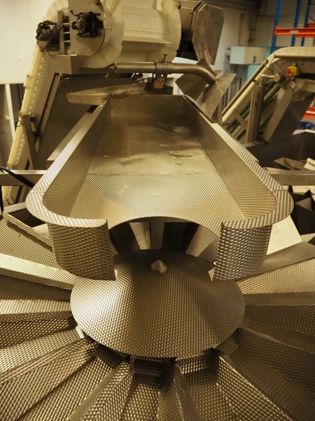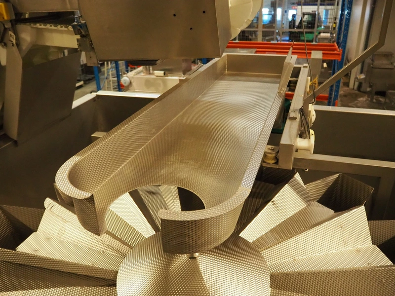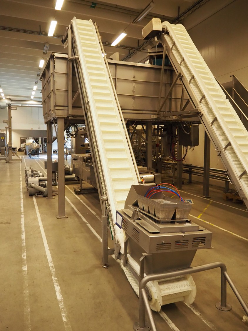 Multihead weighing installation consisting of 2 elevating belts with dividers, s/s frame, plastic mesh belt, belt width: 320 mm, distance between dividers: 145 mm, divider height: 50 mm, elevating height: 3900 mm, 2 s/s vibrating gutters, gutter width: 360 mm, dimensions: (2x) 1600 mm x 600 mm x 1600 mm, 2 Scanvaegt 14-heads multihead weighers, model: ScanCombinator, type: 5414, serial number: BLS 00154, year of construction: 2002, dimensions: (2x) 1400 mm x 1600 mm x1730 mm and s/s platform with stairs, 13 steps, dimensions: 4600 mm x 4400 mm x 3150 mm.