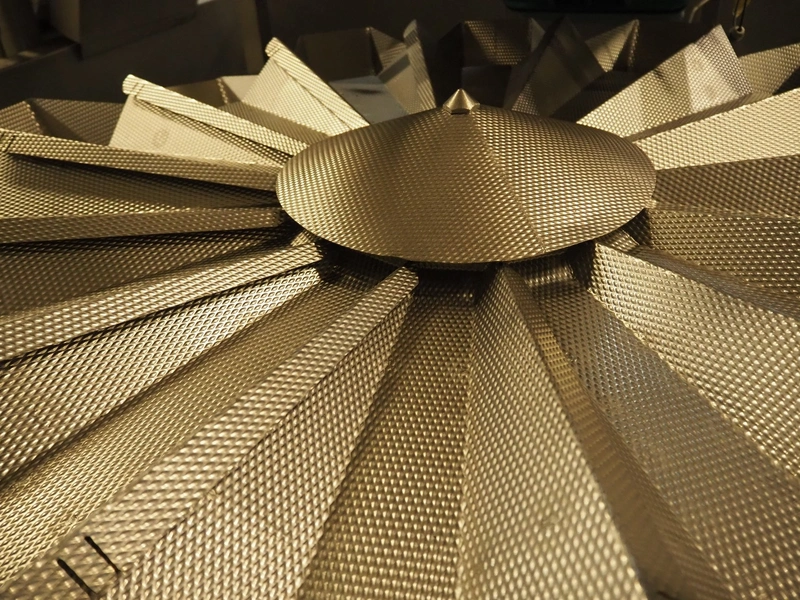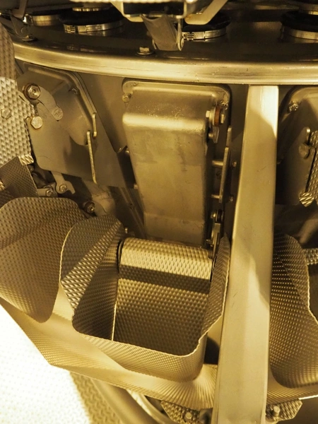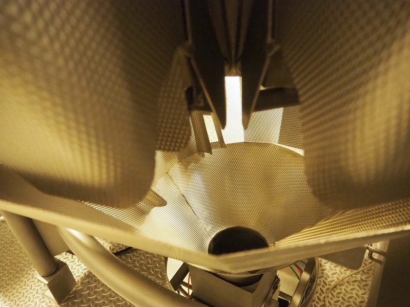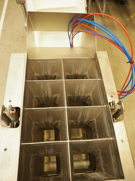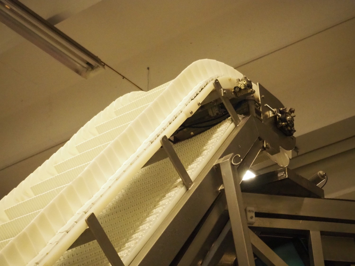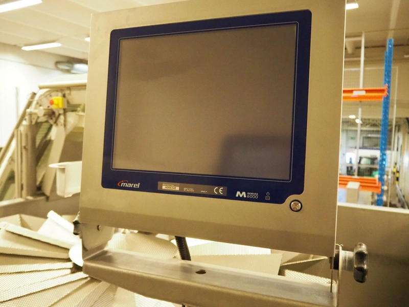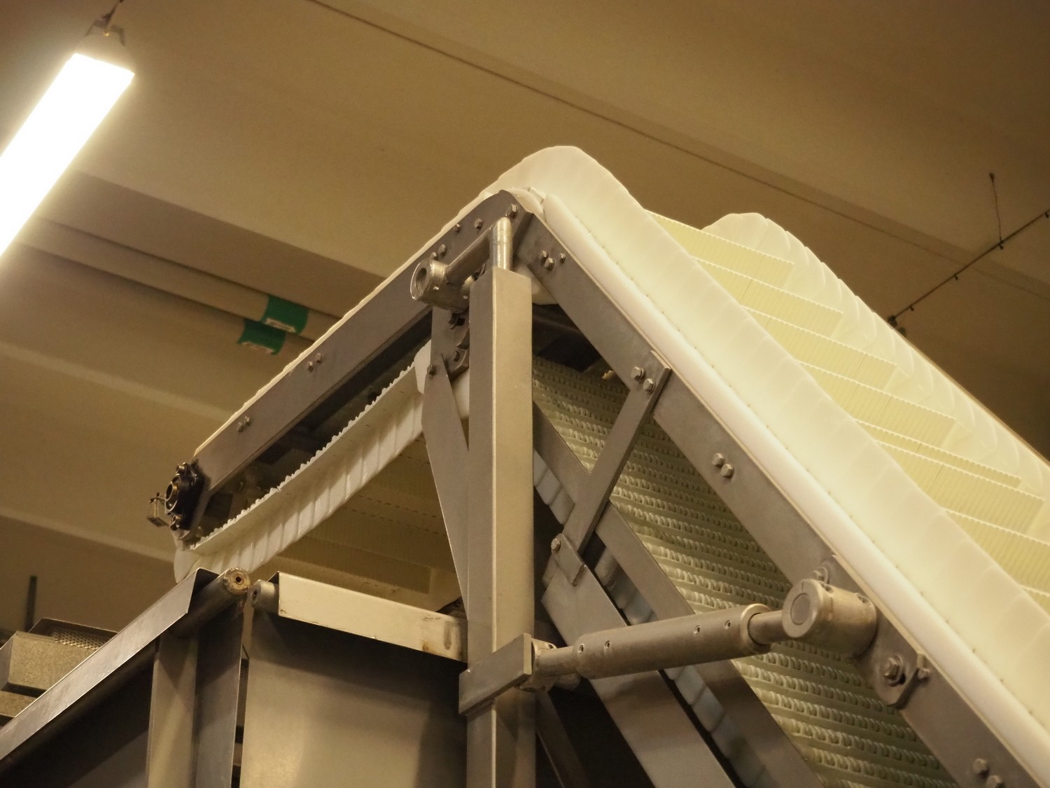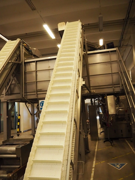 Multihead weighing installation consisting of 2 elevating belts with dividers, s/s frame, plastic mesh belt, belt width: 320 mm, distance between dividers: 145 mm, divider height: 50 mm, elevating height: 3900 mm, 2 s/s vibrating gutters, gutter width: 360 mm, dimensions: (2x) 1600 mm x 600 mm x 1600 mm, 2 Scanvaegt 14-heads multihead weighers, model: ScanCombinator, type: 5414, serial number: BLS 00154, year of construction: 2002, dimensions: (2x) 1400 mm x 1600 mm x1730 mm and s/s platform with stairs, 13 steps, dimensions: 4600 mm x 4400 mm x 3150 mm.