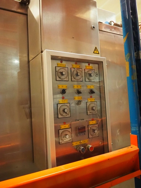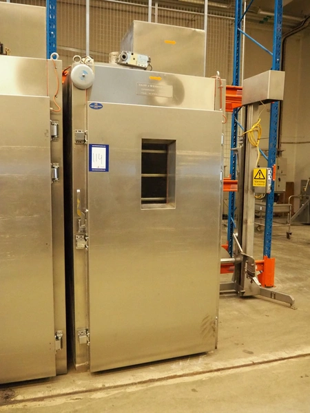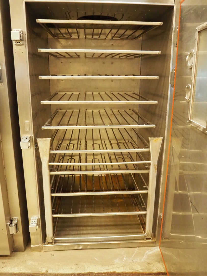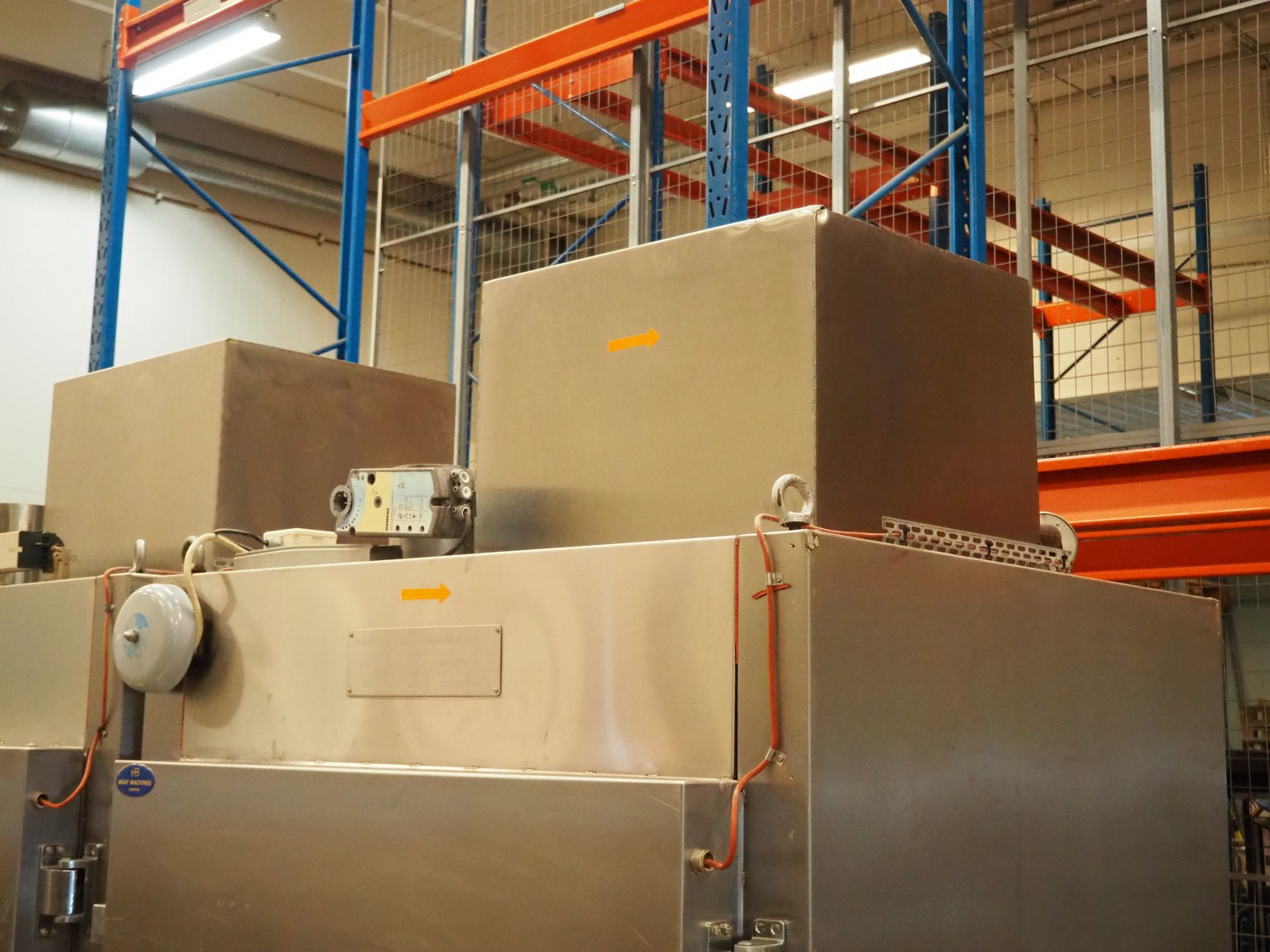 Skov & Weidemann A/S oven, type: E400, number: 3036, 380 V, 3 Ph, 50 Hz, 100 A, 61 kW, 9 integrated floors, dimensions each floor: 930 mm x 920 mm, total dimensions: 1550 mm x 1200 mm x 2900 mm.