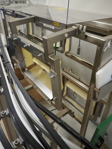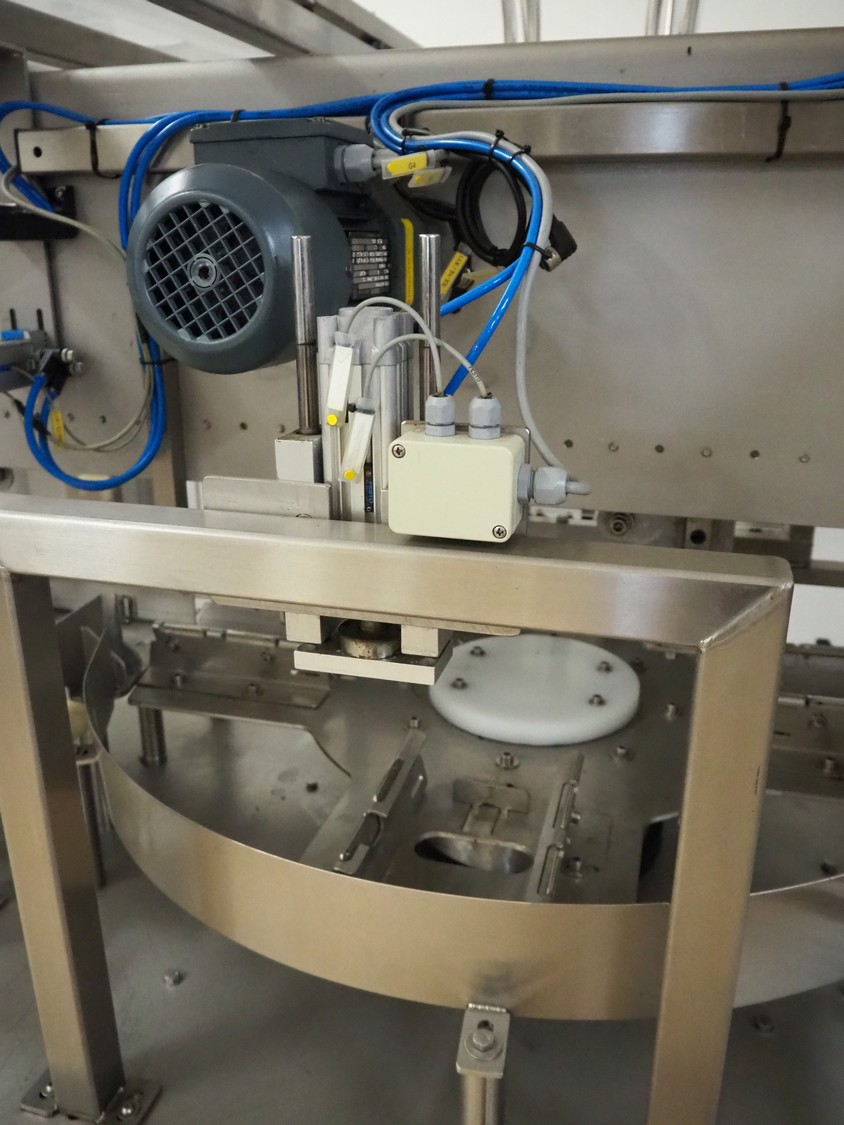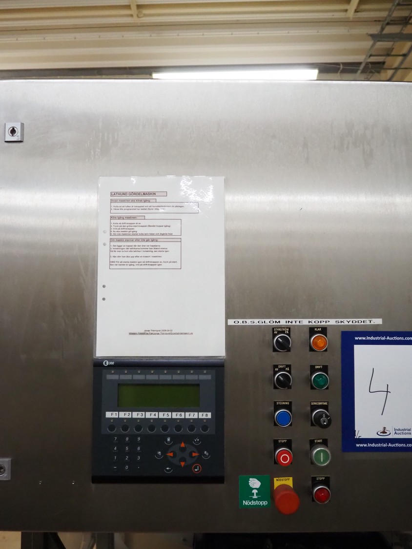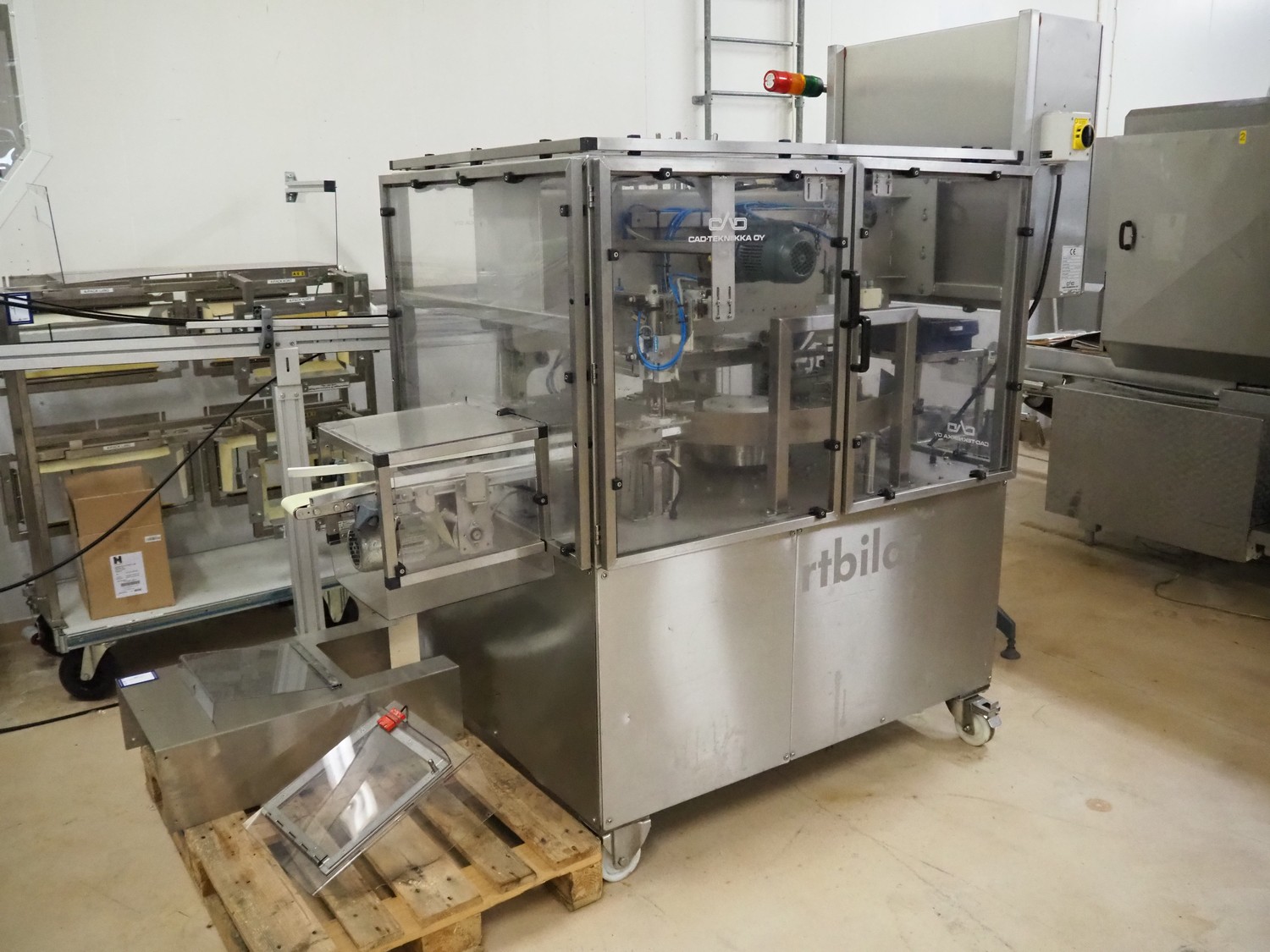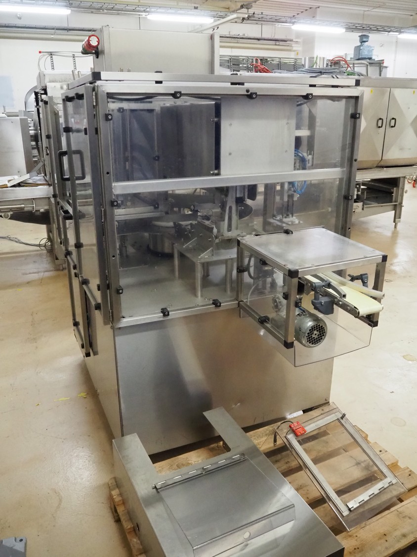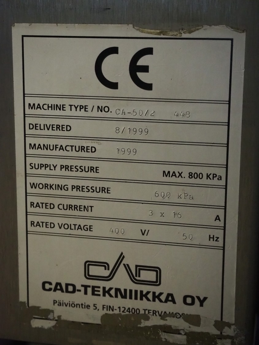 Cad-Tekniikka OY tray closing machine with lid denester, machine type: CA-50/2, number: 448, year of construction: 1999, 400 V, 50 Hz, 3 x 16 A, 600 Kpa, dimensions lids/trays: 200 mm x 170 mm, plastic belt, belt width: 95 mm, total dimensions: 3000 mm x 1200 mm x 2100 mm.