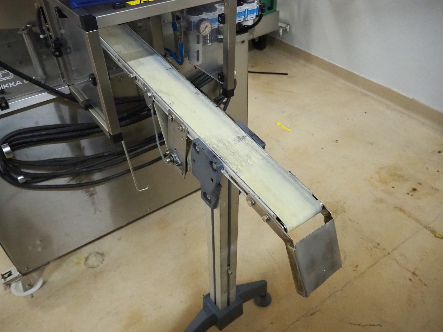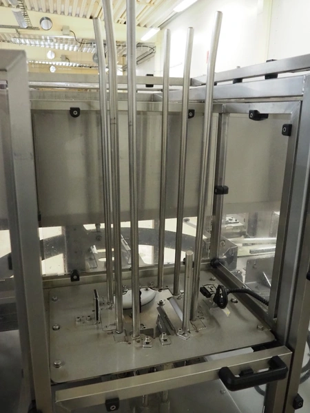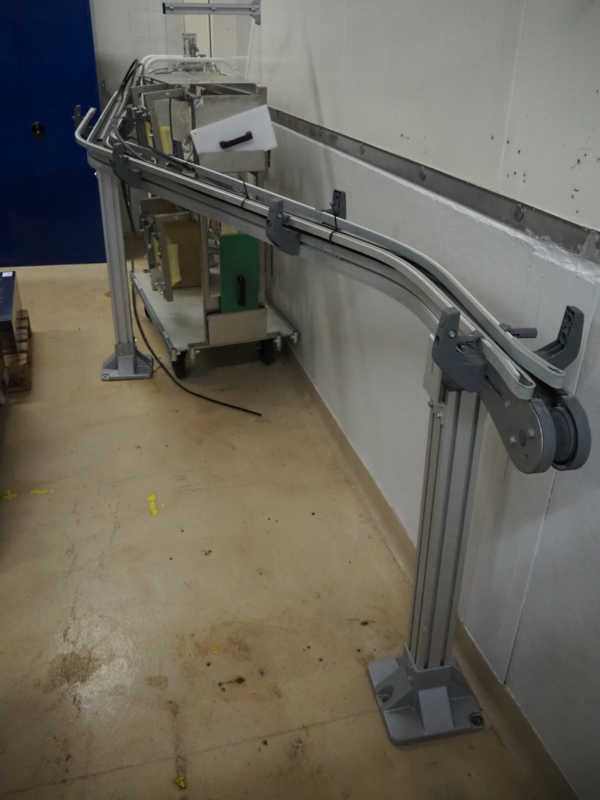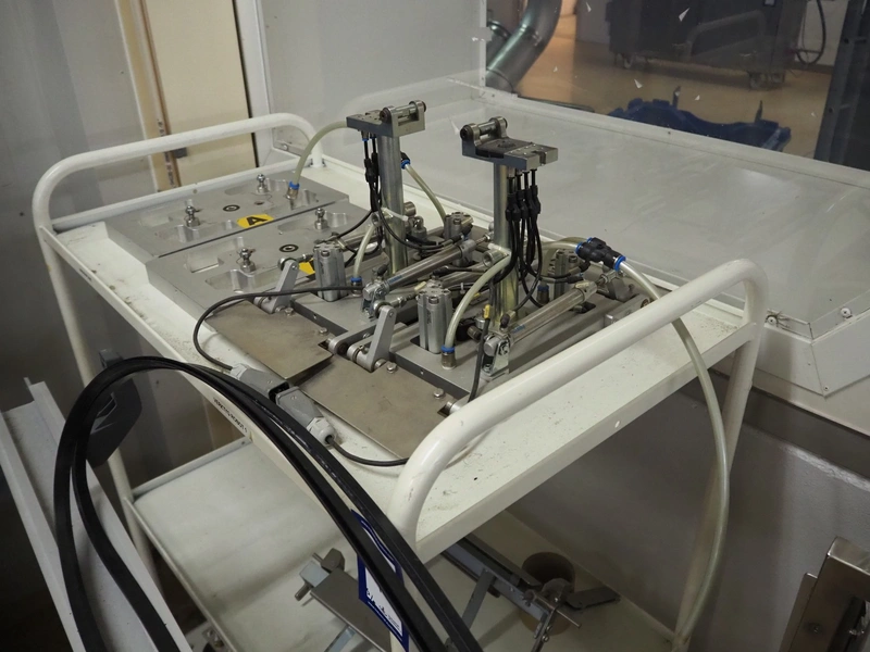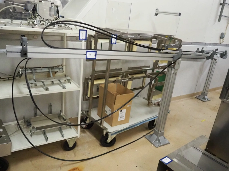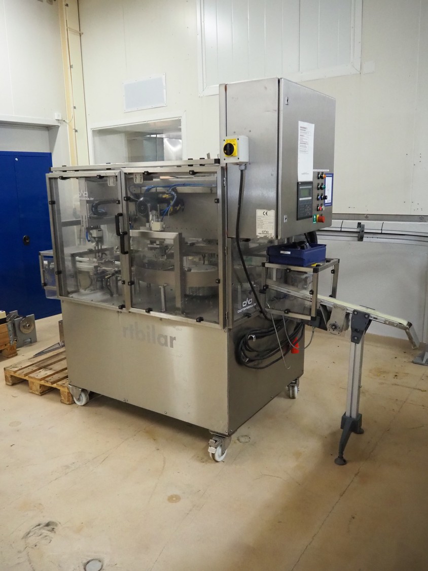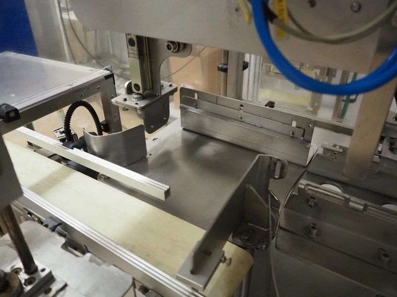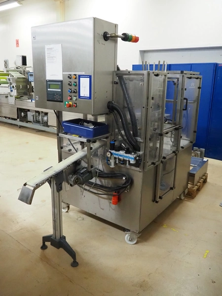 Cad-Tekniikka OY tray closing machine with lid denester, machine type: CA-50/2, number: 448, year of construction: 1999, 400 V, 50 Hz, 3 x 16 A, 600 Kpa, dimensions lids/trays: 200 mm x 170 mm, plastic belt, belt width: 95 mm, total dimensions: 3000 mm x 1200 mm x 2100 mm.