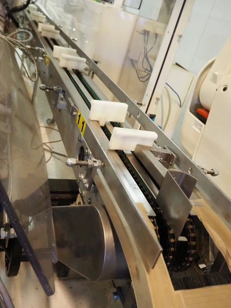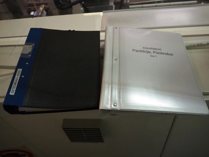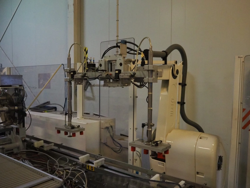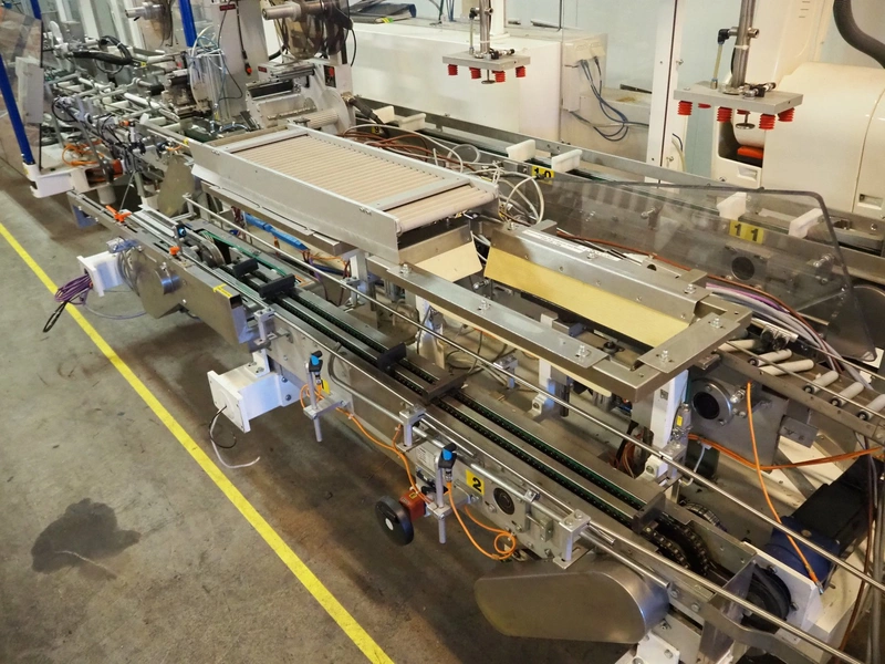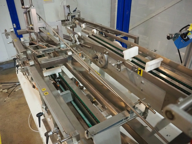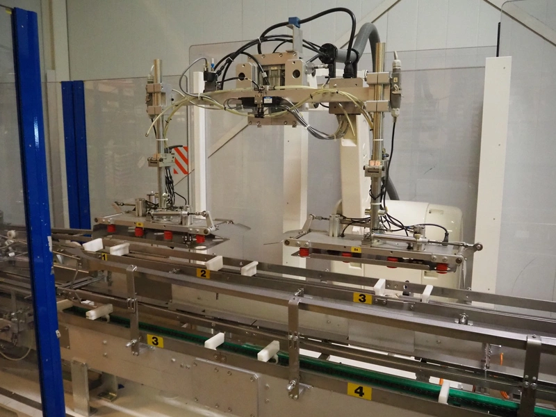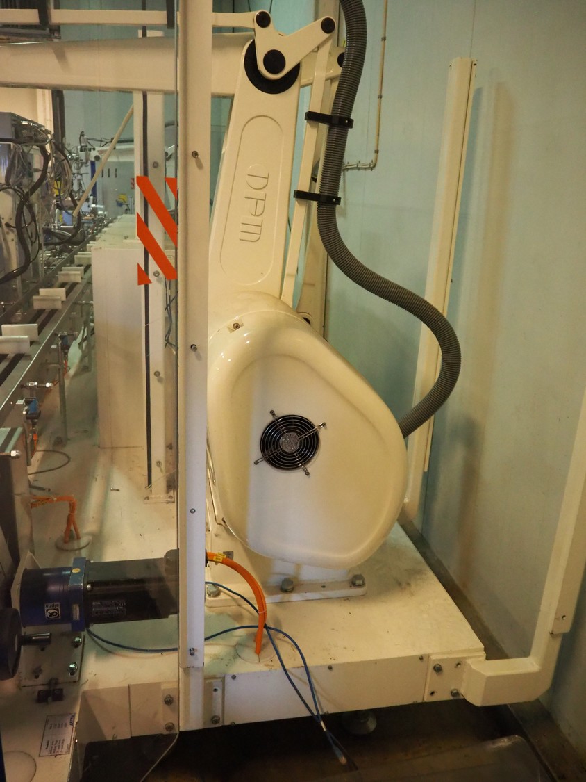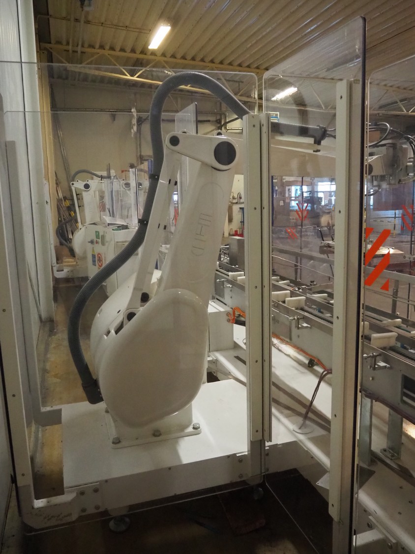 Astra packing robot, type: EQ-P-0058, chain belt with dividers, belt width: (2x) 200 mm, distance between dividers: 550 mm, divider height: 50 mm, 2 mectec labelling machines, 2 OPM robot arms, model: ICC, total dimensions: 10000 mm x 2400 mm x 2100 mm.