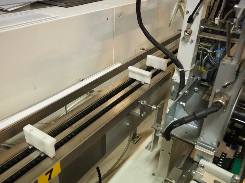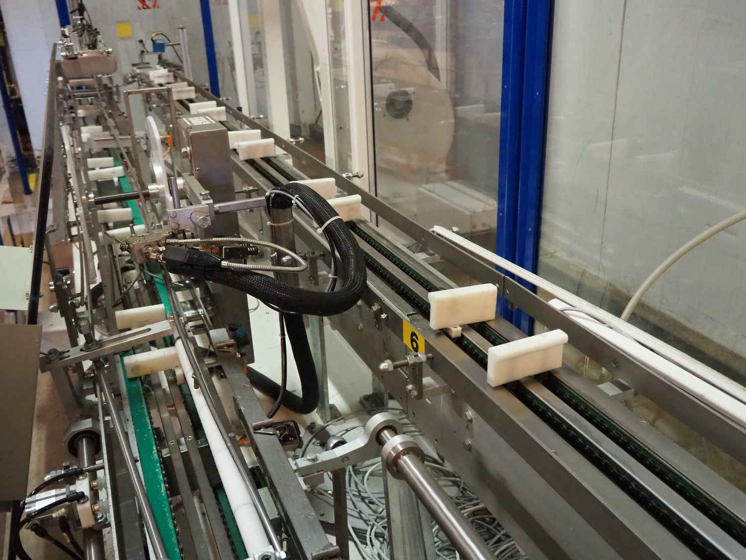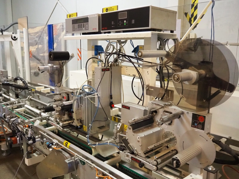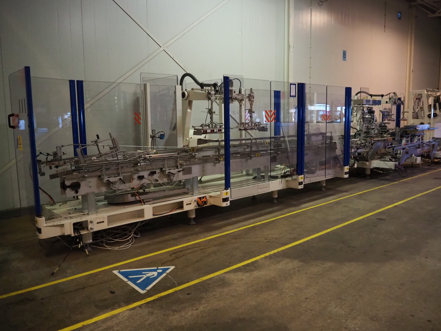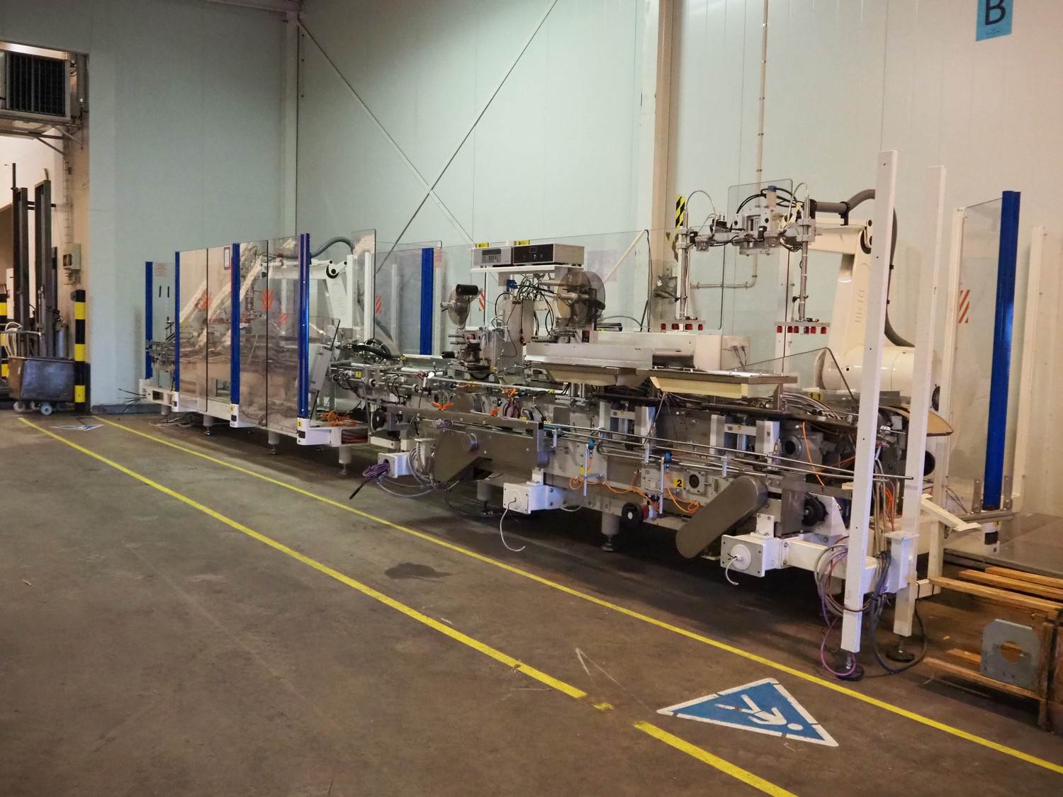 Astra packing robot, type: EQ-P-0058, chain belt with dividers, belt width: (2x) 200 mm, distance between dividers: 550 mm, divider height: 50 mm, 2 mectec labelling machines, 2 OPM robot arms, model: ICC, total dimensions: 10000 mm x 2400 mm x 2100 mm.