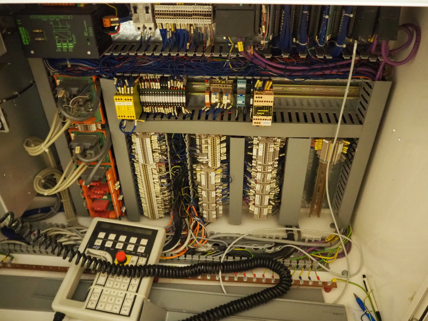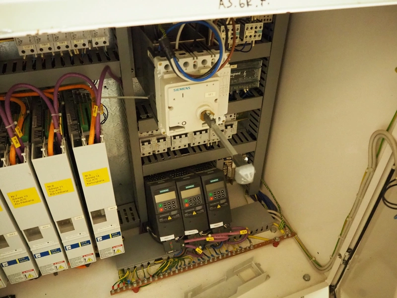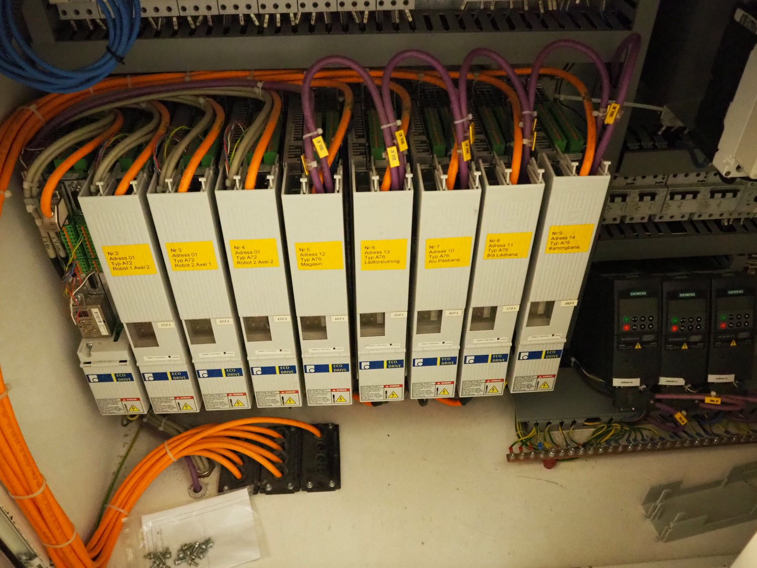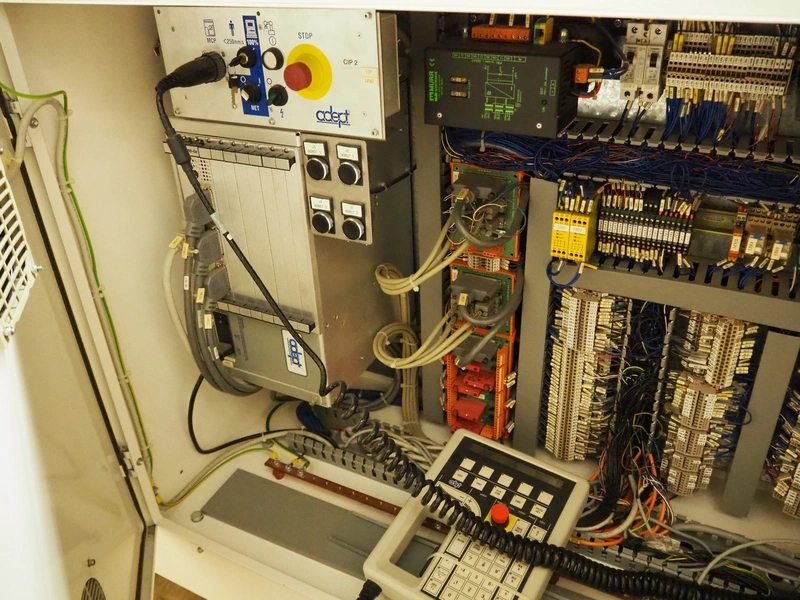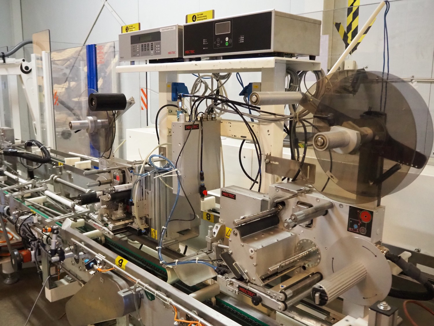 Astra packing robot, type: EQ-P-0058, chain belt with dividers, belt width: (2x) 200 mm, distance between dividers: 550 mm, divider height: 50 mm, 2 mectec labelling machines, 2 OPM robot arms, model: ICC, total dimensions: 10000 mm x 2400 mm x 2100 mm.