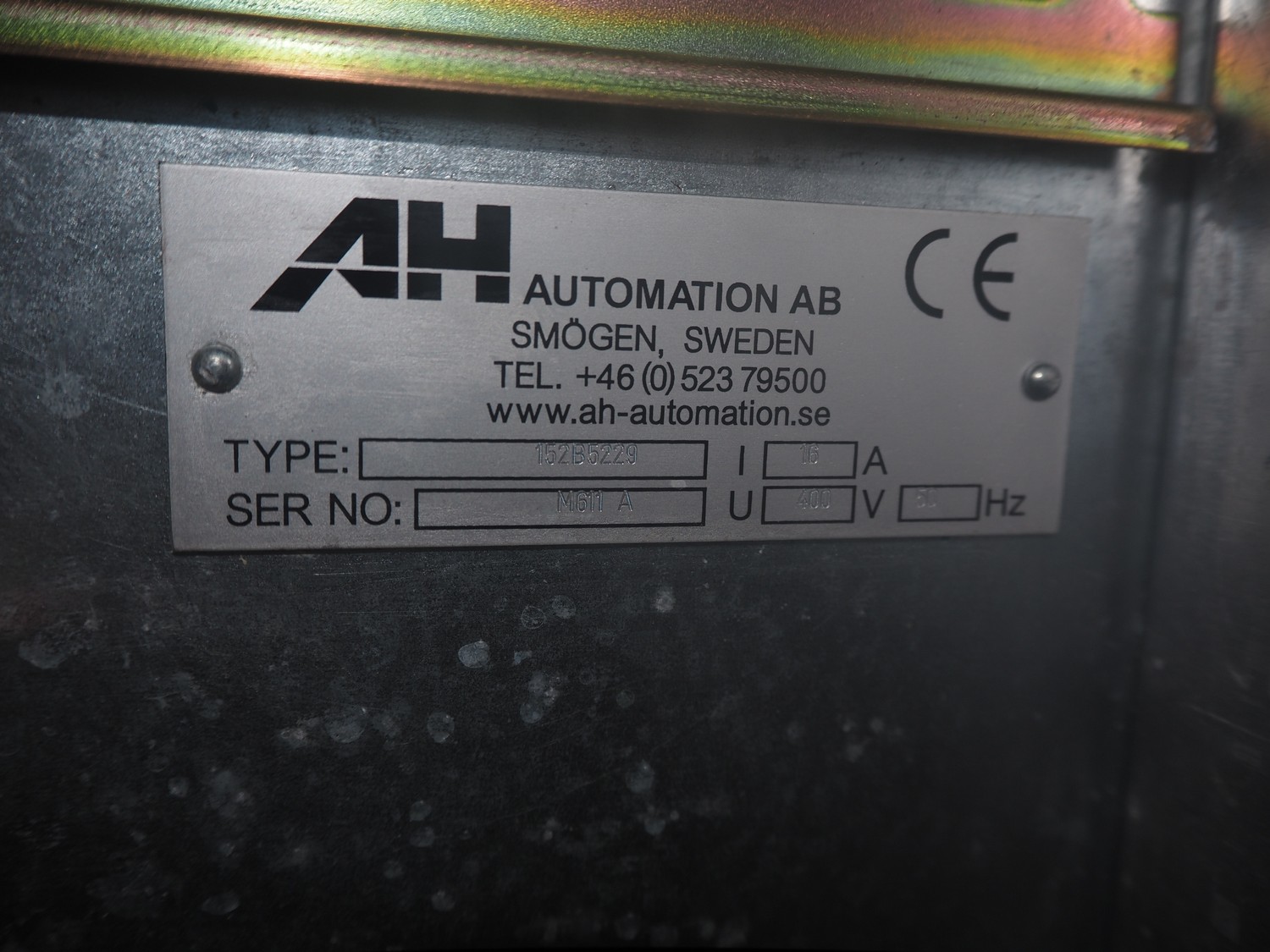 AH Automation AB breaker, type: 152B5229, serial number: M611 A, 400 V, 50 Hz, 16 A, dimensions: 1030 mm x 900 mm x 1770 mm. Incomplete, technical condition unknown.