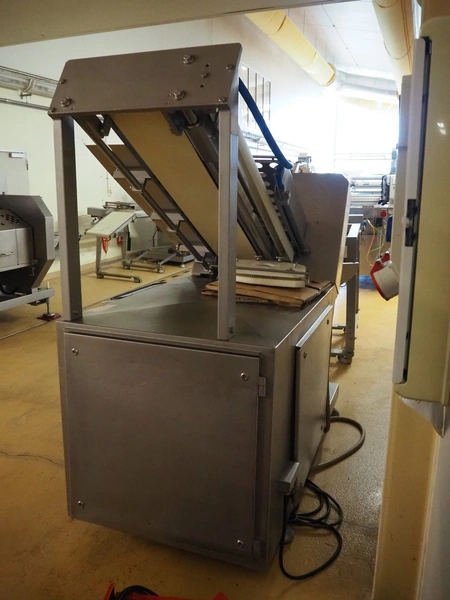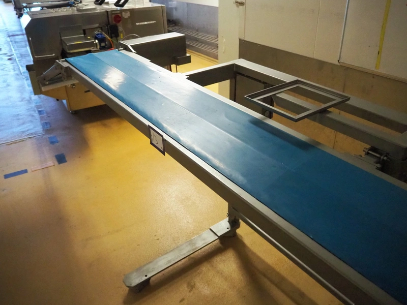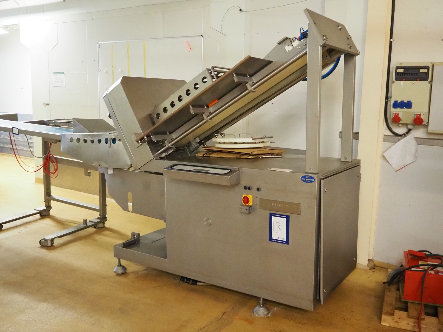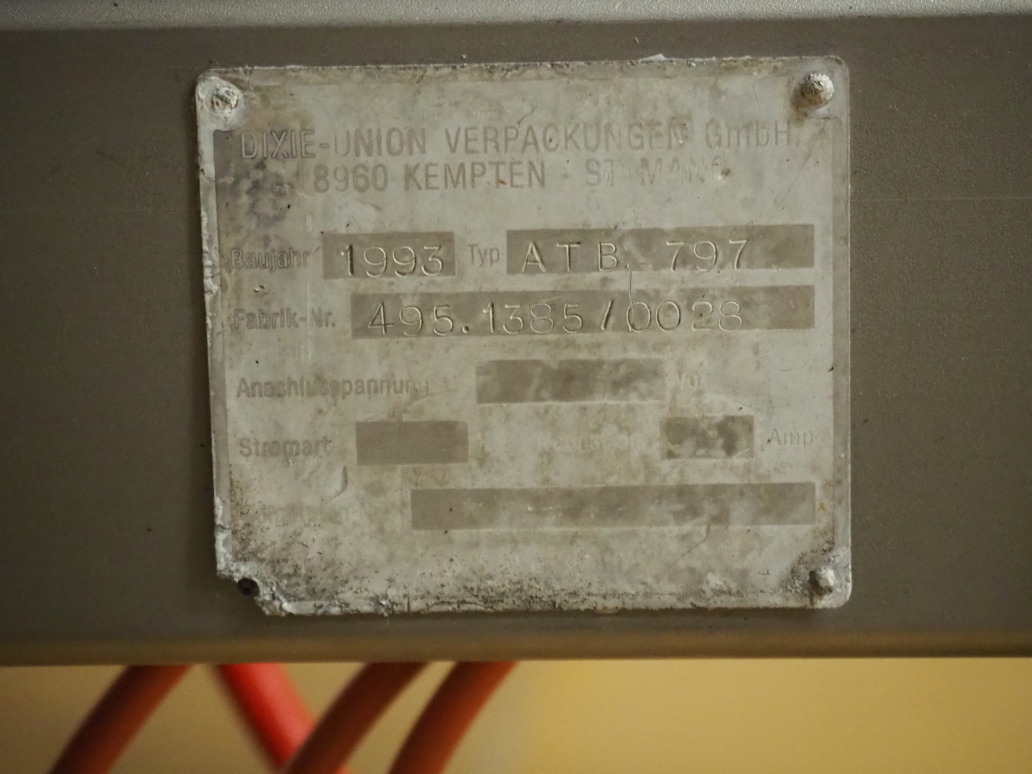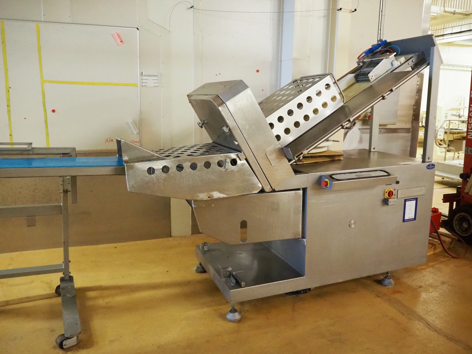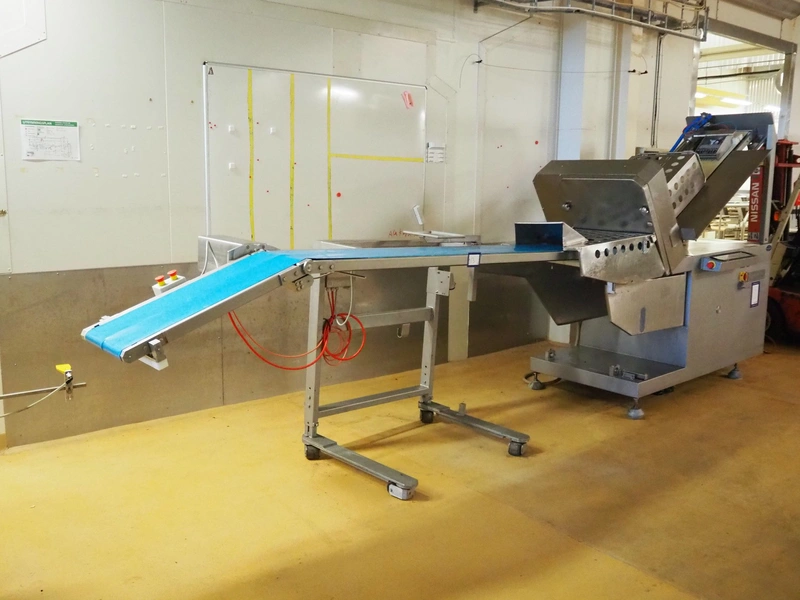 Dixie Union slicer with outfeed belt, type slicer: SL 495, year of construction: 1993, 380 V, 3 Ph, 50 Hz, 12 A, plastic belt, belt width: 270 mm, dimensions slicer: 2600 mm x 1100 mm x 2100 mm, Dixie Union outfeed belt, type: ATB 797, fabrication number: 495.1385/0028, year of construction: 1993, plastic belt, belt width: 300 mm, dimensions outfeed belt: 3650 mm x 900 mm x 1240 mm.