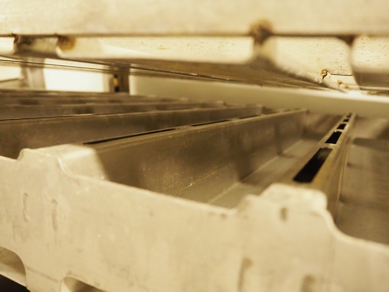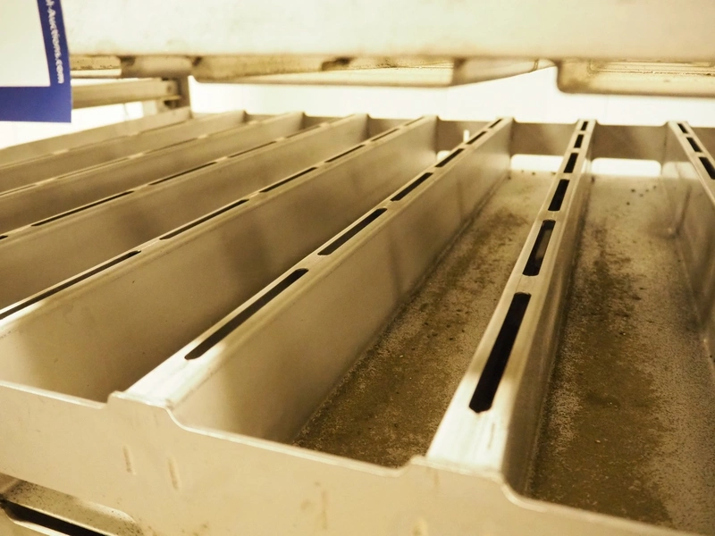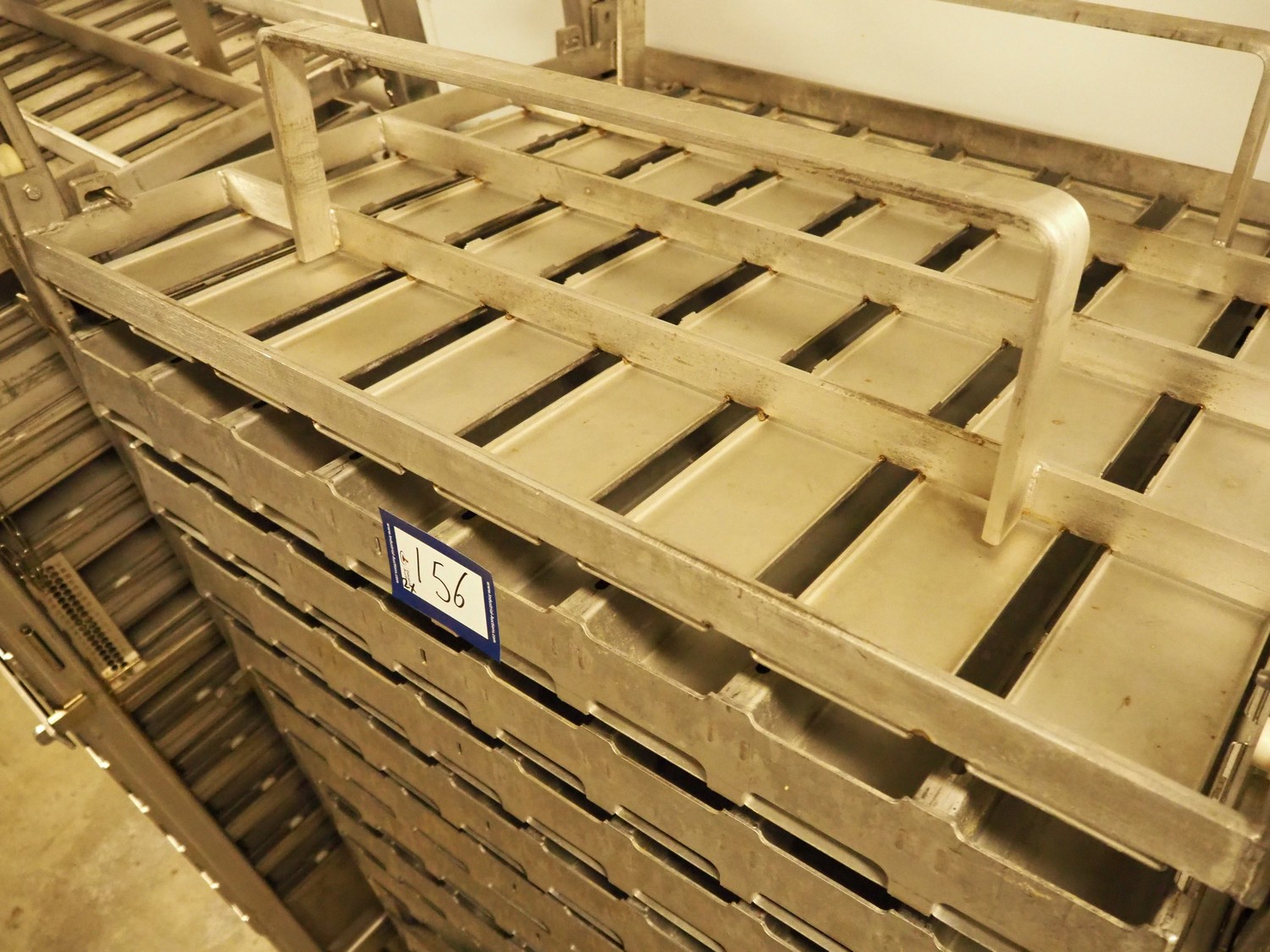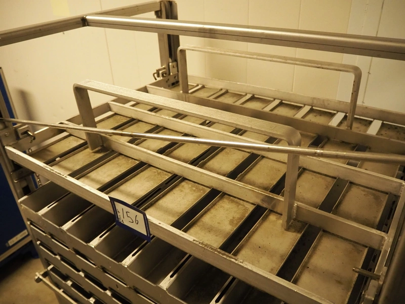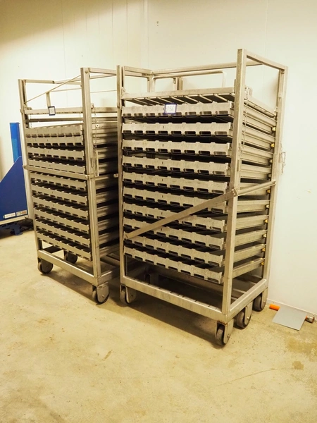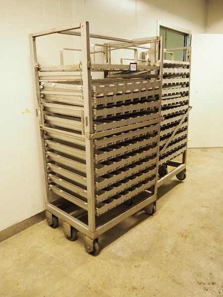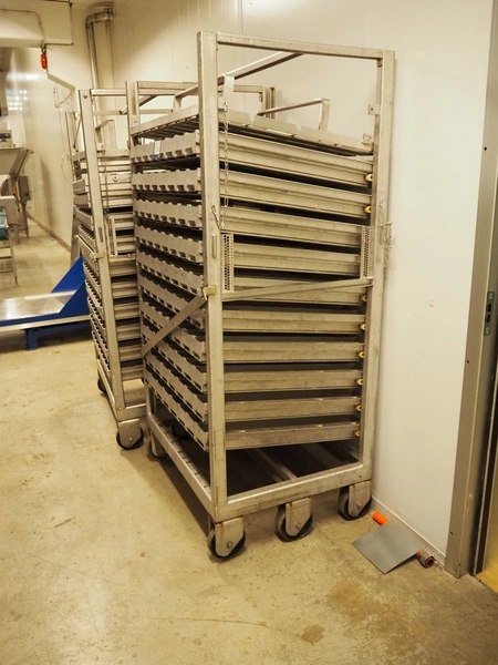 2 s/s trolleys with approximately 20 forms for salmon, dimensions each form: (8x) 750 mm x 90 mm x 70 mm, dimensions trolleys: (3x) 1000 mm x 800 mm x 1930 mm.