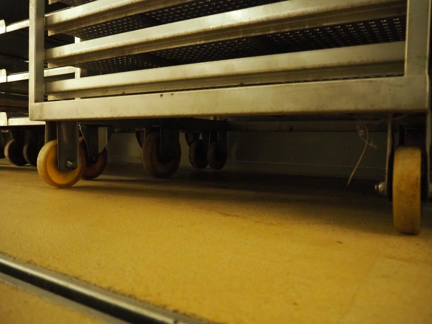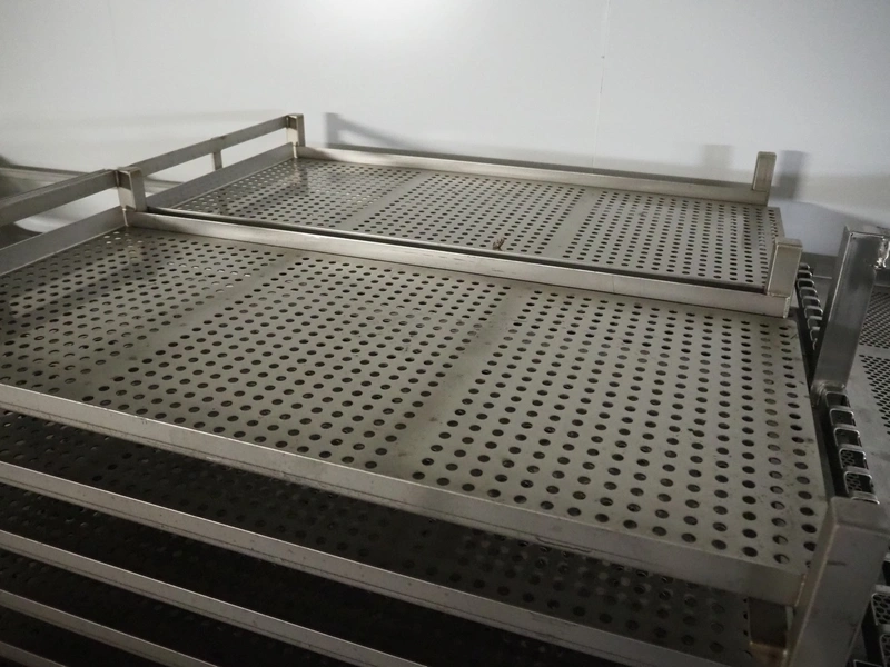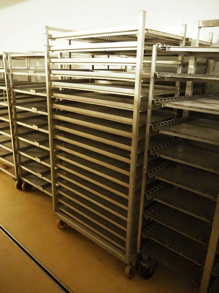 S/s smoke trolley, 18 perforated floors, perforations: Ø 10 mm, floor dimensions: 1020 mm x 990 mm, distance between floors: 70 mm, total dimensions: 1070 mm x 980 mm x 1960 mm.