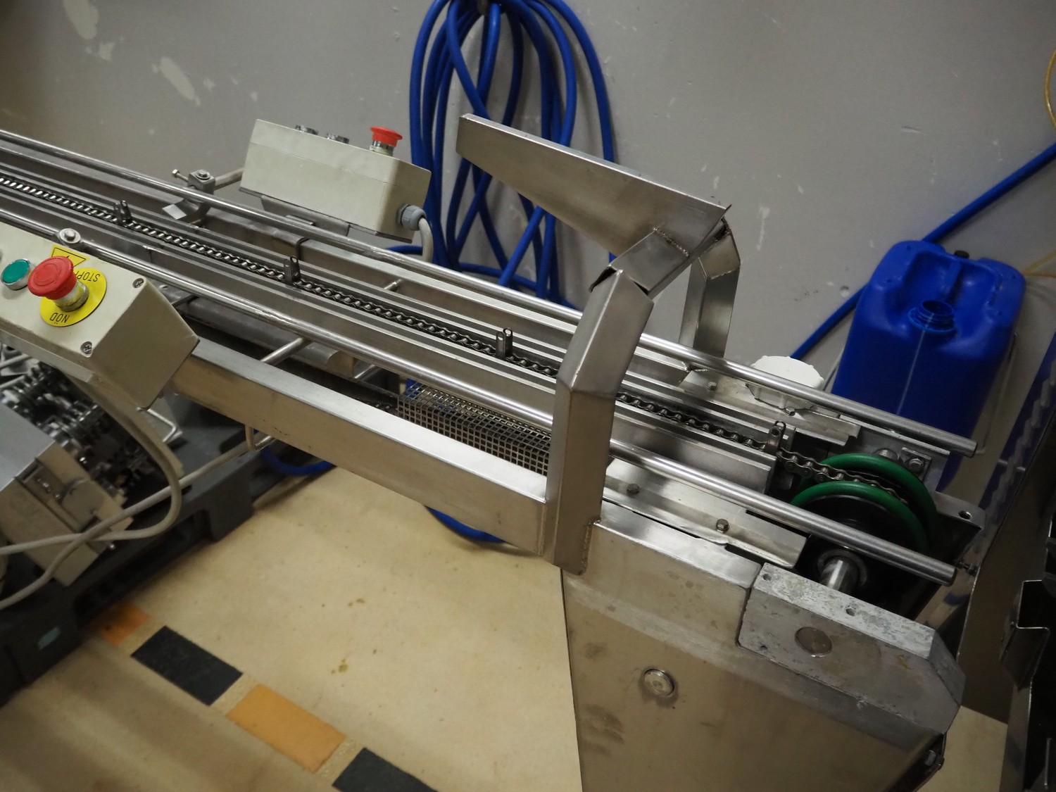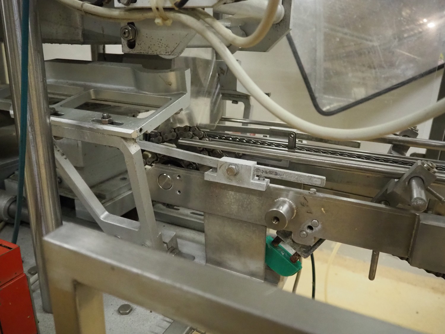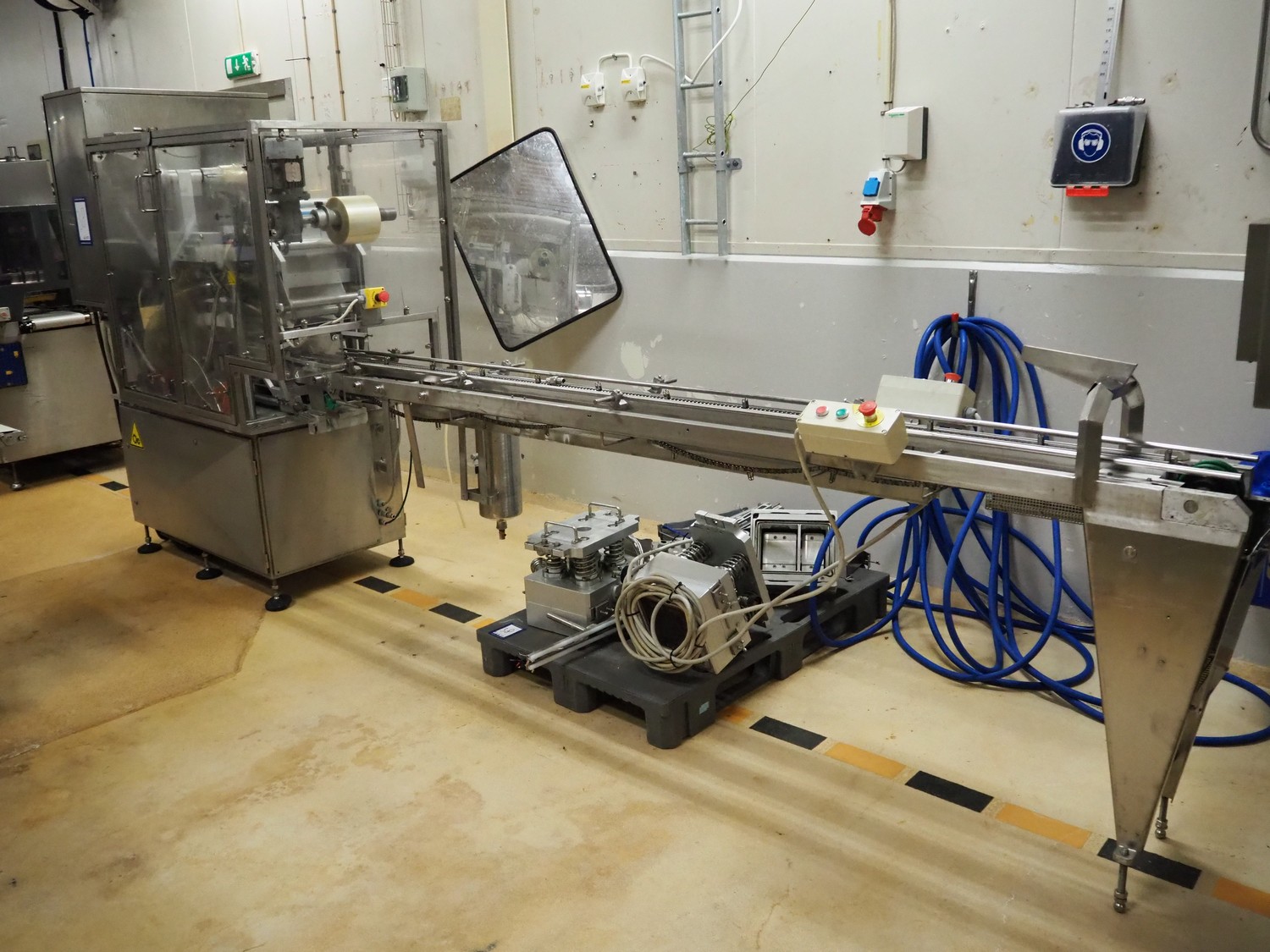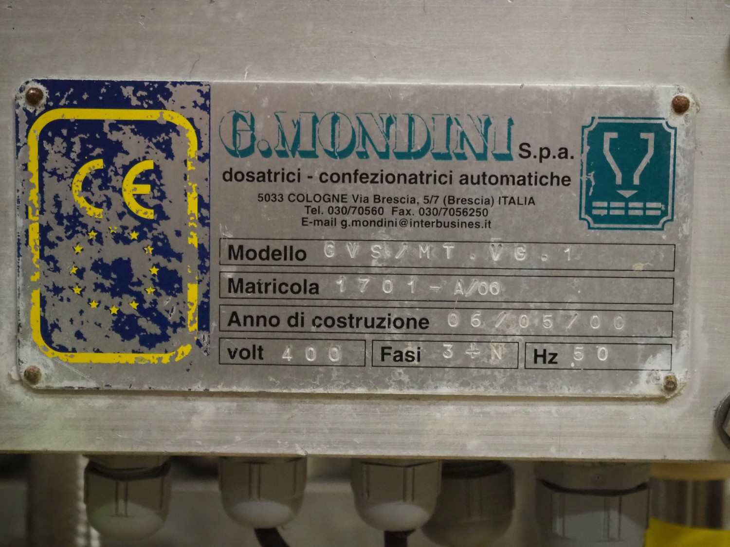 G. Mondini S.p.A. traysealer, model: GVS/MT.VG.1, serial number: 1701-A/00, year of construction: 06/05/00, 400 V, 3 Ph, 50 Hz, diameter cups: 140 mm, plastic belt, belt width: 240 mm, total dimensions: 3300 mm x 900 mm x 2650. Including pallet with extra dye sets.