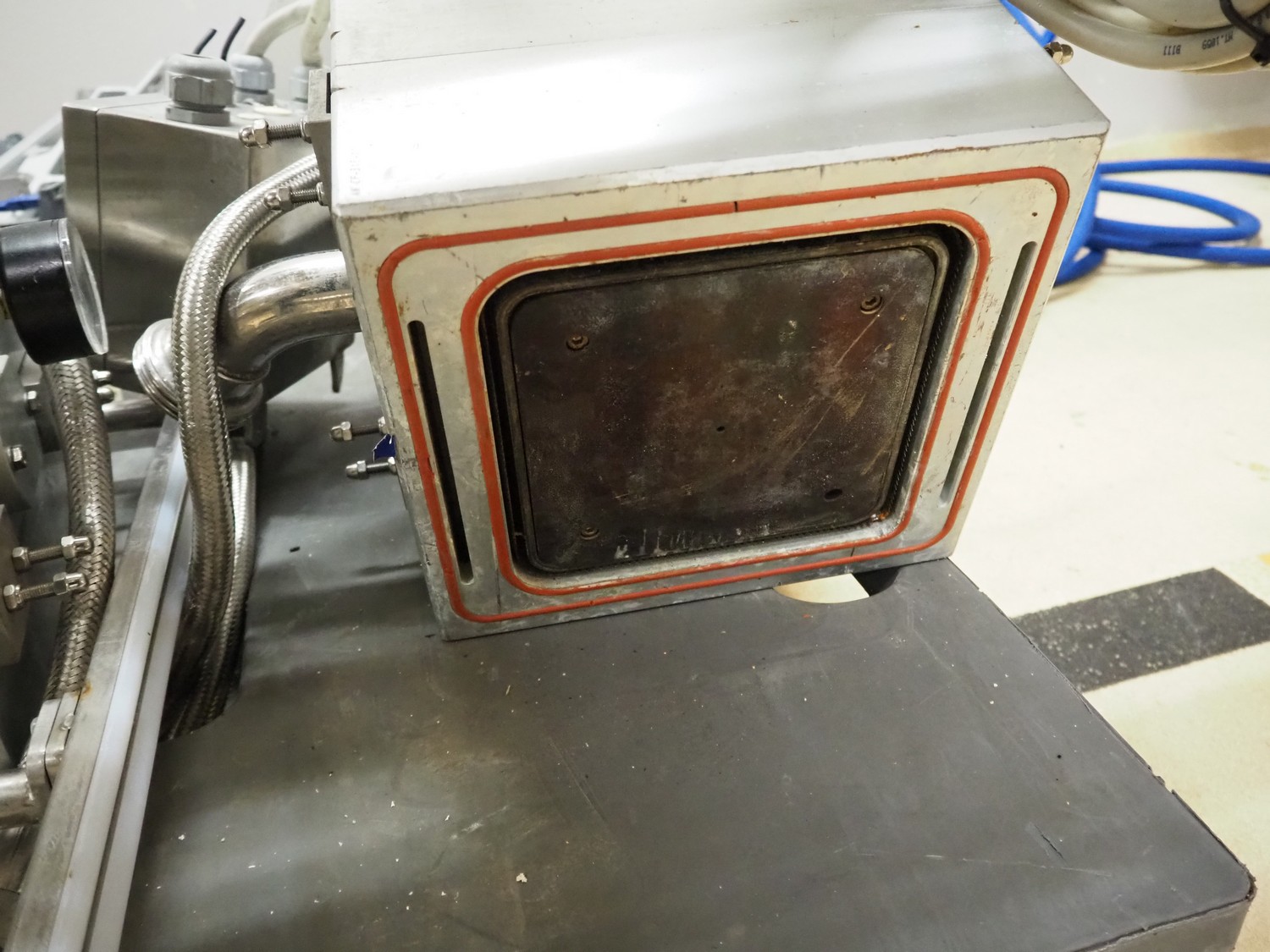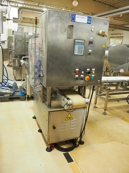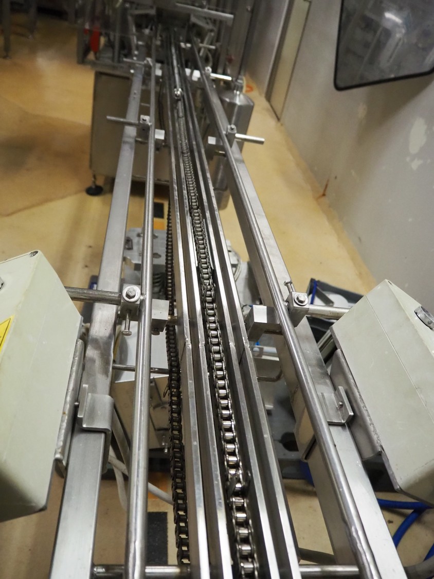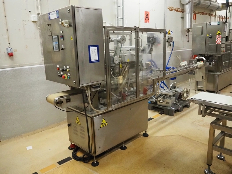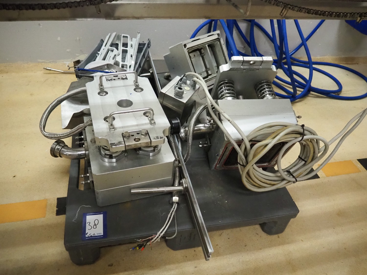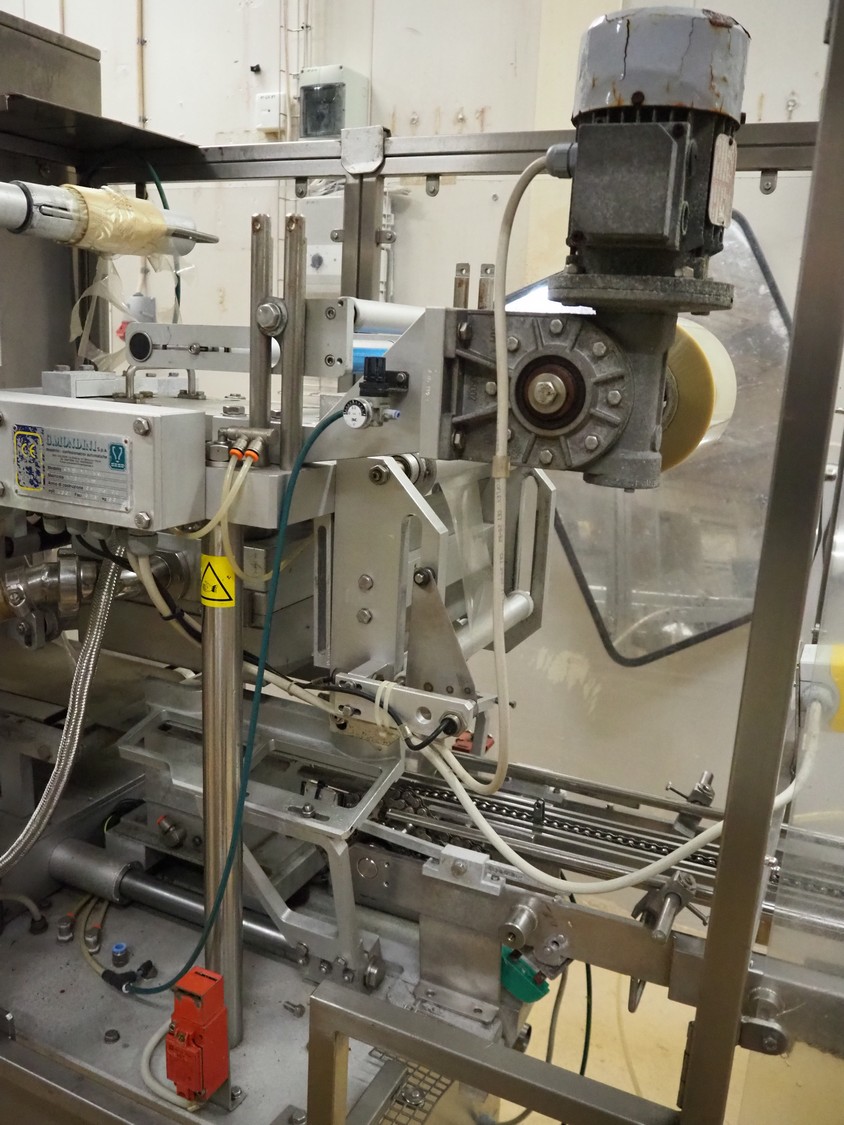 G. Mondini S.p.A. traysealer, model: GVS/MT.VG.1, serial number: 1701-A/00, year of construction: 06/05/00, 400 V, 3 Ph, 50 Hz, diameter cups: 140 mm, plastic belt, belt width: 240 mm, total dimensions: 3300 mm x 900 mm x 2650. Including pallet with extra dye sets.