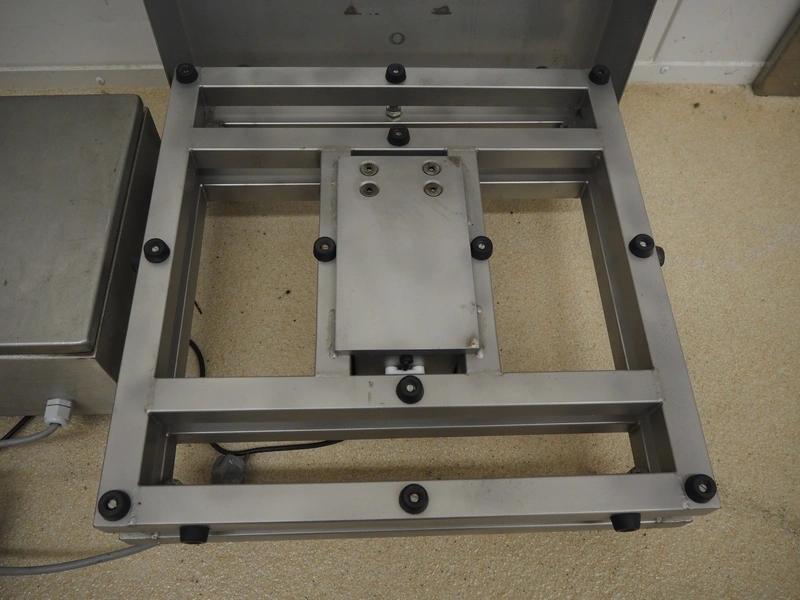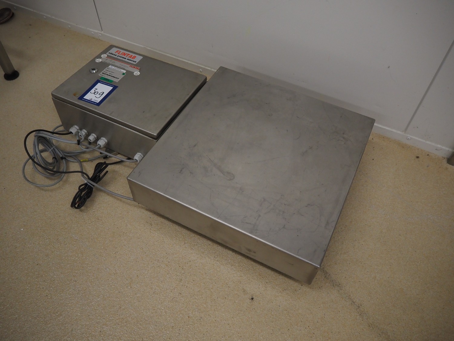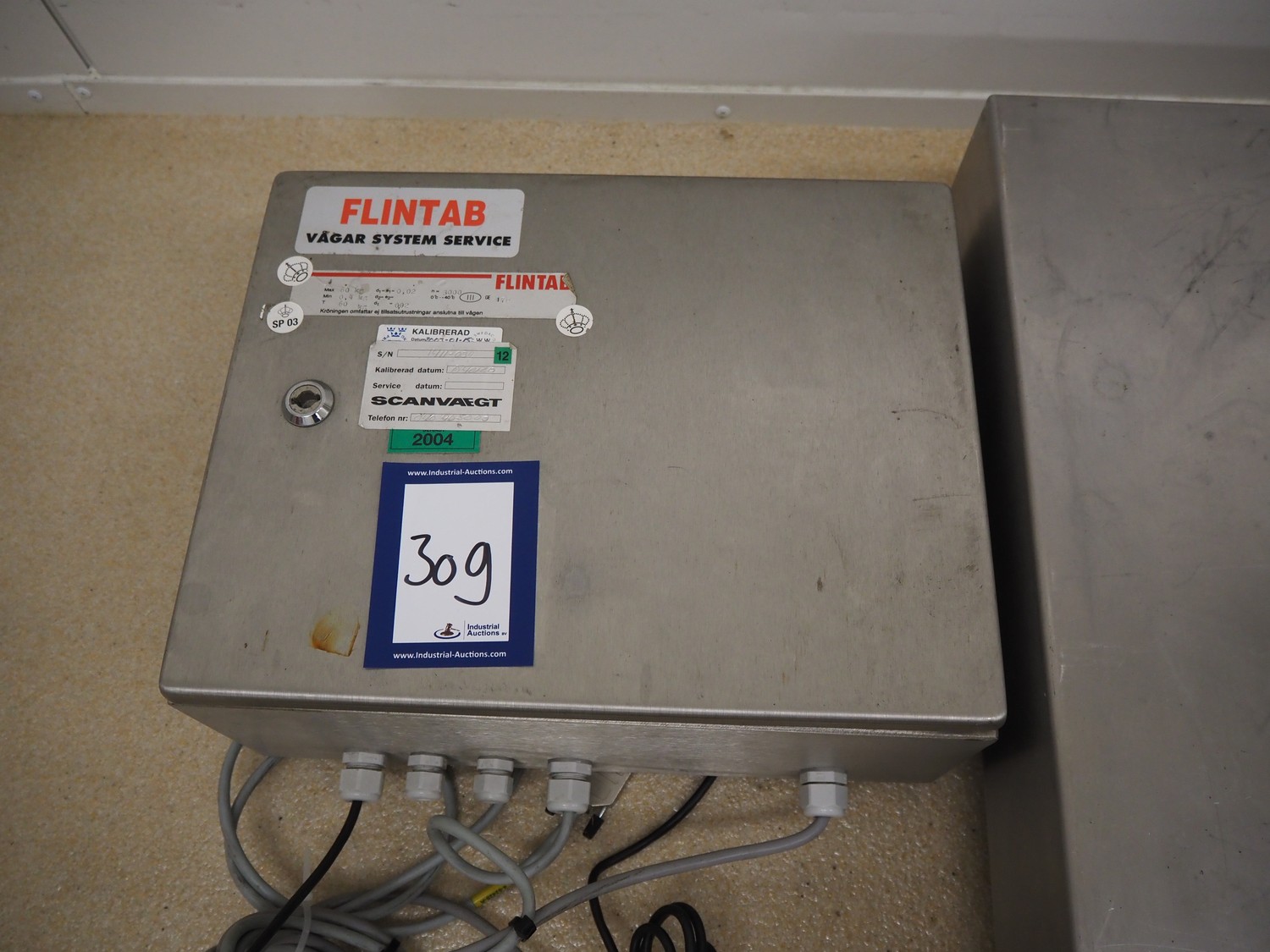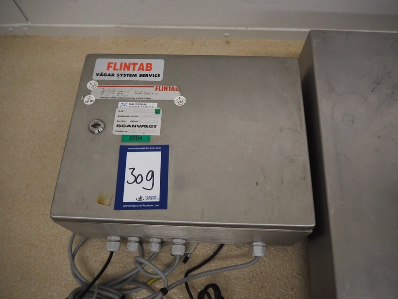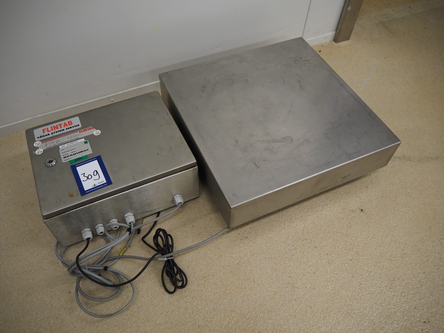 Scanvaegt/Flintab weighing scale with indicator, serial number: 1411-031, maximum weight: 60 kg, minimum weight: 0.4 kg, d=e= 0.2 kg, T=-60 kg, dimensions: 500 mm x 500 mm x 350 mm.