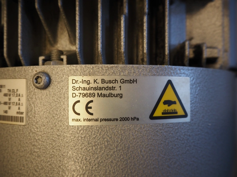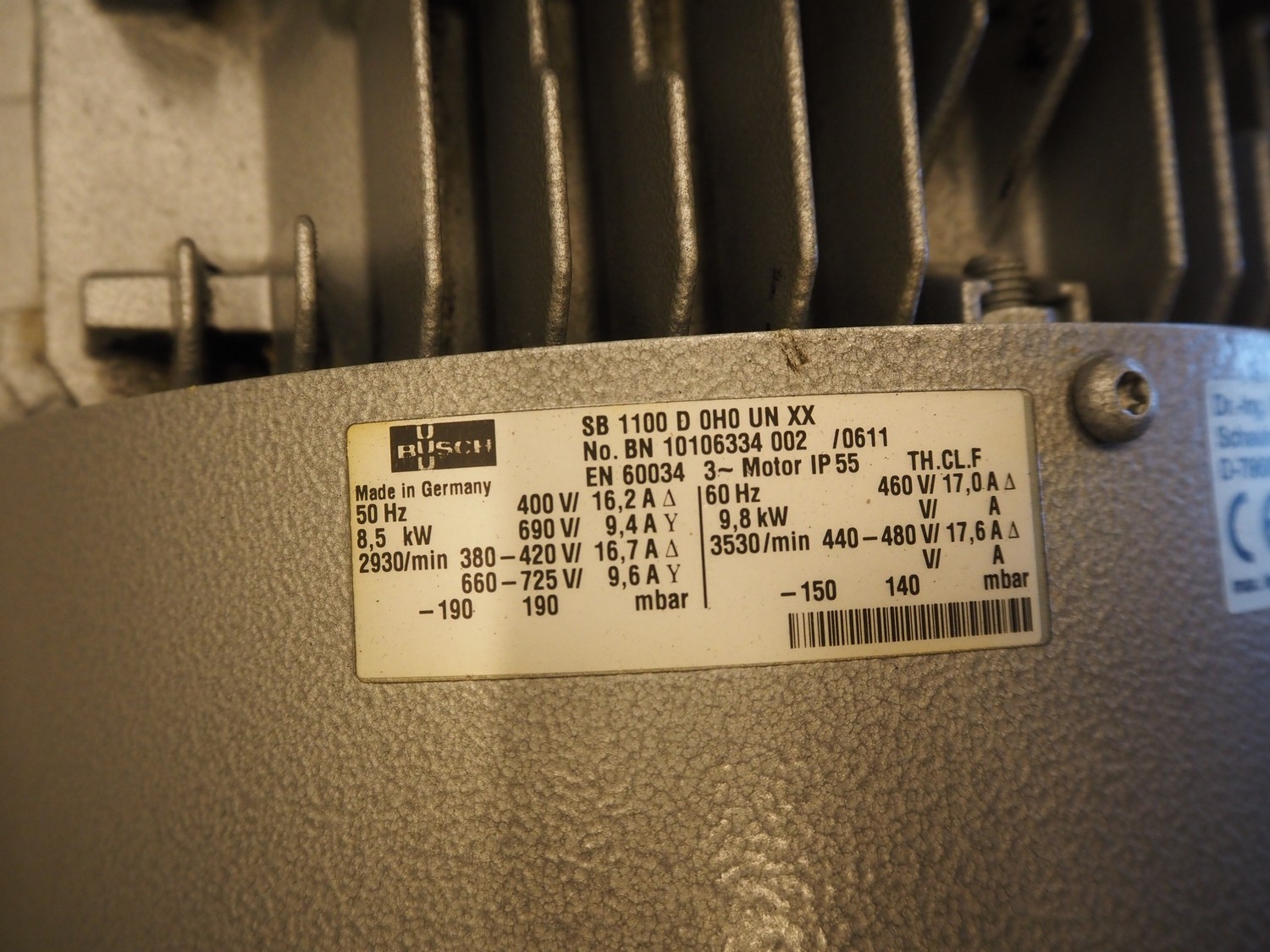 Busch side channel pressure/vacuum pump, model: SB 1100 D 0H0 UN XX, number: BN 10106334 002 /0611, 400-460 V, 3 Ph, 50-60 Hz, 16.2-17.0 A, 8.5-98 kW, dimensions: 1150 mm x 600 mm x 900 mm.
