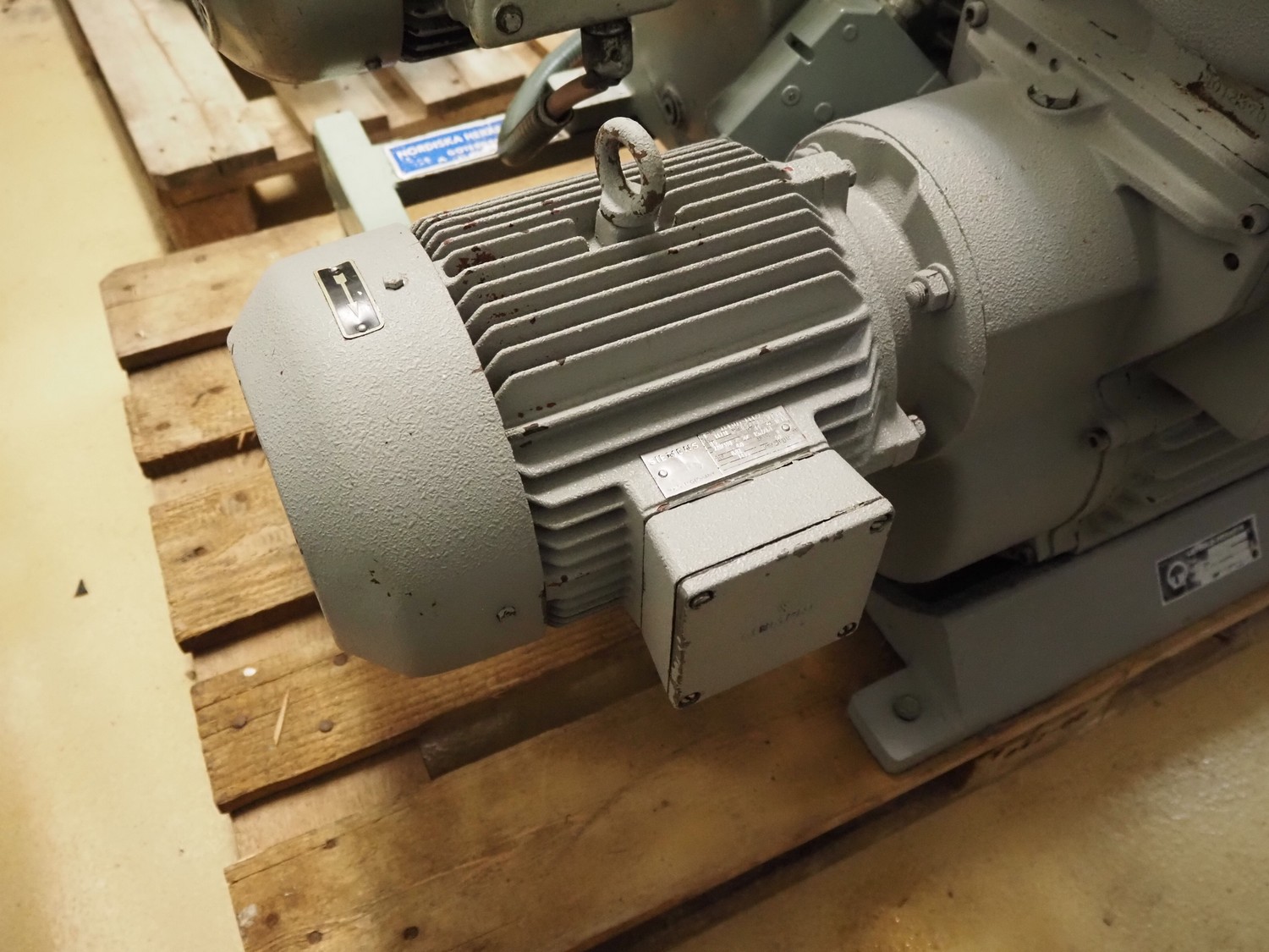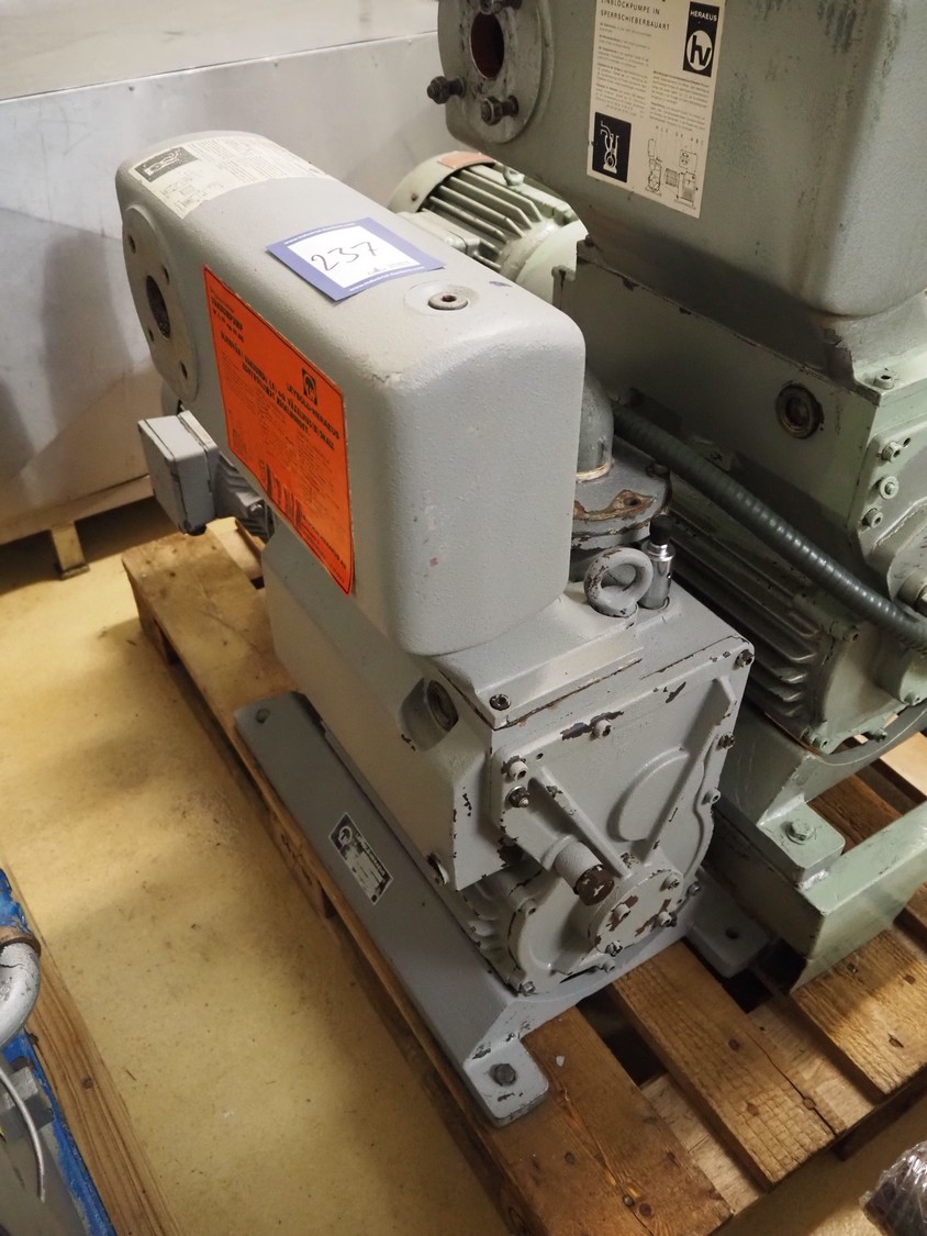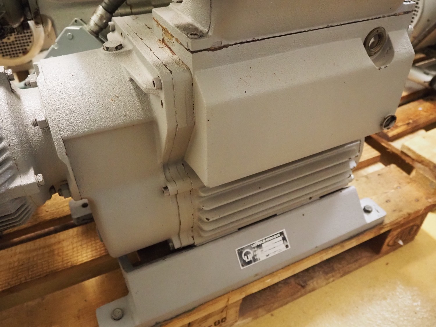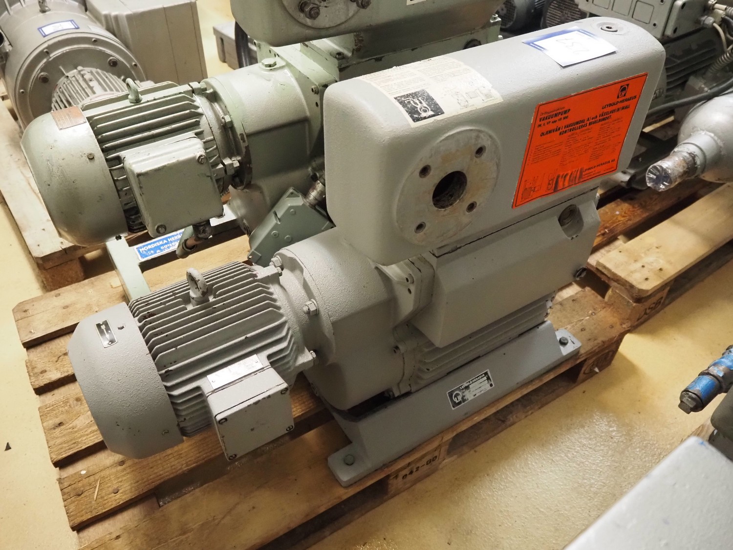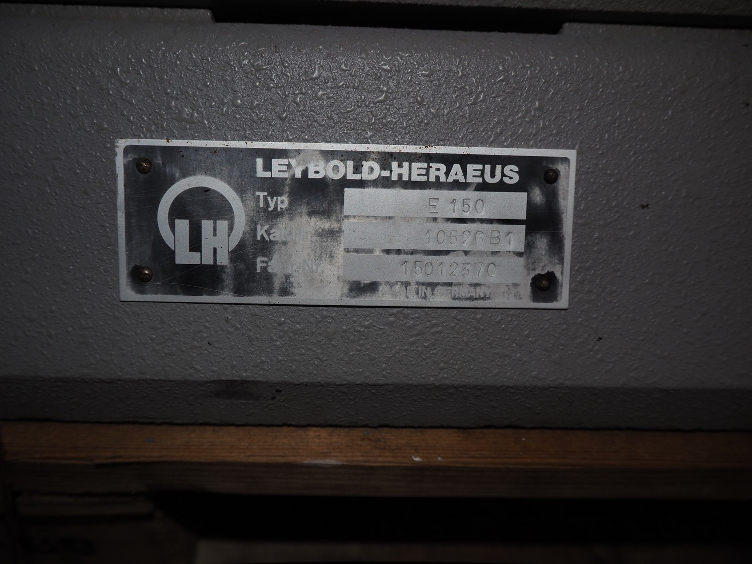 Leybold-Heraeus vacuum pump, type: E150, fabrication number: 15012370, capacity: 150 m³/hour, dimensions: 900 mm x 300 mm x 730 mm.