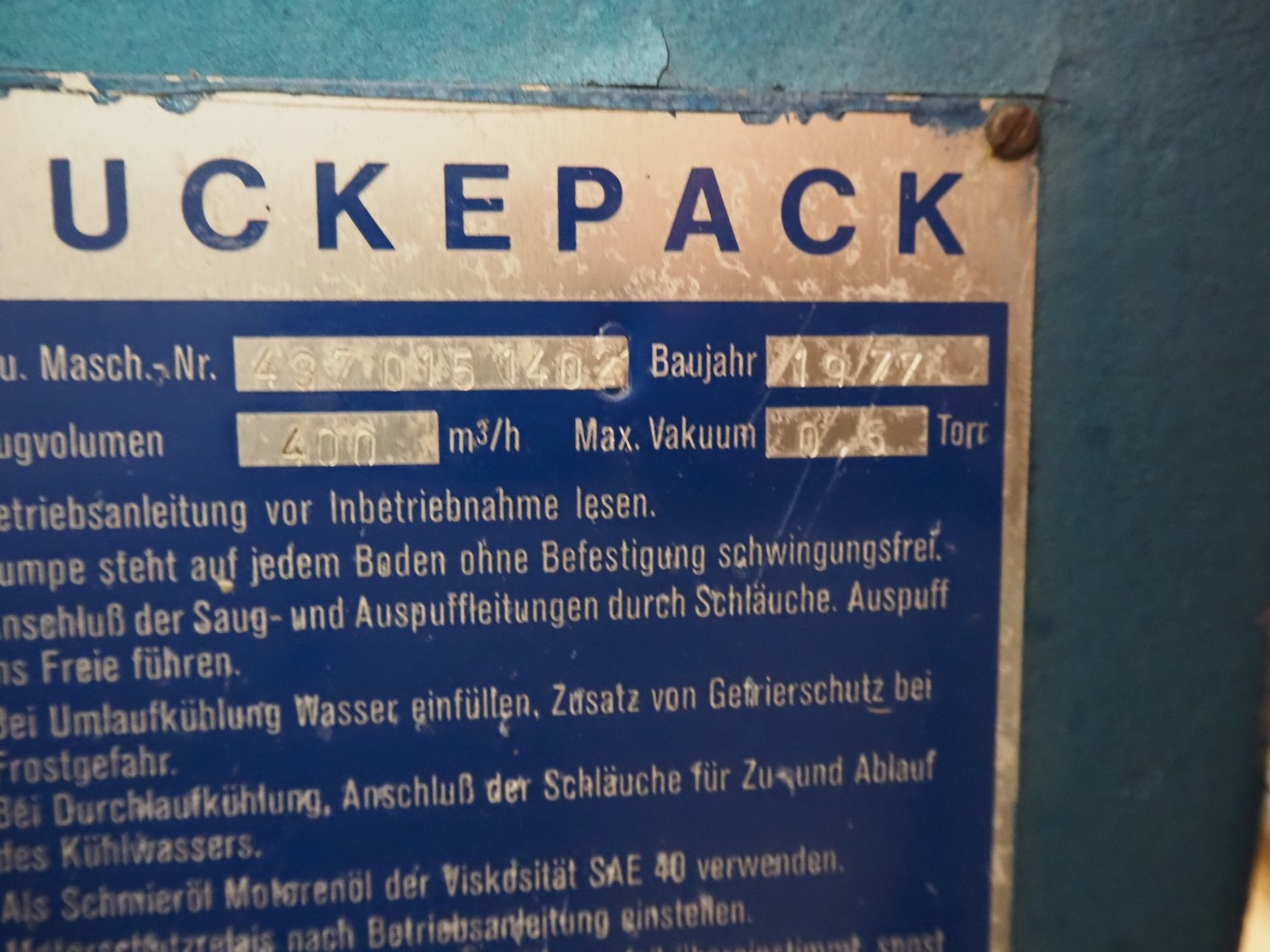 Huckepack vacuum pump, type: 437 015 140, year of construction: 1977, capacity: 400 m³/hour, dimensions: 1400 mm x 700 mm x 900 mm.