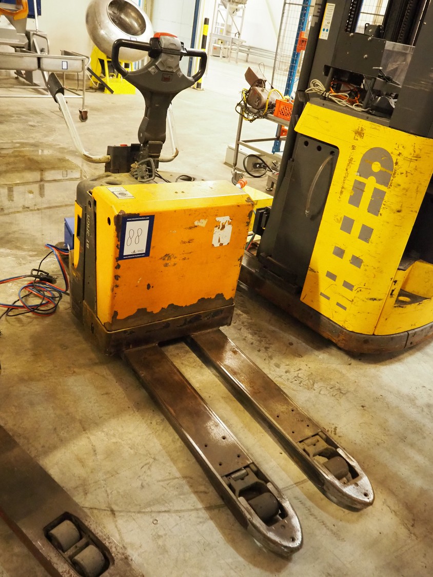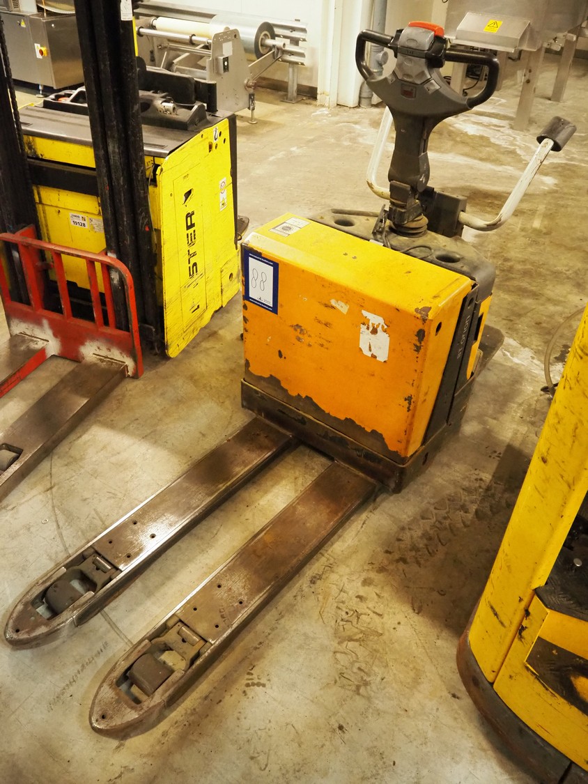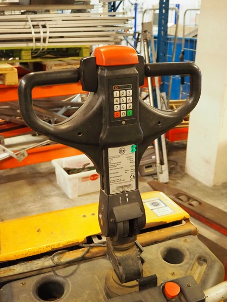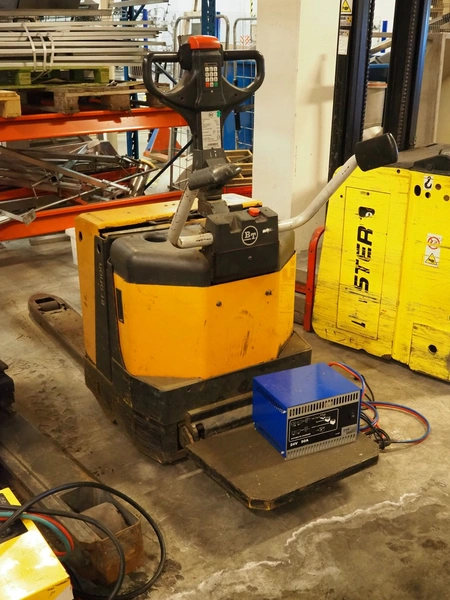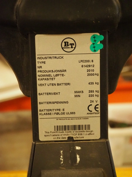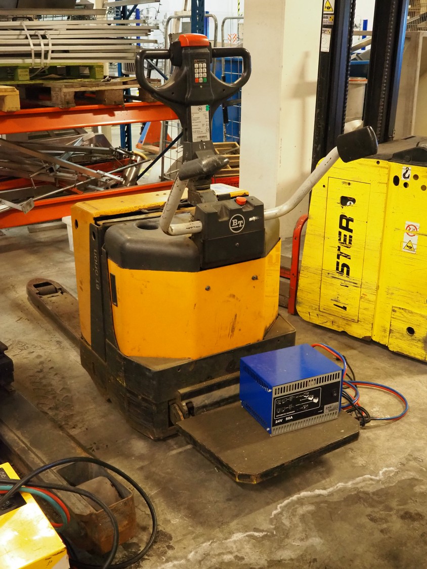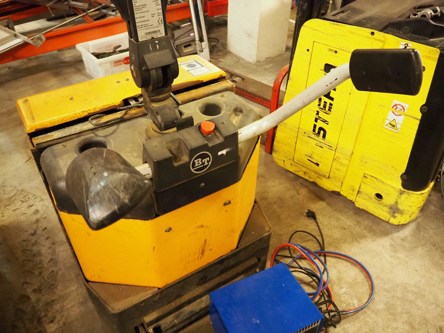BT electric pallet lifter, type: LPE200/8, number: 6142912, year of construction: 2010, capacity: 2000 kg, weight: 720 kg, fork length: (2x) 1150 mm, total dimensions: 1950 mm x 730 mm x 1500 mm. Including GNB battery charger.