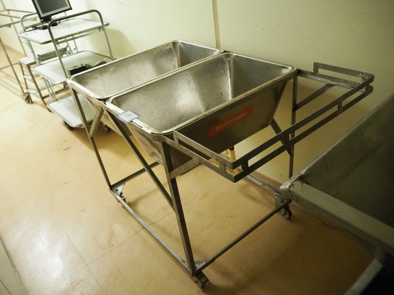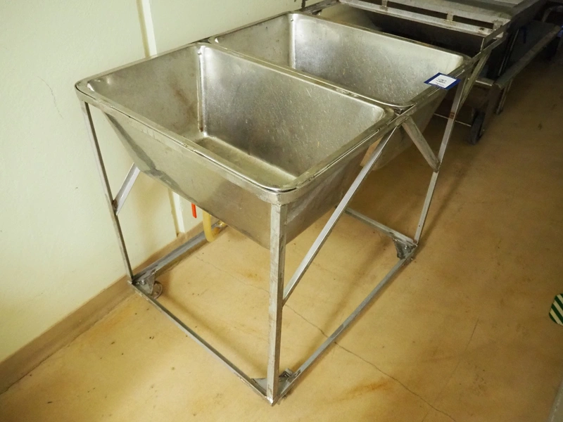 S/s trolley with two sinks, dimensions sink: (2x) 800 mm x 500 mm x 350 mm, total dimensions: 1350 mm x 800 mm x 950 mm.